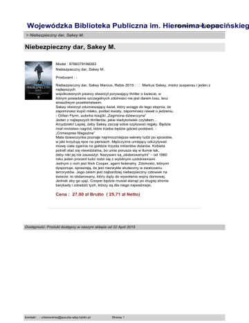 Utworzono : 04Łopacińskieg March 2017 Wojewódzka Biblioteka Publiczna im. Hieronima > Niebezpieczny dar, Sakey M. Niebezpieczny dar, Sakey M. Model : 9788378186083 Niebezpieczny dar, Sakey M. Producent : Niebezpieczny dar, Sakey Marcus, Rebis 2015�� Markus Sakey, mistrz suspensu i jeden z najlepszych współczesnych pisarzy stworzył porywający thriller o świecie, w którym posiadanie szczególnych zdolności nie jest darem losu, lecz straszliwym przekleństwem. Sakey stworzył zdumiewający świat, który wciąga do tego stopnia, że zapominasz kupić mleko, podlać kwiaty, zapominasz nawet o jedzeniu. - Gillian Flynn, autorka książki „Zaginiona dziewczyna” Jeden z najlepszych thrillerów, jakie kiedykolwiek czytałem… Arcydzieło! Lepiej, żeby Sakey zaczął sobie szykować regały. Będzie miał mnóstwo nagród, które trzeba będzie gdzieś postawić. „Crimespree Magazine” Mała dziewczynka poznaje najmroczniejsze sekrety ludzi po sposobie, w jaki krzyżują ręce na piersiach. Mężczyzna umiejący odczytywać mowę ciała zgarnia na giełdzie trzysta miliardów dolarów. Kobieta potrafi stać się niewidzialna, bo umie porusza się w tłumie tak, żeby nikt jej nie zauważył. Nazywani są „obdarowanymi” – od 1980 roku jeden procent ludzi rodzi się z wybitnymi uzdolnieniami. Jednym z nich jest Nick Cooper, agent federalny. Zdolności, którymi dysponuje, sprawiają, że jest niezwykle skuteczny w zwalczaniu terrorystów. Jego celem jest najbardziej niebezpieczny człowiek na świecie: to obdarowany, który dąży do wywołania wojny domowej. Jednak aby go ująć, Cooper będzie musiał stanąć po drugiej stronie barykady i zdradzić tych, którzy są dla niego najważniejsi. Cena : 27,00 zł Brutto ( 25,71 zł Netto) Dostępność: Produkt dostępny w naszym sklepie od 22 April 2015 kontakt : - [email protected] Strona 1