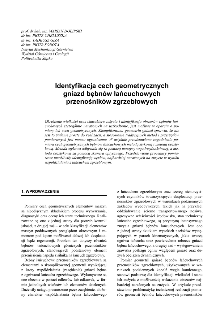 prof. dr hab. inż. MARIAN DOLIPSKI dr inż. PIOTR CHELUSZKA dr inż. TADEUSZ GIZA dr inż. PIOTR SOBOTA Instytut Mechanizacji Górnictwa Wydział Górnictwa i Geologii Politechnika Śląska Identyfikacja cech geometrycznych gniazd bębnów łańcuchowych przenośników zgrzebłowych Określenie wielkości oraz charakteru zużycia i identyfikacja obszarów bębnów łańcuchowych szczególnie narażonych na uszkodzenie, jest możliwe w oparciu o pomiary ich cech geometrycznych. Skomplikowana geometria gniazd sprawia, że nie jest to zadanie proste do realizacji, a stosowanie tradycyjnych metod i przyrządów pomiarowych jest mocno ograniczone. W artykule przedstawiono zagadnienie pomiaru cech geometrycznych bębnów łańcuchowych metodą stykową i metodą bezstykową. Metoda stykowa odbywała się za pomocą maszyny współrzędnościowej, a metoda bezstykowa za pomocą skanera optycznego. Przedstawione procedury pomiarowe umożliwiły identyfikację węzłów, najbardziej narażonych na zużycie w wyniku współdziałania z łańcuchem zgrzebłowym. 1. WPROWADZENIE Pomiary cech geometrycznych elementów maszyn są nieodłącznym składnikiem procesu wytwarzania, diagnostyki oraz oceny ich stanu technicznego. Realizowane są one z jednej strony dla potrzeb kontroli jakości, z drugiej zaś – w celu klasyfikacji elementów maszyn poddawanych przeglądom okresowym i remontom pod kątem możliwości dalszej ich eksploatacji bądź regeneracji. Problem ten dotyczy również bębnów łańcuchowych górniczych przenośników zgrzebłowych, stanowiących podstawowy element przeniesienia napędu z silnika na łańcuch zgrzebłowy. Bębny łańcuchowe przenośników zgrzebłowych są elementami o skomplikowanej geometrii wynikającej z istoty współdziałania (zazębienia) gniazd bębna z ogniwami łańcucha zgrzebłowego. Wykonywane są one obecnie w postaci odlewów lub odkuwek, w formie jednolitych wieńców lub elementów dzielonych. Duże siły uciągu przenoszone przez zazębienie, złożony charakter współdziałania bębna łańcuchowego z łańcuchem zgrzebłowym oraz szereg niekorzystnych czynników towarzyszących eksploatacji przenośników zgrzebłowych w warunkach podziemnych zakładów wydobywczych, takich jak na przykład: oddziaływanie ścierne transportowanego nosiwa, agresywne właściwości środowiska, stan techniczny łańcucha zgrzebłowego, są przyczyną intensywnego zużycia gniazd bębnów łańcuchowych. Jest ono z jednej strony skutkiem wysokich nacisków występujących w parach kinematycznych, jakie tworzą ogniwa łańcucha oraz powierzchnie robocze gniazd bębna łańcuchowego, z drugiej zaś – występowaniem zjawiska poślizgu ogniw względem gniazd oraz dużych obciążeń dynamicznych. Pomiar geometrii gniazd bębnów łańcuchowych przenośników zgrzebłowych, użytkowanych w warunkach podziemnych kopalń węgla kamiennego, stanowi podstawę dla identyfikacji wielkości i stanu ich zużycia z możliwością wskazania obszarów najbardziej narażonych na zużycie. W artykule przedstawiono problematykę technicznej realizacji pomiarów geometrii bębnów łańcuchowych przenośników 18 MECHANIZACJA I AUTOMATYZACJA GÓRNICTWA zgrzebłowych. Omówiono przy tym procedury realizacji tego rodzaju pomiarów dwoma metodami – stykową oraz bezstykową. Wykorzystane one zostały w pomiarach bębnów łańcuchowych dla potrzeb identyfikacji węzłów, najbardziej narażonych na zużycie w wyniku współdziałania z łańcuchem zgrzebłowym. Skanery stykowe charakteryzują się tym, że pomiaru skanowanego obiektu dokonuje się za pomocą głowicy, która przemieszcza się po jego powierzchni, będąc z nią w bezpośrednim kontakcie. Podstawowymi urządzeniami tego typu są ramiona pomiarowe i maszyny współrzędnościowe z głowicami skanującymi (skaningowymi). Głównymi przedstawicielami skanerów bezstykowych są skanery optyczne. Zalicza się do nich skanery laserowe oraz prążkowe. W tej technice pomiarowej wykorzystuje się efekt zniekształcenia promienia światła oświetlającego powierzchnię skanowaną (pomiarową). Skanery laserowe wykorzystują pojedynczy prążek lasera, co w konsekwencji powoduje, że w trakcie jednej sekwencji pomiaru otrzymujemy dane jednego punktu pomiarowego (jeden piksel kamery). W skanerach prążkowych (światła strukturalnego) przedmiot badany oświetlany jest z rzutnika zestawem linii światła najczęściej białego o znanej strukturze. Linie proste ulegają zniekształceniu proporcjonalnie do wielkości deformacji powierzchni mierzonego obiektu. Do zebrania obrazu obiektu z liniami struktury projektowanego na niego światła używa się sensorów, zazwyczaj kamer CCD. Aktywny skaner optyczny uzyskuje informacje o położeniu i kształcie obiektu na postawie triangulacji [1]. Przechwytywany przez kamerę obraz analizowany jest w komputerze. Rekonstrukcja obiektu polega na odtworzeniu głębokości oraz powierzchni. Wynikiem jest zbiór punktów (chmura punktów) w globalnym układzie współrzędnych. Rekonstrukcja powierzchni polega na dopasowaniu powierzchni do odtworzonej chmury punktów, w efekcie czego uzyskuje się trójwymiarowy model powierzchni obiektu. W miejscach, 2. PRZEGLĄD METOD POMIAROWYCH WIELKOŚCI GEOMETRYCZNYCH Złożone postacie konstrukcyjne elementów maszyn, urządzeń i ustrojów nośnych ograniczają możliwość stosowania tradycyjnych metod i przyrządów pomiarowych. Ograniczenia te wynikają między innymi z trudności lub wręcz niemożności dokładnego (jednoznacznego) określenia położenia przestrzennego punktów pomiarowych oraz wzajemnych relacji pomiędzy otrzymanymi z pomiarów danymi. Dokładne odwzorowanie przestrzenne mierzonych obiektów ma istotne znaczenie na etapie wykonania, eksploatacji oraz projektowania, a także dla celów poznawczych i naukowych. Pomiary takie można wykonać z zastosowaniem przestrzennych urządzeń skanujących – skanerów 3D. Wyróżnić 