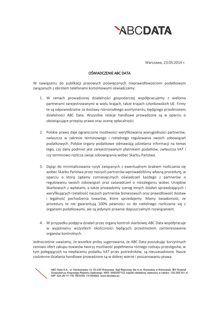 Warszawa, 23.05.2014 r. OŚWIADCZENIE ABC DATA W nawiązaniu do publikacji prasowych poświęconych nieprawidłowościom podatkowym związanych z obrotem telefonami komórkowymi oświadczamy: 1. W ramach prowadzonej działalności gospodarczej współpracujemy z wieloma partnerami zarejestrowanymi w wielu krajach, także krajach członkowskich UE. Firmy te są odpowiedzialne za dostawy różnorodnego asortymentu, będącego przedmiotem działalności ABC Data. Wszystkie relacje handlowe prowadzone są w oparciu o obowiązujące przepisy prawa oraz ocenę opłacalności. 2. Polskie prawo daje ograniczone możliwości weryfikowania wiarygodności partnerów, zwłaszcza w zakresie terminowego i rzetelnego regulowania swoich zobowiązań podatkowych. Polskie organy podatkowe odmawiają udzielania informacji na temat tego, czy dany podmiot jest zarejestrowanym płatnikiem podatków, zwłaszcza VAT i czy terminowo rozlicza swoje zobowiązania wobec Skarbu Państwa. 3. Dążąc do minimalizowania ryzyk związanych z ewentualnym brakiem rozliczania się wobec Skarbu Państwa przez naszych partnerów wprowadziliśmy własną procedurę, w oparciu o którą żądamy comiesięcznych oświadczeń każdego z partnerów o regulowaniu swoich zobowiązań oraz zaświadczeń o niezaleganiu wobec Urzędów Skarbowych z wpłatami, a także prowadzimy szereg innych działań sprawdzających i weryfikujących rzetelność naszych partnerów biznesowych oraz prawidłowość dostaw i legalność pochodzenia towarów, które sprzedajemy. Mamy świadomość, że procedury te nie gwarantują 100% pewności co do rzetelnego rozliczania się z organami podatkowymi, ale są jedynym prawnie dopuszczalnym rozwiązaniem. 4. W przypadku podjęcia działań przez organy kontroli skarbowej ABC Data współpracuje w wyjaśnianiu wszystkich okoliczności będących przedmiotem zainteresowania organów kontrolnych. Jednocześnie uważamy, że wszelkie próby sugerowania, że ABC Data poszukując korzystnych cenowo ofert zakupu towarów tworzy możliwość popełnienia różnego rodzaju przestępstw, w tym polegających na niepłaceniu podatku VAT przez pośredników, są nieuzasadnione. Nasze codzienne działania handlowe prowadzone są w dobrej wierze i poszanowaniu prawa. ABC Data S.A., ul. Daniszewska 14, 03-230 Warszawa, Sąd Rejonowy dla m.st. Warszawy w Warszawie, XIII Wydział Gospodarczy Krajowego Rejestru Sądowego, KRS: 0000287132, kapitał zakładowy wpłacony w całości: 125.259.301 zł, NIP: 524-26-17-178, REGON: 141054682, www.abcdata.eu Występujące w niektórych publikacjach prasowych sugestie, jakoby ABC Data była beneficjentem procederu niepłacenia VAT przez inne podmioty, są próbą stosowania zasady zbiorowej odpowiedzialności za potencjalne czyny osób trzecich. Tak zwane korzystne cenowo oferty – czyli oferty o cenach odbiegających od cenników producentów - mają wiele różnych, legalnych źródeł. Wynikają one m.in. z promocji na lokalnych rynkach, preferencyjnych warunków handlowych dla operatorów telekomunikacyjnych, wyprzedaży, redukcji nadwyżek produkcyjnych, czy bankructw sieci sklepów. Wyszukiwanie tego typu ofert jest w tej branży czymś naturalnym i często stanowi o przewadze konkurencyjnej wśród hurtowników sprzętu elektronicznego. Na rynku występują oczywiście również inne, niezgodne z prawem próby sprzedaży towaru – na przykład pochodzącego z kradzieży, subsydiowanego przez operatorów z usuniętymi blokadami, towarów podrabianych i w różnoraki sposób łamiących prawa autorskie prawowitych właścicieli i producentów, produktów sprzedawanych jako nowe, a w istocie będących towarami pogwarancyjnymi (refurbished), powrotnie wprowadzanymi do obrotu, nie posiadających dopuszczenia do obrotu na terytorium Unii Europejskiej, potencjalnie niebezpiecznych, naruszających międzynarodowe umowy handlowe itd. W ABC Data istnieje jednak rozbudowany system procedur kontrolnych, praktycznie wykluczający możliwość zakupu tego rodzaju towarów. ABC Data S.A., ul. Daniszewska 14, 03-230 Warszawa, Sąd Rejonowy dla m.st. Warszawy w Warszawie, XIII Wydział Gospodarczy Krajowego Rejestru Sądowego, KRS: 0000287132, kapitał zakładowy wpłacony w całości: 125.259.301 zł, NIP: 524-26-17-178, REGON: 141054682, www.abcdata.eu