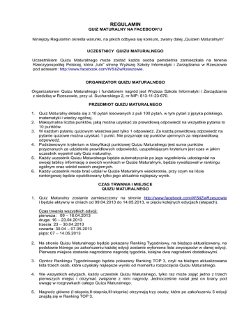 REGULAMIN QUIZ MATURALNY NA FACEBOOK’U Niniejszy Regulamin określa warunki, na jakich odbywa się konkurs, zwany dalej „Quizem Maturalnym” UCZESTNICY QUIZU MATURALNEGO Uczestnikiem Quizu Maturalnego może zostać każda osoba pełnoletnia zamieszkała na terenie Rzeczypospolitej Polskiej, która „lubi” stronę Wyższej Szkoły Informatyki i Zarządzania w Rzeszowie pod adresem: http://www.facebook.com/WSIiZwRzeszowie. ORGANIZATOR QUIZU MATURALNEGO Organizatorem Quizu Maturalnego i fundatorem nagród jest Wyższa Szkoła Informatyki i Zarządzania z siedzibą w Rzeszowie, przy ul. Sucharskiego 2, nr NIP: 813-11-23-670. PRZEDMIOT QUIZU MATURALNEGO 1. Quiz Maturalny składa się z 10 pytań losowanych z puli 100 pytań, w tym pytań z języka polskiego, matematyki i wiedzy ogólnej. 2. Maksymalna liczba punktów, jaką można uzyskać za prawidłową odpowiedź na wszystkie pytania to 10 punktów. 3. W każdym pytaniu quizowym właściwa jest tylko 1 odpowiedź. Za każdą prawidłową odpowiedź na pytanie quizowe można uzyskać 1 punkt. Nie przyznaje się punktów ujemnych za nieprawidłową odpowiedź. 4. Podstawowym kryterium w klasyfikacji punktowej Quizu Maturalnego jest suma punktów przyznanych za udzielenie prawidłowych odpowiedzi, uzupełniającym kryterium jest czas w jakim uczestnik wypełnił cały Quiz maturalny. 5. Każdy uczestnik Quizu Maturalnego będzie automatycznie po jego wypełnieniu udostępniał na swojej tablicy informację o swoich wynikach w Quizie Maturalnym, będzie rywalizował w rankingu ogólnym oraz wśród swoich znajomych. 6. Każdy uczestnik może brać udział w Quizie Maturalnym wielokrotnie, przy czym na liście rankingowej będzie opublikowany tylko jego aktualnie najlepszy wynik. CZAS TRWANIA I MIEJSCE QUIZU MATURALNEGO 1. Quiz Maturalny zostanie zamieszczony na stronie http://www.facebook.com/WSIiZwRzeszowie i będzie aktywny w dniach od 09.04.2013 do 14.05.2013, w pięciu kolejnych edycjach (etapach). Czas trwania wszystkich edycji: pierwsza: 09 – 16.04.2013 druga: 16 – 23.04.2013 trzecia: 23 – 30.04.2013 czwarta: 30.04 – 07.05.2013 piąta: 07 – 14.05.2013 2. Na stronie Quizu Maturalnego będzie pokazany Ranking Tygodniowy, na bieżąco aktualizowany, na podstawie którego po zakończeniu każdej edycji zostanie wyłoniona lista zwycięzców w danej edycji. Pierwsze miejsce zostanie nagrodzone nagrodą tygodnia, kolejne dwa nagrodami dodatkowymi. 3. Oprócz Rankingu Tygodniowego będzie pokazany Ranking TOP 3, czyli na bieżąco aktualizowana lista trzech osób, które uzyskały najlepsze wyniki od momentu rozpoczęcia Quizu Maturalnego. 4. We wszystkich edycjach, każdy uczestnik Quizu Maturalnego, tylko raz może zająć jedno z trzech pierwszych miejsc i otrzymać związane z nimi nagrody. Jednocześnie nadal jest on brany pod uwagę w rozgrywkach całego Quizu Maturalnego. 5. Nagrody główne (I-stopnia,II-stopnia,III-stopnia) otrzymają trzy osoby, które po zakończeniu 5 edycji znajdą się w Ranking TOP 3. 6. Nagrodę główną otrzyma osoba, która uzyskała największą liczbę punktów spośród wszystkich uczestników pięciu edycji Quizu Maturalnego, zgodnie z kryterium obliczania punktacji opisanym w Przedmiocie Quizu Maturalnego, w pkt. 4. Pozostałe nagrody otrzymają kolejne osoby według liczby punków zdobytych w quizie. 7. W przypadku uzyskania identycznej punktacji o wygranej decyduje kolejność wypełnienia Quizu Maturalnego. 8. Nagrody nie podlegają wymieniane na ekwiwalent pieniężny, ani na nagrody innego rodzaju. 9. Zwycięzcy Quizu Maturalnego nie mogą przenieść prawa do otrzymania nagrody na osoby trzecie. 10. Podanie przez Uczestnika Quizu Maturalnego nieprawdziwych lub niekompletnych danych (imienia, nazwiska i adresu zamieszkania) lub podanie ich w terminie późniejszym niż 5 dni od opublikowania wyników Quizu Maturalnego i listy zwycięzców stanowi przyczynę odmowy wydania Uczestnikowi Quizu nagrody. 11. Nagrody zostaną wysłane przez organizatora na adres podany przez uczestnika Quizu Maturalnego. NAGRODY QUIZU MATURALNEGO 1. Nagroda każdej edycji tygodniowej za zdobycie pierwszego miejsca: Patriot BOOST XT USB 2. Nagroda każdej edycji tygodniowej za zdobycie drugie i trzecie miejsce: Zestaw gadżetów Wyższej Szkoły Informatyki i Zarządzania w Rzeszowie – zeszyt, koszulka, długopis, pendrive 3. Nagrody główne Quizu Maturalnego: I – stopnia (za zdobycie pierwszego miejsca w TOP3) Samsung P3110 Galaxy Tab 2 7.0 8GB II- stopnia (za zdobycie drugiego miejsca w TOP3) Olympus X-990 + futerał + karta pamięci 4GB III – stopnia (za zdobycie trzeciego miejsca w TOP3) Microsoft Wireless Desktop 3000 Track Blue MFC-00021 POSTANOWIENIA DODATKOWE 1. W Quizie Maturalnym nie mogą brać udziału pracownicy i ich rodziny oraz studenci Wyższej Szkoły Informatyki i Zarządzania z siedzibą w Rzeszowie. 2. W Quizie Maturalnym mogą brać udział tylko osoby, które „lubią” stronę http://www.facebook.com/WSIiZwRzeszowie. Jeżeli w dniu ogłoszenia wyników, dana osoba nie będzie wśród osób, które „lubią” stronę Wyższej Szkoły Informatyki i Zarządzania na Facebook’u, to traci ona prawo do nagrody, a nagroda przekazywana jest kolejnej osobie. 3. Przystąpienie do Quizu Maturalnego jest jednoznaczne z zaakceptowaniem warunków Regulaminu Quizu Maturalnego. 4. Organizator zastrzega sobie prawo do udostępniania i przetwarzania informacji, które są przedmiotem Quizu Maturalnego, celem realizacji jego przebiegu. Uczestnik konkursu wyraża zgodę na otrzymywanie od Wyższej Szkoły Informatyki i Zarządzania w Rzeszowie, za pomocą środków komunikacji elektronicznej, informacji handlowych w rozumieniu Ustawy z dn. 18 lipca 2002 r. o świadczeniu usług drogą elektroniczną (Dz.U.nr 144, poz.1204) przesłanych na adres elektroniczny wprowadzony w profil użytkownika Facebooka. 5. Uczestnik Quizu Maturalnego , poprzez przystąpienie do niego na stronie http://www.f