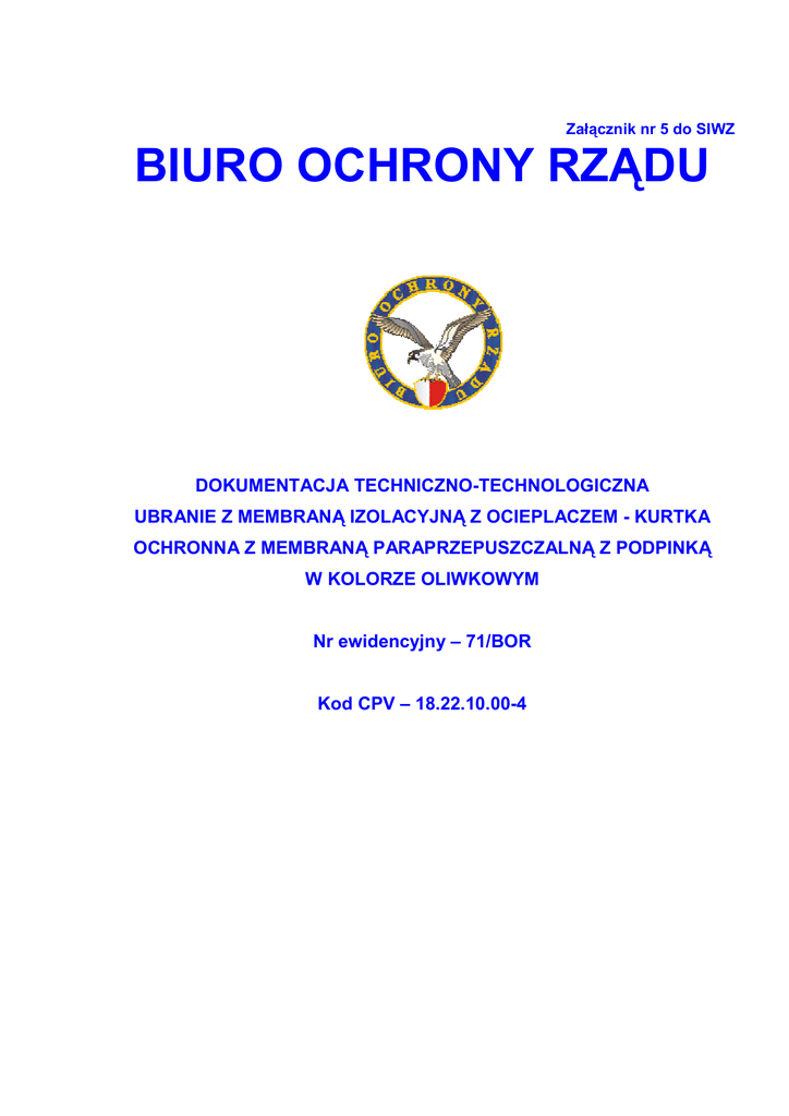 Załącznik nr 5 do SIWZ BIURO OCHRONY RZĄDU DOKUMENTACJA TECHNICZNO-TECHNOLOGICZNA UBRANIE Z MEMBRANĄ IZOLACYJNĄ Z OCIEPLACZEM - KURTKA OCHRONNA Z MEMBRANĄ PARAPRZEPUSZCZALNĄ Z PODPINKĄ W KOLORZE OLIWKOWYM Nr ewidencyjny – 71/BOR Kod CPV – 18.22.10.00-4 Spis treści: 1. Rysunek modelowy. 3 2. Opis ogólny wyrobu. 4-5 3. Wymagania techniczne. 6 3.1 Wykaz materiałów zasadniczych i dodatków. 6-7 3.2 Wymagania techniczno uŜytkowe tkaniny zasadniczej. 8 - 10 3.3 Wymagania techniczno uŜytkowe dzianiny typu „Polar”. 10 - 11 3.4 Rodzaje szwów i ściegów maszynowych. 11 3.5 Parametry klejenia. 11 - 12 3.6 Dopuszczalne sztukowanie elementów. 12 3.7 Tabela klasyfikacji wielkości. 12 4. Cechowanie, składanie, pakowanie, przechowywanie i gwarancja. 13 4.1 Rozmieszczenie cech dostawcy. 13 4.2 Składanie. 14 4.3 Pakowanie. 14 4.4 Przechowywanie. 14 4.5 Gwarancja. 14 5. Rysunki techniczne. 15 - 19 6. Arkusz ewidencji wprowadzonych zmian. 20 2 1. RYSUNEK MODELOWY. Rysunek 1 – widok ogólny kurtki. 3 2. OPIS OGÓLNY WYROBU. Kurtka ochronna wykonana z wodoodpornej tkaniny poliestrowej z membraną paroprzepuszczalną w kolorze zielonej oliwki. Zaprojektowana pod kątem zabezpieczenia przed złymi warunkami atmosferycznymi oraz dla podniesienia komfortu uŜytkowania. Kurtka posiada podpinkę (ocieplacz) dopinany w przodzie zamkiem błyskawicznym. Po odpięciu podpinki (ocieplacza) od kurtki wyrób moŜe być uŜytkowany jako bluza. Kurtka ochronna zapinana na rozdzielny zamek błyskawiczny dwusuwakowy przykryty plisą zapinaną na napy i rzepy. Pliski zakrywają takŜe kieszenie (poziome) umieszczone na wysokości piersi zamykane na zamek błyskawiczny. Pod karczkiem przodu prawego umieszczona jest wyjmowana patka z logiem BOR. W tylnej części pleców pod karczkiem równieŜ umieszczona jest wyjmowana patka z napisem „BOR ”w kolorze srebrnym odblaskowym. Logo BOR jak zarówno napis, zarówno w przodzie jak i w tyle przypinane jest na taśmę samosczepną. W dolnej części przodów wykonane kieszenie cięte zapinane na zamek błyskawiczny przykrywane listewkami. Na wysokości piersi przy krawędziach przodu wykonane kieszenie pionowe zapinane na dwa odcinki taśmy samosczepnej. W szwach bocznych kurtki i sięgających do rękawa znajdują się otwory przelotowe zapinane na zamek błyskawiczny przystosowane do wkładania i wyjmowania broni słuŜbowej. Dół kurtki wykończony podwinięciem w postaci tunelu, w który umieszczona jest guma słuŜąca do regulacji obwodu. W tylnej części kurtki poniŜej tunelu wykonana kieszeń cięta zapinana na zamek błyskawiczny przykrywany listewką. Kurtka posiada kaptur zapinany na zamek błyskawiczny z moŜliwością chowania w stójkę. Kaptur wyposaŜony jest w regulacje obwodu sznurkiem elastycznym w części przedniej. Na wierzchniej części rękawów pod lekkim skosem wykonane kieszenie cięte zapinane na zamek błyskawiczny. Dół rękawa z patką słuŜącą do regulacji obwodu. Kurtka posiada od wewnętrznej strony dodatkowy zamek błyskawiczny umoŜliwiający przypięcie podpinki (ocieplacza). Podpinka (ocieplacz) kurtki ochronnej wykonany jest z dzianiny odzieŜowej typu „Polar” w kolorze zielonej oliwki. Przód podpinki (ocieplacza) zapinany na zamek błyskawiczny, posiada skośne kieszenie boczne zapinane na zamki błyskawiczne. Góra wykończona szeroką stójką z moŜliwością wykładania. 4 Dół wykończony podwinięciem w formie tunelu. W szwach bocznych podpinki (ocieplacza) wykonane są otwory przelotowe zapinane na zamek błyskawiczny przystosowane do wkładania i wyjmowania broni słuŜbowej. Od strony wewnętrznej podpinki (ocieplacza) po lewej stronie na wysokości piersi pionowa kieszeń wpuszczana zapinana na zamek błyskawiczny. Natomiast od wewnętrznej strony podpinki (ocieplacza) po prawej stronie naszyta siatkowa kieszeń wykończona gumką. Na karczku tyłu i przodu oraz na rękawach, naszyte tkaninowe wzmocnienia. 5 3. WYMAGANIA TECHNICZNE. 3.1. WYKAZ MATERIAŁÓW ZASADNICZYCH I DODATKÓW. Wykaz materiałów zasadniczych i dodatków przedstawiono w tabeli 1. Tabela 1. Lp. Nazwa materiału /dodatku 1 2 1. Tkanina poliestrowa laminowana z membraną paroprzepuszczalną - kolor zielona oliwka. 2. Podszewka poliestrowa - kolor zielona oliwka. 3. Tkanina wzmocnieniowa 100% bawełna - kolor zielona oliwka. 4. Dzianina aŜurowa (siatka) - kolor zielona oliwka. 5. Poliamidowa dzianina osnowowa - kolor zielona oliwka. 6. Dzianina typu „Polar” - kolor zielona oliwka. 7. Taśma do uszczelniania szwów z membraną paroprzepuszczalną szerokość 2,0 cm w kolorze białym. 8. Emblemat BOR okrągły. 9. Napis wysokoodblaskowy BOR. 10. „Włóknitex” bez kleju lub równowaŜny. 11. Taśma elastyczna szer. 20 mm w kolorze khaki. 12. Taśma wieszakowa szer. 6 mm w kolorze khaki. 13. Guma okrągła szer. 3 mm w kolorze khaki. 14. Nici z rdzeniem poliestrowym grubość 194x2 dtex lub 200x2 dtex w kolorze tkaniny zasadniczej. 15. Nici poliestrowe z włókien ciętych grubość 194x2 dtex lub 200x2 dtex w kolorze tkaniny zasadniczej. 16. Stoper jednokomorowy z dziurkami na tasiemkę z tworzywa sztucznego w kolorze khaki. 17. Stoper dwukomorowy z tworzywa sztucznego w kolorze khaki. 18. Końcówki do sznurka w kolorze khaki. 6 1 2 19. Oczko mosięŜne oksydowane o średnicy 5,5.mm. 20. Zamek błyskawiczny 2-suwakowy średniocząstkowy rozdzielczy. 21. Zamek błyskawiczny 1-suwakowy średniocząstkowy rozdzielczy. 22. Zamek błyskawiczny 1-suwakowy spiralny rozdzielczy. 23. Zamek błyskawiczny 1-suwakowy spiralny nierozdzielczy. 24. Zamek błyskawiczny 2-suwakowy kostka nierozdzielczy, forma X. 25. Taśma samosczepna szer. 2,0 cm w kolorze khaki pętelka. 26. Taśma samosczepna szer. 2,0 cm w kolorze khaki haczyk. 27. Taśma samosczepna szer. 10 cm w kolorze khaki haczyk. 28. Taśma samosczepna szer. 10 cm w kolorze khaki pętelka. 29. Zatrzask konfekcyjny o średnicy 15 mm: -wierzch w kolorze oksydowanym; -gniazdo