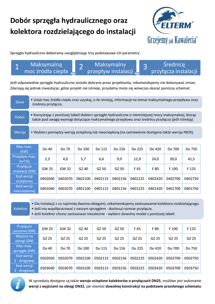 Dobór sprzęgła hydraulicznego oraz kolektora rozdzielającego do instalacji Sprzęgła hydrauliczne dobieramy uwzględniając trzy podstawowe ich parametry: Maksymalną 1 , moc źródła ciepła Maksymalny 2 .przepływ instalacji Średnicę 3 .przyłącza instalacji Jeśli odpowiednie sprzęgło hydrauliczne zostało dobrane przez projektanta, rekomendujemy nie dokonywać zmian. Zdarzają się jednak inwestycje, gdzie projekt nie istnieje, przydatny może się wówczas okazać poniższy schemat: Dane • Ustal moc źródła ciepła oraz uzyskaj, o ile istnieją, informacje na temat maksymalnego przepływu oraz średnicy przyłącza. Dobór • Korzystając z poniższej tabeli dobierz sprzęgło hydrauliczne o niemniejszej mocy maksymalnej, biorąc także pod uwagę wymogi dotyczące maksymalnego przepływu oraz średnicy przyłącza (jeśli istnieją). Wersja • Wybierz pomiędzy wersją ocieploną lub nieocieploną (na zamówienie dostępna także wersja INOX). Moc max. (kW) Przepływ max. (m³/h) Przyłącze instalacji (DN) Kod wersji ocieplonej Kod wersji nieocieplonej Kolektor Do 40 Do 70 Do 100 Do 115 Do 156 Do 225 Do 420 Do 700 Do 750 2,3 4,0 5,7 6,6 9,0 12,9 24,0 39,0 41,5 GW 25 GW 32 GZ 40 GZ 50 GZ 50 F 65 F 80 F 100 F 125 0402040 0402070 0402100 0402115 0402156 0402225 0402420 0402700 0402750 0401040 0401070 0401100 0401115 0401156 0401225 0401420 0401700 0401750 • Dla instalacji z co najmniej dwoma obiegami, rekomendujemy zastosowanie kolektora rozdzielającego. • Jeśli ma współpracować z naszym sprzęgłem - dostosuj rozmiar przyłącza. • Jeśli kolektor chcesz zastosować niezależnie - wybierz dowolny model z poniższej tabeli Przyłącze poziome (DN) Wyjścia na obiegi (DN) Moc max. sprzęgła (kW) Kod wersji 2 - drogowej Kod wersji 3 - drogowej GW 25 GW 32 GZ 40 GZ 50 GZ 50 F 65 F 80 F 100 F 125 GZ 25 GZ 25 GZ 25 GZ 25 GZ 25 GZ 25 GZ 25 GZ 25 GZ 25 Do 40 Do 70 Do 100 Do 115 Do 156 Do 225 Do 420 Do 700 Do 750 0502050 0502070 0502100 0502115 0502156 0502225 0502420 0502700 0502750 0503040 0503070 0503100 0503115 0503156 0503225 0503420 0503700 0503750 W sprzedaży dostępne są także wersje ocieplone kolektorów o przyłączach DN25, możliwe jest wykonanie wersji z wyjściami na obiegi DN32, jak również dowolnej konstrukcji na podstawie przesłanego schematu.