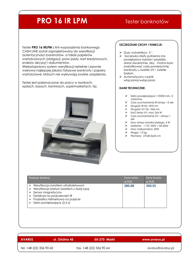 PRO 16 IR LPM Tester banknotów Tester PRO 16 IRLPM z linii wyposaŜenia bankowego CASH LINE został zaprojektowany do weryfikacji autentyczności banknotów, a takŜe papierów wartościowych (obligacji, praw jazdy, kart kredytowych, znaków akcyzy) i dokumentów. Wielostopniowy system weryfikacji rzetelnie i pewnie wykrywa najlepszej jakości fałszywe banknoty i papiery wartościowe, których nie wykrywają zwykłe urządzenia. Tester jest przeznaczone do pracy w bankach, sądach, kasach, kantorach, supermarketach, itp. SZCZEGÓLNE CECHY I FUNKCJE: DuŜy wyświetlacz 5 ". Soczewka strefy patrzenia ma powiększony rozmiar i przybliŜa obraz dwukrotnie, aby moŜna było zweryfikować całą powierzchnię banknotu u świetle UV i świetle białym. Automatyczny czujnik włączania/wyłączania DANE TECHNICZNE: Rodzaje detekcji Weryfikacja światłem ultrafioletowym Weryfikacja białym światłem z duŜą lupą Sensor magnetyczny Detekcja na podczerwień IR Podziałka milimetrowa na pulpicie Szkło powiększające (2,5 x) AVARUS tel. +48 (22) 356 90 60 ul. Okólna 45 05-270 Marki fax. +48 (22) 356 90 64 Szkło powiększające 110Х50 mm, 2ciokrotne Czas uruchamiania IR lampy ~2 sek Długość IR fal ~870 nm Długość UV fal ~365 nm Ilość lamp UV, moc 2х6 W Czas uruchamiania UV – lampy 1 sek Moc lampy światła białego, 6 W Zasilanie: ~110- 220V / 50-60Hz Moc maksymalna: 20W Waga: 1.9 kg Wymiary: 27x20,5x24 cm Cena netto w PLN Cena brutto w PLN 285.00 350.55 www.avarus.pl [email protected]