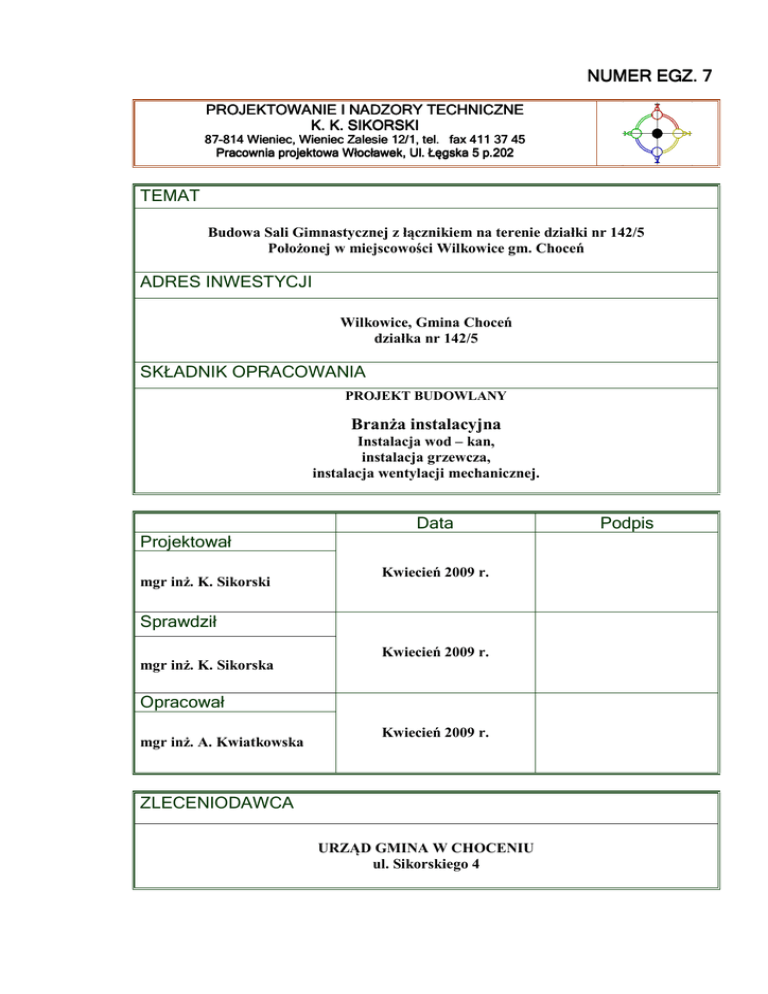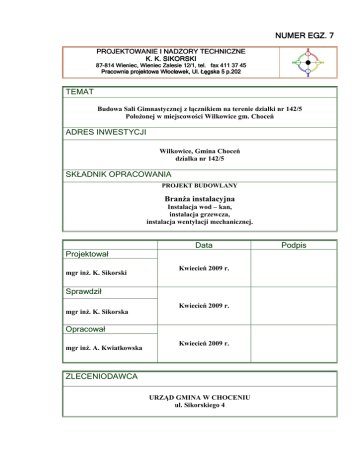 NUMER EGZ. 7 PROJEKTOWANIE I NADZORY TECHNICZNE K. K. SIKORSKI 8787-814 Wieniec, Wieniec Zalesie 12/1, tel. fax 411 37 45 Pracownia projektowa Włocławek, Ul. Łęgska 5 p.202 TEMAT Budowa Sali Gimnastycznej z łącznikiem na terenie działki nr 142/5 Położonej w miejscowości Wilkowice gm. Choceń ADRES INWESTYCJI Wilkowice, Gmina Choceń działka nr 142/5 SKŁADNIK OPRACOWANIA PROJEKT BUDOWLA2Y Branża instalacyjna Instalacja wod – kan, instalacja grzewcza, instalacja wentylacji mechanicznej. Data Projektował mgr inż. K. Sikorski Kwiecień 2009 r. Sprawdził Kwiecień 2009 r. mgr inż. K. Sikorska Opracował mgr inż. A. Kwiatkowska Kwiecień 2009 r. ZLECENIODAWCA URZĄD GMI2A W CHOCE2IU ul. Sikorskiego 4 Podpis Projektowanie i Nadzory Techniczne K. K. Sikorski, 87-814 Wieniec, Wieniec Zalesie 12/1 2 SPIS TREŚCI OPIS TECHNICZNY 1.0. Podstawa opracowania 2.0. Zakres opracowania 3.0. Instalacja grzewcza 3.1. Obieg zasilania grzejników w łączniku 3.2. Obieg zasilania nagrzewnic 3.3. Obieg zasilania nagrzewnic 3.4. Bilans ciepła 3.4.1.Warunki obliczeniowe 3.4.2. Zapotrzebowanie ciepła w pomieszczeniach 3.5. Próby i płukanie instalacji c.o. 3.6. Izolacje 3.6. Wymiennik ciepła 4.0. Rozbudowa kotłowni olejowej 5.0. Instalacja wod-kan. 6.0.Kanalizacja sanitarna 7.0. Armatura i urządzenia sanitarne 9.0. Próby i izolacje 9.0.Izolacja przewodów 10.0. Wentylacja mechaniczna 10.1. Wentylacja mechaniczna łazienek i szatni 10.2. Wentylacja mechaniczna sali gimnastycznej 11.0. Kanalizacja deszczowa 12.0.Uwagi końcowe Oświadczenie projektanta Oświadczenie sprawdzającego SPIS RYSUNKÓW Rys.1 Instalacja grzewcza, wod-kan. i wentylacji mechanicznej - Rzut przyziemia sali gimnastycznej Rys.2 Instalacja grzewcza, wod-kan. i wentylacji mechanicznej - Rzut przyziemia łącznika Rys.3 Instalacja wentylacji mechanicznej - Szczegóły wykonania Rys.4 Schemat technologii kotłowni olejowej Rys.5 Instalacja wod-kan. – szczegóły wykonania Projektowanie i Nadzory Techniczne K. K. Sikorski, 87-814 Wieniec, Wieniec Zalesie 12/1 OPIS 3 TECHNICZNY Dla zadania: Budowa Sali Gimnastycznej z łącznikiem na terenie działki nr 142/5 Położonej w miejscowości Wilkowice gm. Choceń Instalacja wod – kan, instalacja grzewcza, instalacja wentylacji mechanicznej. Wilkowice, Gmina Choceń działka nr 142/5 1.0. Podstawa opracowania 1.1. Dokumentacja architektoniczna 1.2. Wizja lokalna 1.3. Normy i przepisy obowiązujące 2.0. Zakres opracowania Zakres niniejszego opracowania obejmuje wykonanie instalacji grzewczej, wod-kan. i wentylacji mechanicznej dla budowy Sali Gimnastycznej z łącznikiem w Wilkowicach, gmina Choceń. Odprowadzenie ścieków sanitarnych do istniejącego na terenie szkoły zbiornika fekalnego kanalizacji sanitarnej. Zasilanie w wodę do celów socjalno-bytowych istniejącego ppoż. z istniejącego przyłącza wodociągowego. Zasilanie w ciepło z istniejącej budynku kotłowni olejowej, rozbudowanej o dodatkowy kocioł tylko dla potrzeb nowej inwestycji. Ogrzewanie ciepłej wody poprzez istniejący przepływowy podgrzewacz ciepłej wody zasilany z w ciepło z istniejącego kotła. Odprowadzenie wód deszczowych na tereny zielone wokół Sali gimnastycznej. 3.0. Instalacja grzewcza Projektowana instalacja grzewcza zasila w ciepło trzy niezależne obiegi grzewcze a) Obieg zasilania grzejników w łączniku, b) Obieg zasilania nagrzewnic c) Obieg zasilania centrali wentylacyjnej 3.1. Obieg zasilania grzejników w łączniku Projektowanie i Nadzory Techniczne K. K. Sikorski, 87-814 Wieniec, Wieniec Zalesie 12/1 4 Do dla rozprowadzenia medium grzewczego dla tego obiegu zaprojektowano zastosowanie instalacji grzewczej dwururowej z rur miedzianych łączonych przez lutowanie. Obliczeniowe temperatury dla instalacji 70/50oC. Pomieszczenia ogrzewane będą poprzez grzejniki stalowe płytowe typu CosmoNova firmy VNH (pomieszczenia socjalno-bytowe i magazynowe) z zasilaniem od dołu. Instalację co zaprojektowano jako jeden obieg grzewczy zasilający pomieszczenia w łączniku pomiędzy projektowaną salą gimnastyczną a istniejącym budynkiem szkoły, poprzez przewody prowadzone w szlichcie podłogowej od rozdzielacza mieszkaniowego zainstalowanego w szafce ściennej, rozdzielaczowej do indywidualnych grzejników. Grzejniki wyposażyć w zestaw montażowy do instalowania grzejników z zasilaniem wyprowadzonym ze ściany, nad posadzką. W szafce rozdzielaczowej instalować także zawory odcinające i zawór odpowietrzjacy. Typ grzejników wraz z ich wymiarami, obliczeniowe zapotrzebowanie ciepła i nastawy zaworów termostatycznych przy grzejnikach podano przy każdym z grzejników. Grzejniki wyposażyć w zawory termostatyczne firmy Danfoss, o średnicy nominalnej dn 15. Grzejniki wyposażyć w zawory przyłączeniowe pozwalające na demontaż grzejników bez konieczności wyłączania ogrzewania. Podejścia z rur dn15cu pod grzejniki prowadzić w bruzdach ściennych, z wyprowadzeniem podłączeń bezpośrednio pod grzejniki ze ściany. Projektuje się regulację jakościowo-ilościową instalacji grzewczej poprzez regulator pogodowy w kotłowni oraz poprzez nastawy zaworów termostatycznych przy grzejnikach i zawór trójdrogowy z napędem. Odpowietrzenie instalacji poprzez zawory odpowietrzające zamontowane w najwyższych punktach instalacji grzewczej. W łazienkach zaprojektowano montaż grzejników łazienkowych, drabinkowych z podejściem od dołu, prod. VNH. Przy montażu grzejników należy kierować się następującymi zasadami: - grzejniki o długości do 1600mm należy mocować na ścianach na min. 2szt. wieszaków naściennych, - grzejniki o długości powyżej 1600mm należy montować na ścianach na min. 3 szt. wieszaków naściennych. W instalacji zastosowano armaturę: - zawory kulowe mufowe wykonane z mosiądzu lub brązu. - zawory grzejnikowe z głowicami termostatycznymi firmy Danfoss, średnicy 15mm. Projektowanie i Nadzory Techniczne K. K. Sikorski, 87-814 Wieniec