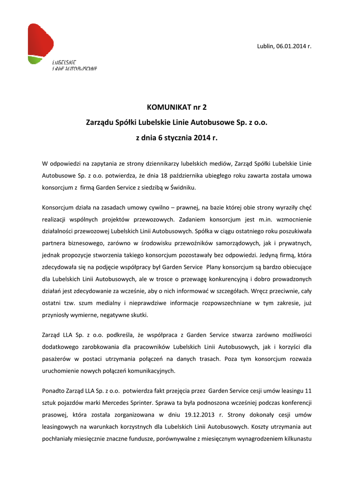 Lublin, 06.01.2014 r. KOMUNIKAT nr 2 Zarządu Spółki Lubelskie Linie Autobusowe Sp. z o.o. z dnia 6 stycznia 2014 r. W odpowiedzi na zapytania ze strony dziennikarzy lubelskich mediów, Zarząd Spółki Lubelskie Linie Autobusowe Sp. z o.o. potwierdza, że dnia 18 października ubiegłego roku zawarta została umowa konsorcjum z firmą Garden Service z siedzibą w Świdniku. Konsorcjum działa na zasadach umowy cywilno – prawnej, na bazie której obie strony wyraziły chęć realizacji wspólnych projektów przewozowych. Zadaniem konsorcjum jest m.in. wzmocnienie działalności przewozowej Lubelskich Linii Autobusowych. Spółka w ciągu ostatniego roku poszukiwała partnera biznesowego, zarówno w środowisku przewoźników samorządowych, jak i prywatnych, jednak propozycje stworzenia takiego konsorcjum pozostawały bez odpowiedzi. Jedyną firmą, która zdecydowała się na podjęcie współpracy był Garden Service Plany konsorcjum są bardzo obiecujące dla Lubelskich Linii Autobusowych, ale w trosce o przewagę konkurencyjną i dobro prowadzonych działań jest zdecydowanie za wcześnie, aby o nich informować w szczegółach. Wręcz przeciwnie, cały ostatni tzw. szum medialny i nieprawdziwe informacje rozpowszechniane w tym zakresie, już przyniosły wymierne, negatywne skutki. Zarząd LLA Sp. z o.o. podkreśla, że współpraca z Garden Service stwarza zarówno możliwości dodatkowego zarobkowania dla pracowników Lubelskich Linii Autobusowych, jak i korzyści dla pasażerów w postaci utrzymania połączeń na danych trasach. Poza tym konsorcjum rozważa uruchomienie nowych połączeń komunikacyjnych. Ponadto Zarząd LLA Sp. z o.o. potwierdza fakt przejęcia przez Garden Service cesji umów leasingu 11 sztuk pojazdów marki Mercedes Sprinter. Sprawa ta była podnoszona wcześniej podczas konferencji prasowej, która została zorganizowana w dniu 19.12.2013 r. Strony dokonały cesji umów leasingowych na warunkach korzystnych dla Lubelskich Linii Autobusowych. Koszty utrzymania aut pochłaniały miesięcznie znaczne fundusze, porównywalne z miesięcznym wynagrodzeniem kilkunastu pracowników Lubelskich Linii Autobusowych. Gdyby spółka nie znalazła cedenta to licząc od września ub. roku do stycznia br. LLA straciłoby w tym czasie ok. 200 tys. zł. Należy jednak zdecydowanie podkreślić, że w pierwszej kolejności pytanie o przejęcie cesji umów leasingowych zostało skierowane do pozostałych spółek z Grupy PKS „WSCHÓD” oraz innych partnerów. Oferta ta nie spotkała się jednak z zainteresowaniem. W dalszych krokach prowadzono rozmowy z 2 przewoźnikami (z północy Polski i ze Śląska) – również bez oczekiwanego finału (jeden zainteresowany był 2 busami, a drugi - 4). Dopiero w ostatniej fazie działań pojawił się partner, który nie dość, że posiadał odpowiednią zdolność finansową (jaką każdorazowo bada przed wyrażeniem zgody na przekazanie cesji właściciel finansowy pojazdów), to w dodatku był gotowy do przejęcia cesji wszystkich umów – czym żywotnie zainteresowane było LLA. Wspomniane wyżej działania podejmowane przez Zarząd Lubelskich Linii Autobusowych mają za zadanie poprawę komfortu i bezpieczeństwa przewozów, które oferuje swoim klientom oraz rozwijanie sieci przewozów. Od początku powołania Spółki jednym z głównych priorytetów jest także stałe podnoszenie jakości usług, czego dowodem jest m.in. niedawno uruchomiona nowa strona internetowa, dostosowana do aktualnych potrzeb pasażerów, czy też program szkoleniowy adresowany do kierowców, którego głównym przesłaniem będzie poprawa obsługi jakości klientów Lubelskich Linii Autobusowych. Program ten najprawdopodobniej rozpocznie się już w styczniu br. Zarząd LLA w pełni zgadza się także z inicjatywą i treścią pisma pracowników LLA skierowanego w dniu 3 stycznia br. do jednej z lubelskich redakcji. Z kolei analizując jeden z ostatnich tytułów publikacji prasowych („Komunikacja półprywatna”) zaskakującym faktem jest to, że nie zauważa się, że komunikacja półprywatna już od kilku lat doskonale się sprawdza chociażby w … komunikacji miejskiej w Lublinie, gdzie obok samorządowo-gminnego przewoźnika (MPK), Zarząd Transportu Miejskiego dopuścił przewoźników prywatnych, którzy startując właśnie w konsorcjum obsługują część połączeń w ramach tejże komunikacji. Tego rodzaju przewozy nie budzą, jak się wydaje, niezdrowego zainteresowania i nie są opisywane jako sensacyjne. Jednocześnie Zarząd LLA ubolewa, że podejmując wysiłek odbudowania pozycji Lubelskich Linii Autobusowych na rynku przewozowym i sięgając po dobre i sprawdzające się wzorce oraz modele biznesowe funkcjonujące od lat na rynku, napotyka dziwną nieufność. Zarząd Lubelskich Linii Autobusowych ma w tej materii zupełnie inne zdanie i wizję rozwoju Spółki LLA, w której mieści się i budowanie oraz rozszerzanie siatki połączeń oraz aktywne zagospodarowanie zbędnych składników majątku – czego Spółce, pracownikom, a przede wszystkim pasażerom – gorąco życzy i oczekuje, że przy odrobinie dobrej woli i współpracy wszystkich zainteresowanych stron – uda się to osiągnąć. Zarząd Spółki