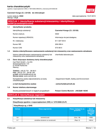 karta charakterystyki zgodnie z rozporządzeniem (WE) nr 1907/2006 (REACH), zmienionej 2015/830/UE Czerwień Kongo (C.I. 22120) do mikroskopii numer artykułu: 0322 Wersja: 1.0 pl data sporządzenia: 15.07.2015 SEKCJA 1: Identyfikacja substancji/mieszaniny i identyfikacja spółki/przedsiębiorstwa 1.1 1.2 Identyfikator produktu Identyfikacja substancji Czerwień Kongo (C.I. 22120) Numer artykułu 0322 Numer rejestracji (REACH) Informacja nie jest dostępna. Nr. indeksowy 611-027-00-8 Numer WE 209-358-4 Numer CAS 573-58-0 Istotne zidentyfikowane zastosowania substancji lub mieszaniny oraz zastosowania odradzane Istotne zidentyfikowane zastosowania substancji lub mieszaniny oraz zastosowania odradzane 1.3 chemikalia laboratoryjna Dane dotyczące dostawcy karty charakterystyki Carl Roth GmbH + Co KG Schoemperlenstr. 3-5 D-76185 Karlsruhe Niemcy Telefon: +49 (0) 721 - 56 06 0 Fax: +49 (0) 721 - 56 06 149 e-mail: [email protected] Strona www: www.carlroth.de 1.4 Kompetentna osoba odpowiedzialna za kartę charakterystyki : Department Health, Safety and Environment e-mail (kompetentna osoba) : [email protected] Numer telefonu alarmowego Służba powiadamianych w nagłych przypadkach Poison Centre Munich: +49/(0)89 19240 SEKCJA 2: Identyfikacja zagrożeń 2.1 Klasyfikacja substancji lub mieszaniny Klasyfikacja zgodnie z rozporządzeniem (WE) nr 1272/2008 (CLP) Klasyfikacja zg. z GHS Sekcja Klasa zagrożenia Klasa i kategoria zagrożenia Zwrot wskazujący rodzaj zagrożenia 3.6 rakotwórczość (Carc. 1B) H350 3.7 szkodliwe działanie na rozrodczość (Repr. 2) H361d Polska (pl) Strona 1 / 12 karta charakterystyki zgodnie z rozporządzeniem (WE) nr 1907/2006 (REACH), zmienionej 2015/830/UE Czerwień Kongo (C.I. 22120) do mikroskopii numer artykułu: 0322 2.2 Elementy oznakowania Oznakowania zgodnie z rozporządzeniem (WE) nr 1272/2008 (CLP) Hasło ostrzegawcze Niebezpieczeństwo Piktogramy Zwroty wskazujące rodzaj zagrożenia H350 H361d Może powodować raka. Podejrzewa się, że działa szkodliwie na dziecko w łonie matki. Zwroty wskazujące środki ostrożności Zwroty wskazujące środki ostrożności - zapobieganie P201 Przed użyciem zapoznać się ze specjalnymi środkami ostrożności. Zwroty wskazujące środki ostrożności - reagowanie P308+P313 W PRZYPADKU narażenia lub styczności: zasięgnąć porady/zgłosić się pod opiekę lekarza. Tylko dla profesjonalnych użytkowników Oznakowanie opakowań, których zawartość nie przekracza 125 ml Hasło ostrzegawcze: Niebezpieczeństwo Symbol(-e) 2.3 H350 H361d Może powodować raka. Podejrzewa się, że działa szkodliwie na dziecko w łonie matki. P201 P308+P313 Przed użyciem zapoznać się ze specjalnymi środkami ostrożności. W PRZYPADKU narażenia lub styczności: zasięgnąć porady/zgłosić się pod opiekę lekarza. Inne zagrożenia Nie ma dodatkowych informacji. Polska (pl) Strona 2 / 12 karta charakterystyki zgodnie z rozporządzeniem (WE) nr 1907/2006 (REACH), zmienionej 2015/830/UE Czerwień Kongo (C.I. 22120) do mikroskopii numer artykułu: 0322 SEKCJA 3: Skład/informacja o składnikach 3.1 Substancje Nazwa substancji Czerwień Kongo (C.I. 22120) Nr. indeksowy 611-027-00-8 Numer WE 209-358-4 Numer CAS 573-58-0 Wzór cząsteczkowy C₃₂H₂₂N₆Na₂O₆S₂ Masa cząsteczkowa 696,7 g/mol SEKCJA 4: Środki pierwszej pomocy 4.1 Opis środków pierwszej pomocy Uwagi ogólne Zdjąć zanieczyszczoną odzież. Po narażeniu przez drogi oddechowe W PRZYPADKU narażenia lub styczności: Skontaktować się z lekarzem. W przypadku trudności z oddychaniem, wyprowadzić lub wynieść poszkodowanego na świeże powietrze i zapewnić warunki do odpoczynku w pozycji umożliwiającej swobodne oddychanie. Po kontakcie ze skórą Spłukać skórę pod strumieniem wody/prysznicem. Zasięgnąć porady lekarza w przypadku pojawienia się jakichkolwiek wątpliwości, lub jeżeli objawy nie ustępują. Po kontakcie z oczami Ostrożnie płukać wodą przez kilka minut. Zasięgnąć porady lekarza w przypadku pojawienia się jakichkolwiek wątpliwości, lub jeżeli objawy nie ustępują. Po narażeniu przez przewód pokarmowy Wypłukać usta. Nie wywoływać wymiotów. W przypadku awarii lub jezeli zle sie poczujesz, niezwlocznie zasiegnij porady lekarza - jezeli to mozliwe, pokaz etykiete. 4.2 Najważniejsze ostre i opóźnione objawy oraz skutki narażenia Zmęczenie 4.3 Wskazania dotyczące wszelkiej natychmiastowej pomocy lekarskiej i szczególnego postępowania z poszkodowanym żadne Polska (pl) Strona 3 / 12 karta charakterystyki zgodnie z rozporządzeniem (WE) nr 1907/2006 (REACH), zmienionej 2015/830/UE Czerwień Kongo (C.I. 22120) do mikroskopii numer artykułu: 0322 SEKCJA 5: Postępowanie w przypadku pożaru 5.1 Środki gaśnicze Odpowiednie środki gaśnicze Środki gaśnicze należy dostosować do otoczenia rozpylona woda, piana, suchy proszek gaśniczy, dwutlenek węgla (CO2) Niewłaściwe środki gaśnicze silny strumień wody 5.2 Szczególne zagrożenia związane z substancją lub mieszaniną Palny. Produkty spalania stwarzające zagrożenie Podczas pożaru mogą powstawać: tlenki azotu (NOx), tlenek węgla (CO), dwutlenek węgla (CO2), tlenki siarki (Sox) 5.3 Informacje dla straży pożarnej Gasić pożar z rozsądnej odległości z zachowaniem zwykłych środków ostrożności. Nosić autonomiczny aparat oddechowy. SEKCJA 6: Postępowanie w przypadku niezamierzonego uwolnienia do środowiska 6.1 Indywidualne środki ostrożności, sprzęt ochronny i procedury w sytuacjach awaryjnych Dla osób nienależących do personelu udzielającego pomocy Noszenie odpowiedniego sprzętu ochronnego (w tym osobiste wyposażenie ochronne, o których mowa w sekcji 8 karty charakterystyki), aby zapobiec skażeniu skóry, oczu lub odzieży. Nie wdychać pyłu. Unikać kontaktu ze skórą, oczami i odzieżą. 6.2 Środki ostrożności w zakresie ochrony środowiska Zapobiegać przedostaniu się do kanalizacji, wód powierzchniowych i grunt