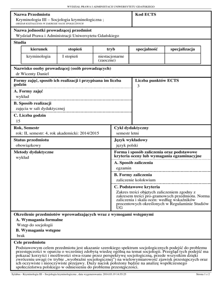 WYDZIAŁ PRAWA I ADMINISTACJI UNIWERSYTETU GDAŃSKIEGO Nazwa Przedmiotu Kryminologia Kryminologia III III –– Socjologia Socjologia kryminologiczna kryminologiczna ;; Kod ECTS OBSZAR KSZTAŁCENIA W ZAKRESIE NAUK SPOŁECZNYCH Nazwa jednostki prowadzącej przedmiot Wydział Prawa i Administracji Uniwersytetu Gdańskiego Studia kierunek kryminologia kryminologia stopień II stopień stopień tryb niestacjonarne (zaoczne) niestacjonarne (zaoczne) Nazwisko osoby prowadzącej (osób prowadzących) dr Wicenty Daniel Formy godzin Formy zajęć, zajęć, sposób sposób ich ich realizacji realizacji ii przypisana przypisana im im liczba liczba godzin A. Formy zajęć wykład wykład specjalność specjalizacja Liczba punktów ECTS 3 B. Sposób realizacji zajęcia zajęcia w w sali sali dydaktycznej dydaktycznej C. Liczba godzin 15 15 Rok, Semestr rok: II, semestr: 4, rok akademicki: 2014/2015 Cykl dydaktyczny semestr letni Status przedmiotu obowiązkowy Język wykładowy język polski Metody dydaktyczne wykład Forma i sposób zaliczenia oraz podstawowe kryteria oceny lub wymagania egzaminacyjne A. Sposób zaliczenia egzamin B. Formy zaliczenia zaliczenie kolokwium C. Podstawowe kryteria Zakres treści objętych zaliczeniem zgodny z zakresem treści pro-gramowych przedmiotu. Norma zaliczenia i skala ocen: według wskaźników procentowych określonych w Regulaminie Studiów UG Określenie przedmiotów wprowadzających wraz z wymogami wstępnymi A. Wymagania formalne Wstęp do socjologii B. Wymagania wstępne brak Cele przedmiotu Podstawowym celem przedmiotu jest ukazanie szerokiego spektrum socjologicznych podejść do problemu przestępczości w oparciu o wcześniej zdobytą wiedzę ogólną na temat socjologii. Przegląd tych podejść ma pokazać korzyści i możliwości stwa-rzane przez perspektywę socjologiczną, przede wszystkim dzięki zwróceniu uwagi (w trybie „wyobraźni socjologicznej") na wielowymiarowość zjawisk przestępczych oraz ich oczywiste i nieoczywiste przejawy. Duży nacisk położony będzie na analizę współczesnego społeczeństwa polskiego w odniesieniu do problemu przestępczości. Sylabus - Kryminologia III – Socjologia kryminologiczna , data wygenerowania: 2014.03.19 14:55:25 Strona 1 z 2 WYDZIAŁ PRAWA I ADMINISTACJI UNIWERSYTETU GDAŃSKIEGO Treści programowe Kryminologia klasyczna i naturalistyczna (wybrane aspekty); socjologiczne kierunki w kryminologii pozytywistycznej: podej-ście ekologiczne (R. Park i szkoła chicagowska) i strukturalne (R. Merton i koncepcja anomii) i socjalizacyjno-kulturowe (A. Cohen i teoria zróżnicowania kulturowego, E. Sutherland i teoria zróżnicowanych powiązań); koncepcja przestępczości „bia-łych kołnierzyków" (D. Cressey, E. Sutherland); kryminologia antynaturalistyczna: teoria etykietowania/stygmatyzacji (H. Becker, K. Erikson), koncepcje M. Foucault; społeczne postrzeganie przestępczości; historia przestępczości w II RP i PRL (wybrane aspekty); polski Atlas przestępczości; oblicza przestępczości zorganizowanej: teorie genezy mafii, współczesne formy działania, przestępczość zorganizowana w Polsce Wykaz literatury A. Literatura wymagana do ostatecznego zaliczenia zajęć (zdania egzaminu): A.1. wykorzystywana podczas zajęć • Kamil BUŁAT i in., Kryminologia, Warszawa 2007 • Brunon HOŁYST, Kryminologia (różne wydania) A.2. studiowana samodzielnie przez studenta • Jacek KURZĘPA, Socjopatologia pogranicza. Zmiany w życiu społeczności zachodniego pogranicza: studium socjologiczne, Zielona Góra 2007 • Howard BECKER, Outsiderzy: studia z socjologii dewiacji, Warszawa 2011 • Diego GAMBETTA, Mafia sycylijska: prywatna ochrona jako biznes, Warszawa 2009 B. Literatura uzupełniająca • serie Polskie badania przestępczości i Atlas przestępczości • wybrane artykuły z czasopism „Archiwum kryminologii", „Prace IPSiR UW", „Studia socjologiczne" • Andrzej SIEMASZKO, Kogo biją, komu kradną. Przestępczość nie rejestrowana w Polsce i na świecie, Warszawa 2001 • Brunon HOŁYST, Socjologia kryminalistyczna, t. 1 i 2, Warszawa 2007 Efekty uczenia się Wiedza Znajomość klasycznych i współczesnych socjologicznie ukierunkowanych koncepcji kryminolo-gicznych, dorobku czołowych badaczy i teoretyków przestępczości, podstawowe elementy diagnozy współczesnych form przestępczości w Polsce Umiejętności Interpretacja różnorodnych zjawisk przestępczych, rozpoznawanie podstawowych elementów przedstawianych sytuacji, stawianie hipotez co do przyczyn przestępczości, umiejętność krytycz-nego myślenia Kompetencje społeczne (postawy) Potrzeba uczenia się przez całe życie, ciekawość świata Kontakt e-mail: [email protected] Sylabus - Kryminologia III – Socjologia kryminologiczna , data wygenerowania: 2014.03.19 14:55:25 Strona 2 z 2