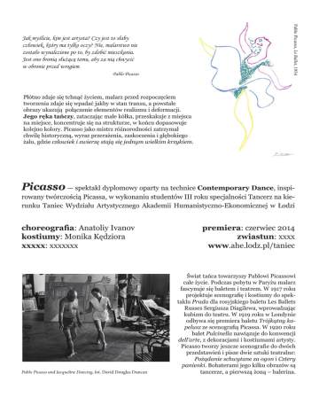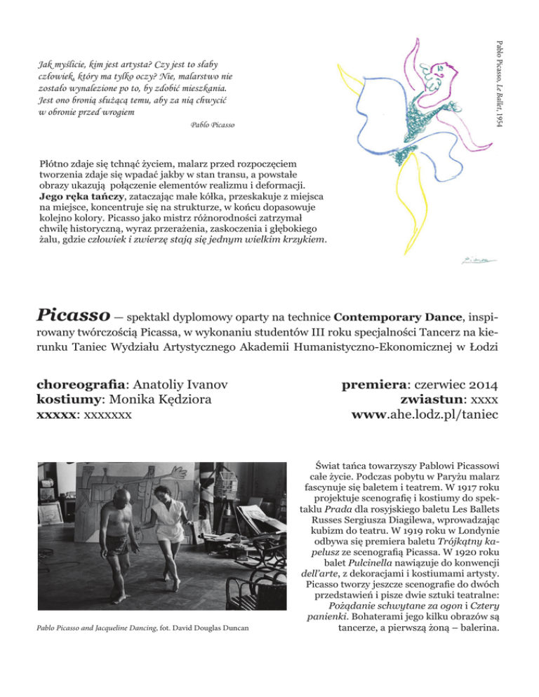 Pablo Picasso, Le Ballet, 1954 Jak myślicie, kim jest artysta? Czy jest to słaby człowiek, który ma tylko oczy? Nie, malarstwo nie zostało wynalezione po to, by zdobić mieszkania. Jest ono bronią służącą temu, aby za nią chwycić w obronie przed wrogiem Pablo Picasso Płótno zdaje się tchnąć życiem, malarz przed rozpoczęciem tworzenia zdaje się wpadać jakby w stan transu, a powstałe obrazy ukazują połączenie elementów realizmu i deformacji. Jego ręka tańczy, zataczając małe kółka, przeskakuje z miejsca na miejsce, koncentruje się na strukturze, w końcu dopasowuje kolejno kolory. Picasso jako mistrz różnorodności zatrzymał chwilę historyczną, wyraz przerażenia, zaskoczenia i głębokiego żalu, gdzie człowiek i zwierzę stają się jednym wielkim krzykiem. Picasso — spektakl dyplomowy oparty na technice Contemporary Dance, inspi- rowany twórczością Picassa, w wykonaniu studentów III roku specjalności Tancerz na kierunku Taniec Wydziału Artystycznego Akademii Humanistyczno-Ekonomicznej w Łodzi choreografia: Anatoliy Ivanov kostiumy: Monika Kędziora xxxxx: xxxxxxx Pablo Picasso and Jacqueline Dancing, fot. David Douglas Duncan premiera: czerwiec 2014 zwiastun: xxxx www.ahe.lodz.pl/taniec Świat tańca towarzyszy Pablowi Picassowi całe życie. Podczas pobytu w Paryżu malarz fascynuje się baletem i teatrem. W 1917 roku projektuje scenografię i kostiumy do spektaklu Prada dla rosyjskiego baletu Les Ballets Russes Sergiusza Diagilewa, wprowadzając kubizm do teatru. W 1919 roku w Londynie odbywa się premiera baletu Trójkątny kapelusz ze scenografią Picassa. W 1920 roku balet Pulcinella nawiązuje do konwencji dell’arte, z dekoracjami i kostiumami artysty. Picasso tworzy jeszcze scenografie do dwóch przedstawień i pisze dwie sztuki teatralne: Pożądanie schwytane za ogon i Cztery panienki. Bohaterami jego kilku obrazów są tancerze, a pierwszą żoną – balerina.