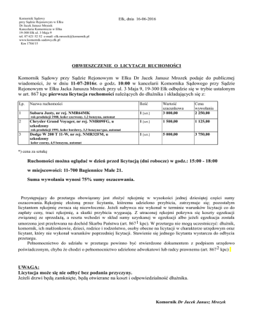 Komornik Sądowy przy Sądzie Rejonowym w Ełku Dr Jacek Janusz Mrozek Kancelaria Komornicza w Ełku 19-300 Ełk ul. 3 Maja 9 tel. 87 621 52 52 e-mail: [email protected] www.komornik-sadowy.elk.pl Km 1704/15 Ełk, dnia 16-06-2016 OBWIESZCZENIE O LICYTACJI RUCHOMOŚCI Komornik Sądowy przy Sądzie Rejonowym w Ełku Dr Jacek Janusz Mrozek podaje do publicznej wiadomości, że w dniu 11-07-2016r. o godz. 10:00 w kancelarii Komornika Sądowego przy Sądzie Rejonowym w Ełku Jacka Janusza Mrozek przy ul. 3 Maja 9, 19-300 Ełk odbędzie się w trybie ustalonym w art. 867 kpc pierwsza licytacja ruchomości należących do dłużnika i składających się z: Lp. Nazwa ruchomości Ilość 1 [szt.] Wartość szacunkowa 3 000,00 Cena wywołania 2 250,00 1 Subaru Justy, nr rej. NMR64MK 1 [szt.] 1 500,00 1 125,00 1 [szt.] 5 000,00 3 750,00 .rok produkcji 1988, kolor czerwony, 1,2 benzyna, automat 2 Chrysler Grand Voyager, nr rej. NMR09FG, u szkodzony .rok produkcji 1991, kolor bordowy, 3,3 benzyna+gaz, automat 3 Dodge W 200 T 11-W, nr rej. NMR32FM, u szkodzony .kolor czarny, 4,5 benzyna, automat *) cena za sztukę Ruchomości można oglądać w dzień przed licytacją (dni robocze) w godz.: 15:00 - 18:00 w miejscowości: 11-700 Bagiennice Małe 21. Suma wywołania wynosi 75% sumy oszacowania. Przystępujący do przetargu obowiązany jest złożyć rękojmię w wysokości jednej dziesiątej części sumy oszacowania. Rękojmię złożoną przez licytanta, któremu udzielono przybicia, zatrzymuje się; pozostałym licytantom rękojmię zwraca się niezwłocznie. Jeżeli nabywca nie wykonał w terminie warunków licytacji co do zapłaty ceny, traci rękojmię, a skutki przybicia wygasają. Z utraconej rękojmi pokrywa się koszty egzekucji związanej ze sprzedażą, a reszta wchodzi w skład sumy uzyskanej w egzekucji albo jeżeli egzekucja została umorzona jest przelewana na dochód Skarbu Państwa (art. 867 1 kpc). W przetargu nie mogą uczestniczyć: dłużnik, komornik, ich małżonkowie, dzieci, rodzice i rodzeństwo, osoby obecne na licytacji w charakterze urzędowym oraz licytant, który nie wykonał warunków poprzedniej licytacji. Stawienie się jednego licytanta wystarcza do odbycia przetargu. Pełnomocnictwo do udziału w przetargu powinno być stwierdzone dokumentem z podpisem urzędowo poświadczonym, chyba że chodzi o pełnomocnictwo udzielone adwokatowi lub radcy prawnemu (art. 867 2 kpc) UWAGA: Licytacja może się nie odbyć bez podania przyczyny. Jeżeli drzwi będą zamknięte, będą otwierane na koszt i odpowiedzialność dłużnika. Komornik Dr Jacek Janusz Mrozek