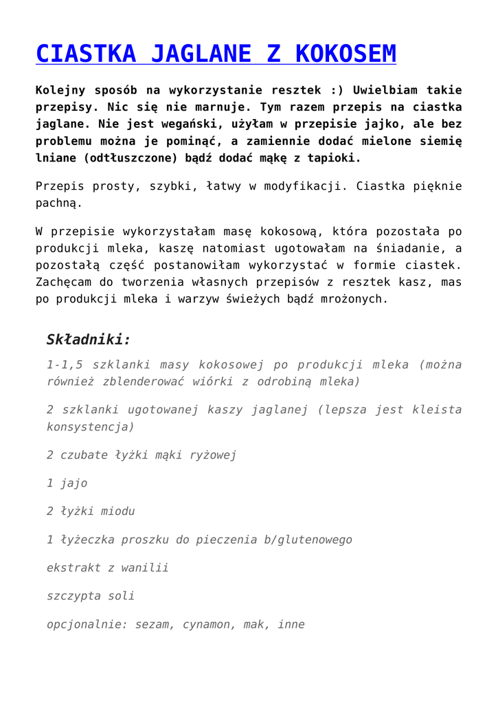 CIASTKA JAGLANE Z KOKOSEM Kolejny sposób na wykorzystanie resztek :) Uwielbiam takie przepisy. Nic się nie marnuje. Tym razem przepis na ciastka jaglane. Nie jest wegański, użyłam w przepisie jajko, ale bez problemu można je pominąć, a zamiennie dodać mielone siemię lniane (odtłuszczone) bądź dodać mąkę z tapioki. Przepis prosty, szybki, łatwy w modyfikacji. Ciastka pięknie pachną. W przepisie wykorzystałam masę kokosową, która pozostała po produkcji mleka, kaszę natomiast ugotowałam na śniadanie, a pozostałą część postanowiłam wykorzystać w formie ciastek. Zachęcam do tworzenia własnych przepisów z resztek kasz, mas po produkcji mleka i warzyw świeżych bądź mrożonych. Składniki: 1-1,5 szklanki masy kokosowej po produkcji mleka (można również zblenderować wiórki z odrobiną mleka) 2 szklanki ugotowanej kaszy jaglanej (lepsza jest kleista konsystencja) 2 czubate łyżki mąki ryżowej 1 jajo 2 łyżki miodu 1 łyżeczka proszku do pieczenia b/glutenowego ekstrakt z wanilii szczypta soli opcjonalnie: sezam, cynamon, mak, inne Przygotowanie Wszystkie składniki mieszamy dokładnie mikserem. Ja kaszy nie blenderowałam na gładko. Wolałam, aby część ziaren pozostała w całości. Można jednak masę zmielić na gładko. Jeśli mamy ochotę, pod koniec mieszania dodajemy świeże owoce (np. jagody), sezam czy mak bądź przyprawy. Blachę z piekarnika wykładamy papierem do pieczenia. Przy użyciu łyżki, wykładamy ciasto na papierze, tworząc okrągłe ciastka. Wstawiamy blachę (u mnie 2) do nagrzanego do 200st.C piekarnika. Pieczemy przez 30 minut. Następnie obniżamy temperaturę do 180st.C i kontynuujemy pieczenie przez 10 minut. Czas pieczenia zależy od wielkości i grubości ciastek. Można ciastka mrozić. Ciastka są dobrą przekąską na 2 śniadanie. Smacznego!