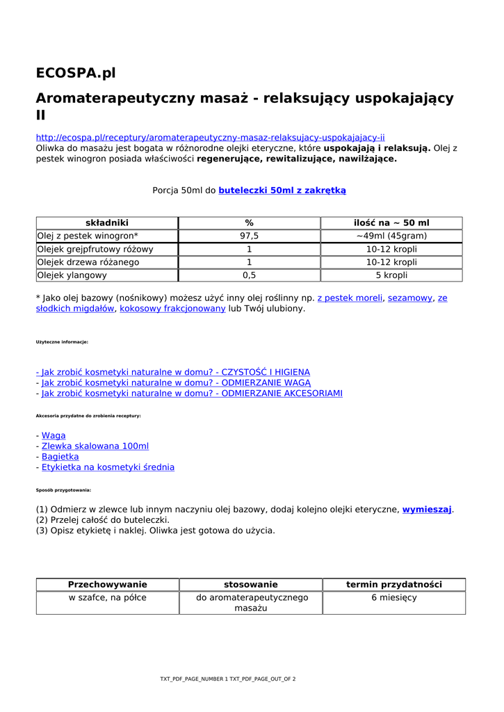 ECOSPA.pl Aromaterapeutyczny masaż - relaksujący uspokajający II http://ecospa.pl/receptury/aromaterapeutyczny-masaz-relaksujacy-uspokajajacy-ii Oliwka do masażu jest bogata w różnorodne olejki eteryczne, które uspokajają i relaksują. Olej z pestek winogron posiada właściwości regenerujące, rewitalizujące, nawilżające. Porcja 50ml do buteleczki 50ml z zakrętką składniki % ilość na ~ 50 ml 97,5 ~49ml (45gram) Olejek grejpfrutowy różowy 1 10-12 kropli Olejek drzewa różanego 1 10-12 kropli Olej z pestek winogron* Olejek ylangowy 0,5 5 kropli * Jako olej bazowy (nośnikowy) możesz użyć inny olej roślinny np. z pestek moreli, sezamowy, ze słodkich migdałów, kokosowy frakcjonowany lub Twój ulubiony. Użyteczne informacje: - Jak zrobić kosmetyki naturalne w domu? - CZYSTOŚĆ I HIGIENA - Jak zrobić kosmetyki naturalne w domu? - ODMIERZANIE WAGĄ - Jak zrobić kosmetyki naturalne w domu? - ODMIERZANIE AKCESORIAMI Akcesoria przydatne do zrobienia receptury: Waga Zlewka skalowana 100ml Bagietka Etykietka na kosmetyki średnia Sposób przygotowania: (1) Odmierz w zlewce lub innym naczyniu olej bazowy, dodaj kolejno olejki eteryczne, wymieszaj. (2) Przelej całość do buteleczki. (3) Opisz etykietę i naklej. Oliwka jest gotowa do użycia. Przechowywanie stosowanie termin przydatności w szafce, na półce do aromaterapeutycznego masażu 6 miesięcy TXT_PDF_PAGE_NUMBER 1 TXT_PDF_PAGE_OUT_OF 2 TXT_PDF_PAGE_NUMBER 2 TXT_PDF_PAGE_OUT_OF 2