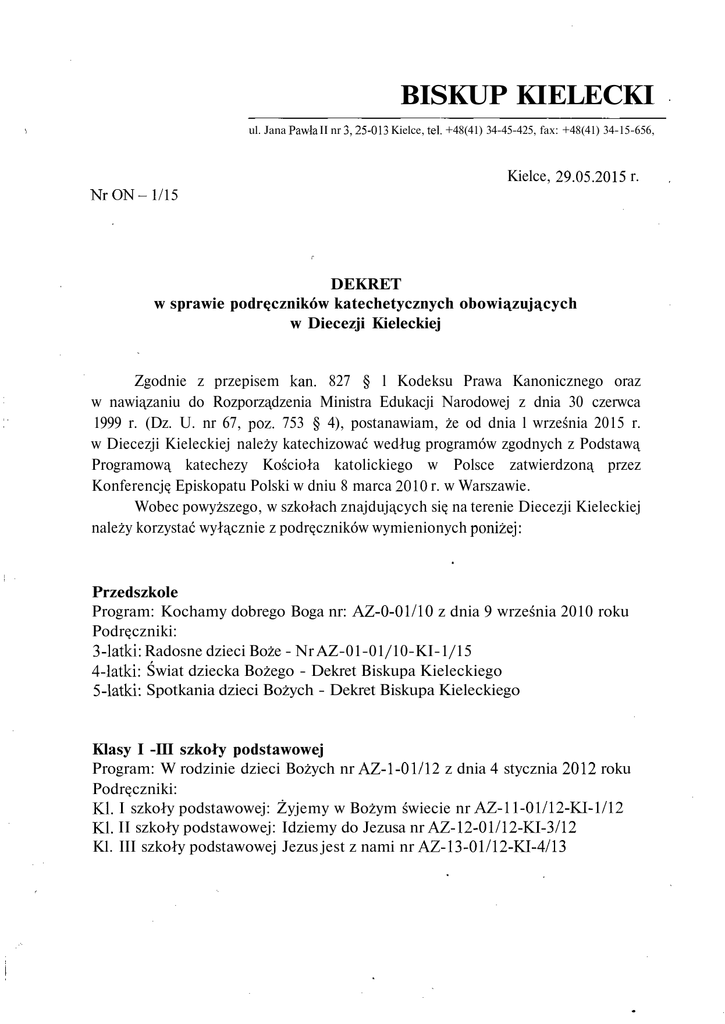 BISKUP KIELECKI ul. Jana Pawła II nr 3,25-013 Kielce, tel. +48(41) 34-45-425, fax: +48(41) 34-15-656, Nr ON-1/15 Kielce, 29.05.2015 r. DEKRET w sprawie podręczników katechetycznych obowiązujących w Diecezji Kieleckiej Zgodnie z przepisem kań. 827 § l Kodeksu Prawa Kanonicznego oraz w nawiązaniu do Rozporządzenia Ministra Edukacji Narodowej z dnia 30 czerwca 1999 r. (Dz. U. nr 67, póz. 753 § 4), postanawiam, że od dnia l września 2015 r. w Diecezji Kieleckiej należy katechizować według programów zgodnych z Podstawą Programową katechezy Kościoła katolickiego w Polsce zatwierdzoną przez Konferencję Episkopatu Polski w dniu 8 marca 2010 r. w Warszawie. Wobec powyższego, w szkołach znajdujących się na terenie Diecezji Kieleckiej należy korzystać wyłącznie z podręczników wymienionych poniżej: Przedszkole Program: Kochamy dobrego Boga nr: AZ-0-01/10 z dnia 9 września 2010 roku Podręczniki: 3-latki: Radosne dzieci Boże - Nr AZ-01-01/10-KI-1/15 4-latki: Świat dziecka Bożego - Dekret Biskupa Kieleckiego 5-latki: Spotkania dzieci Bożych - Dekret Biskupa Kieleckiego Klasy I -III szkoły podstawowej Program: W rodzinie dzieci Bożych nr AŻ-1-O l/l 2 z dnia 4 stycznia 2012 roku Podręczniki: Kl. I szkoły podstawowej: Żyjemy w Bożym świecie nr AZ-11-01/12-KI-1/12 Kl. II szkoły podstawowej: Idziemy do Jezusa nr AZ-12-01/12-KI-3/12 Kl. III szkoły podstawowej Jezus jest z nami nr AZ-13-01/12-KI-4/13