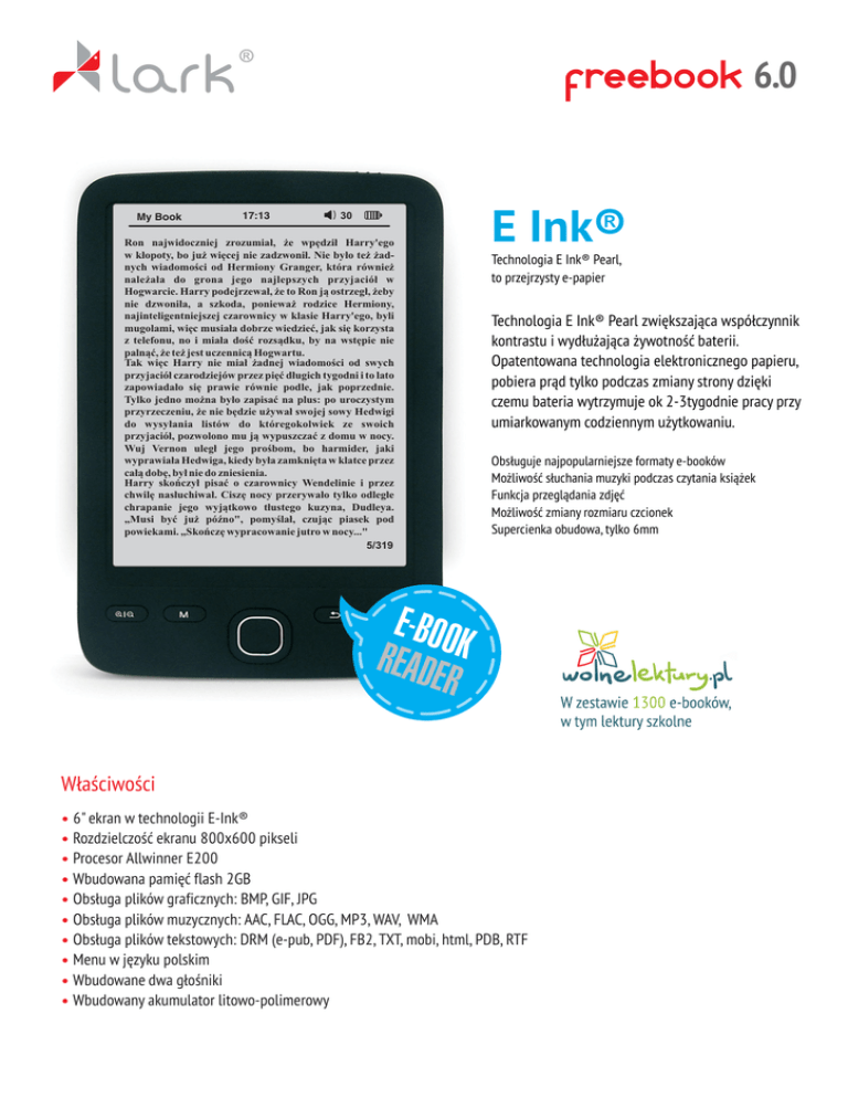 6.0 My Book 17:13 30 Ron najwidoczniej zrozumiał, że wpędził Harry'ego w kłopoty, bo już więcej nie zadzwonił. Nie było też żadnych wiadomości od Hermiony Granger, która również należała do grona jego najlepszych przyjaciół w Hogwarcie. Harry podejrzewał, że to Ron ją ostrzegł, żeby nie dzwoniła, a szkoda, ponieważ rodzice Hermiony, najinteligentniejszej czarownicy w klasie Harry'ego, byli mugolami, więc musiała dobrze wiedzieć, jak się korzysta z telefonu, no i miała dość rozsądku, by na wstępie nie palnąć, że też jest uczennicą Hogwartu. Tak więc Harry nie miał żadnej wiadomości od swych przyjaciół czarodziejów przez pięć długich tygodni i to lato zapowiadało się prawie równie podle, jak poprzednie. Tylko jedno można było zapisać na plus: po uroczystym przyrzeczeniu, że nie będzie używał swojej sowy Hedwigi do wysyłania listów do któregokolwiek ze swoich przyjaciół, pozwolono mu ją wypuszczać z domu w nocy. Wuj Vernon uległ jego prośbom, bo harmider, jaki wyprawiała Hedwiga, kiedy była zamknięta w klatce przez całą dobę, był nie do zniesienia. Harry skończył pisać o czarownicy Wendelinie i przez chwilę nasłuchiwał. Ciszę nocy przerywało tylko odległe chrapanie jego wyjątkowo tłustego kuzyna, Dudleya. „Musi być już późno", pomyślał, czując piasek pod powiekami. „Skończę wypracowanie jutro w nocy..." 5/319 E Ink® Technologia E Ink® Pearl, to przejrzysty e-papier Technologia E Ink® Pearl zwiększająca współczynnik kontrastu i wydłużająca żywotność baterii. Opatentowana technologia elektronicznego papieru, pobiera prąd tylko podczas zmiany strony dzięki czemu bateria wytrzymuje ok 2-3tygodnie pracy przy umiarkowanym codziennym użytkowaniu. Obsługuje najpopularniejsze formaty e-booków Możliwość słuchania muzyki podczas czytania książek Funkcja przeglądania zdjęć Możliwość zmiany rozmiaru czcionek Supercienka obudowa, tylko 6mm E-BOO READE K R Właściwości 6" ekran w technologii E-Ink® Rozdzielczość ekranu 800x600 pikseli Procesor Allwinner E200 Wbudowana pamięć flash 2GB Obsługa plików graficznych: BMP, GIF, JPG Obsługa plików muzycznych: AAC, FLAC, OGG, MP3, WAV, WMA Obsługa plików tekstowych: DRM (e-pub, PDF), FB2, TXT, mobi, html, PDB, RTF Menu w języku polskim Wbudowane dwa głośniki Wbudowany akumulator litowo-polimerowy www.lark.com.pl Follow us, we know the way Lark Europe Sp. z o.o. Matuszewska 14, 03-876 Warszawa tel. (22) 332 33 44, fax (22) 332 33 43 e-mail: [email protected]