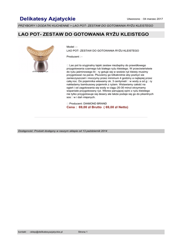 Delikatesy Azjatyckie Utworzono : 04 marzec 2017 PRZYBORY I DODATKI KUCHENNE > LAO POT- ZESTAW DO GOTOWANIA RYŻU KLEISTEGO LAO POT- ZESTAW DO GOTOWANIA RYŻU KLEISTEGO Model : LAO POT- ZESTAW DO GOTOWANIA RYŻU KLEISTEGO Producent : Lao pot to oryginalny tajski zestaw niezbędny do prawidłowego przygotowania czarnego lub białego ryżu kleistego. W przeciwieństwie do ryżu jaśminowego kt�ry gotuje się w wodzie ryż kleisty musimy przygotować na parze. Płuczemy go kilkakrotnie aby pozbyć sie zanieczyszczeń i moczymy przez minimum 4 godziny a najlepiej przez całą noc. Do pojemnika wlewamy ok. 3 centymetr�w wody a od g�ry nakładamy bambusowy pojemnik z ryżem. Wstawiamy całość na ogień i od zagotowania się wody w ciągu 20-30 minut otrzymamy wspaniale przygotowany ryż. Wbrew panującej opini z ryżu kleistego nie tylko przygotowuje się desery ale także podaje się go do pikantnych sos�w i dań mięsnych. Producent: DIAMOND BRAND Cena : 69,00 zł Brutto ( 69,00 zł Netto) Dostępność: Produkt dostępny w naszym sklepie od 13 październik 2014 kontakt : - [email protected] Strona 1