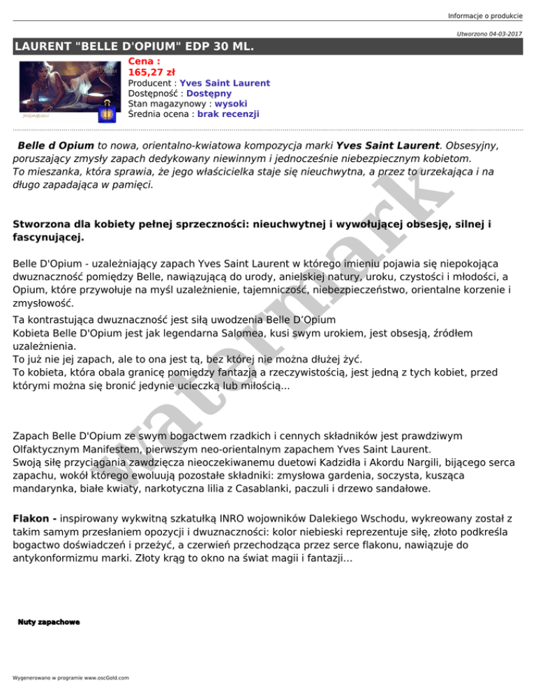 Informacje o produkcie Utworzono 04-03-2017 LAURENT "BELLE D'OPIUM" EDP 30 ML. Cena : 165,27 zł Producent : Yves Saint Laurent Dostępność : Dostępny Stan magazynowy : wysoki Średnia ocena : brak recenzji er m ar k Belle d Opium to nowa, orientalno-kwiatowa kompozycja marki Yves Saint Laurent. Obsesyjny, poruszający zmysły zapach dedykowany niewinnym i jednocześnie niebezpiecznym kobietom. To mieszanka, która sprawia, że jego właścicielka staje się nieuchwytna, a przez to urzekająca i na długo zapadająca w pamięci. Stworzona dla kobiety pełnej sprzeczności: nieuchwytnej i wywołującej obsesję, silnej i fascynującej. Belle D'Opium - uzależniający zapach Yves Saint Laurent w którego imieniu pojawia się niepokojąca dwuznaczność pomiędzy Belle, nawiązującą do urody, anielskiej natury, uroku, czystości i młodości, a Opium, które przywołuje na myśl uzależnienie, tajemniczość, niebezpieczeństwo, orientalne korzenie i zmysłowość. at Ta kontrastująca dwuznaczność jest siłą uwodzenia Belle D’Opium Kobieta Belle D'Opium jest jak legendarna Salomea, kusi swym urokiem, jest obsesją, źródłem uzależnienia. To już nie jej zapach, ale to ona jest tą, bez której nie można dłużej żyć. To kobieta, która obala granicę pomiędzy fantazją a rzeczywistością, jest jedną z tych kobiet, przed którymi można się bronić jedynie ucieczką lub miłością... w Zapach Belle D'Opium ze swym bogactwem rzadkich i cennych składników jest prawdziwym Olfaktycznym Manifestem, pierwszym neo-orientalnym zapachem Yves Saint Laurent. Swoją siłę przyciągania zawdzięcza nieoczekiwanemu duetowi Kadzidła i Akordu Nargili, bijącego serca zapachu, wokół którego ewoluują pozostałe składniki: zmysłowa gardenia, soczysta, kusząca mandarynka, białe kwiaty, narkotyczna lilia z Casablanki, paczuli i drzewo sandałowe. Flakon - inspirowany wykwitną szkatułką INRO wojowników Dalekiego Wschodu, wykreowany został z takim samym przesłaniem opozycji i dwuznaczności: kolor niebieski reprezentuje siłę, złoto podkreśla bogactwo doświadczeń i przeżyć, a czerwień przechodząca przez serce flakonu, nawiązuje do antykonformizmu marki. Złoty krąg to okno na świat magii i fantazji… Nuty zapachowe Wygenerowano w programie www.oscGold.com w at er m ar k Nuty głowy: brzoskwinia, biały pieprz. Nuty serca: lilia z Casablanki, kadzidło, absolut jaśminu. Baza: żywice, drewno sandałowe, kokos.