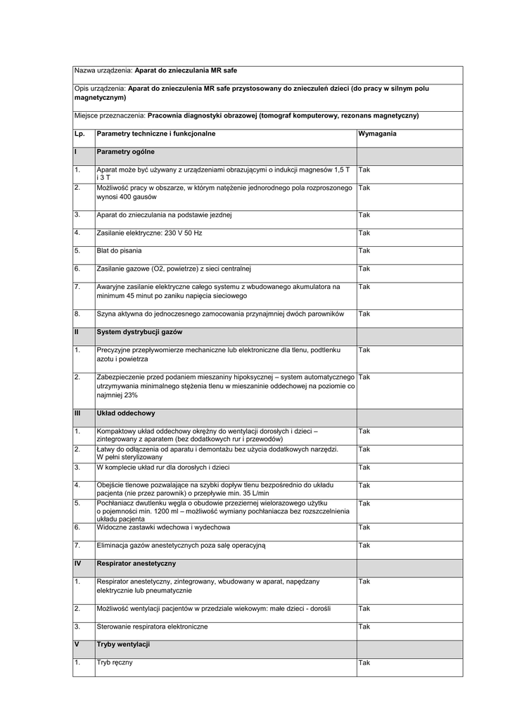 Nazwa urządzenia: Aparat do znieczulania MR safe Opis urządzenia: Aparat do znieczulenia MR safe przystosowany do znieczuleń dzieci (do pracy w silnym polu magnetycznym) Miejsce przeznaczenia: Pracownia diagnostyki obrazowej (tomograf komputerowy, rezonans magnetyczny) Lp. Parametry techniczne i funkcjonalne I Parametry ogólne 1. Aparat może być używany z urządzeniami obrazującymi o indukcji magnesów 1,5 T Tak i3T Możliwość pracy w obszarze, w którym natężenie jednorodnego pola rozproszonego Tak wynosi 400 gausów 2. Wymagania 3. Aparat do znieczulania na podstawie jezdnej Tak 4. Zasilanie elektryczne: 230 V 50 Hz Tak 5. Blat do pisania Tak 6. Zasilanie gazowe (O2, powietrze) z sieci centralnej Tak 7. Awaryjne zasilanie elektryczne całego systemu z wbudowanego akumulatora na minimum 45 minut po zaniku napięcia sieciowego Tak 8. Szyna aktywna do jednoczesnego zamocowania przynajmniej dwóch parowników Tak II System dystrybucji gazów 1. Precyzyjne przepływomierze mechaniczne lub elektroniczne dla tlenu, podtlenku azotu i powietrza 2. Zabezpieczenie przed podaniem mieszaniny hipoksycznej – system automatycznego Tak utrzymywania minimalnego stężenia tlenu w mieszaninie oddechowej na poziomie co najmniej 23% III Układ oddechowy 1. Kompaktowy układ oddechowy okrężny do wentylacji dorosłych i dzieci – zintegrowany z aparatem (bez dodatkowych rur i przewodów) Łatwy do odłączenia od aparatu i demontażu bez użycia dodatkowych narzędzi. W pełni sterylizowany W komplecie układ rur dla dorosłych i dzieci Tak Tak 6. Obejście tlenowe pozwalające na szybki dopływ tlenu bezpośrednio do układu pacjenta (nie przez parownik) o przepływie min. 35 L/min Pochłaniacz dwutlenku węgla o obudowie przeziernej wielorazowego użytku o pojemności min. 1200 ml – możliwość wymiany pochłaniacza bez rozszczelnienia układu pacjenta Widoczne zastawki wdechowa i wydechowa 7. Eliminacja gazów anestetycznych poza salę operacyjną Tak IV Respirator anestetyczny 1. Respirator anestetyczny, zintegrowany, wbudowany w aparat, napędzany elektrycznie lub pneumatycznie Tak 2. Możliwość wentylacji pacjentów w przedziale wiekowym: małe dzieci - dorośli Tak 3. Sterowanie respiratora elektroniczne Tak V Tryby wentylacji 1. Tryb ręczny 2. 3. 4. 5. Tak Tak Tak Tak Tak Tak 2. Oddech spontaniczny Tak 3. Wentylacja kontrolowana objętościowo VCV Tak 4. Synchronizowana przerywana wentylacja wymuszona, objętościowa SIMV Tak 5. Wentylacja wspomagana ciśnieniowo PS Tak 6. Wentylacja kontrolowana ciśnieniowo PCV Tak VI Regulacje 1. Regulacja stosunku wdechu do wydechu Minimum 3:1 do 1:4 2. Regulacja częstości oddechu Minimum 5 do 60 odd/min 3. Regulacja objętości oddechowej Minimum 20 do 1200 ml 4. PEEP – dodatnie ciśnienie końcowo wydechowe Minimum 4 do 20 cm H2O 5. Regulacja ciśnienia wdechu przy PCV Minimum 5 do 60 hPa 6. Regulacja pauzy wdechowej Minimum 5% do 50% czasu wdechu 7. Regulacja czułości wyzwalacza przepływowa lub ciśnieniowa przy SIMV Minimum 2 – 10 l/min lub 1 – 10 cmH2O VII Alarmy 1. Niskiej objętości minutowej lub niskiej objętości oddechowej Tak 2. Alarm maksymalnego ciśnienia wdechowego Tak 3. Alarm braku zasilania w energię elektryczną Tak 4. Alarm braku zasilania w gazy Tak 5. Możliwość wyciszenia alarmów dźwiękowych Tak VIII Pomiar i obrazowanie 1. Tak 2. Parametry mierzone i ustawiane prezentowane na zintegrowanym kolorowym ekranie o przekątnej min 7” Wdechowe stężenie tlenu w gazach oddechowych 3. Pomiar objętości oddechu Vt Tak 4. Pomiar objętości minutowej MV Tak 5. Ciśnienia szczytowego Tak 6. Ciśnienia Plateau Tak 7. Ciśnienia PEEP Tak 8. Obrazowanie krzywej ciśnienia Tak IX Parownik 1. Parownik do sevofluranu X Inne 1. Tryb czuwania w aparacie umożliwiający natychmiastowe uruchomienie bez konieczności pomijania lub ponownego przeprowadzania procedury testowej Dodatkowy niezależny przepływomierz tlenu umożliwiający kontrolowaną podaż tlenu przez maskę lub kaniulę donosową, zakres przepływów co najmniej 0 do 10 l/min 2. Tak 1 szt. z zabezpieczeniem typu Interlock Tak Tak