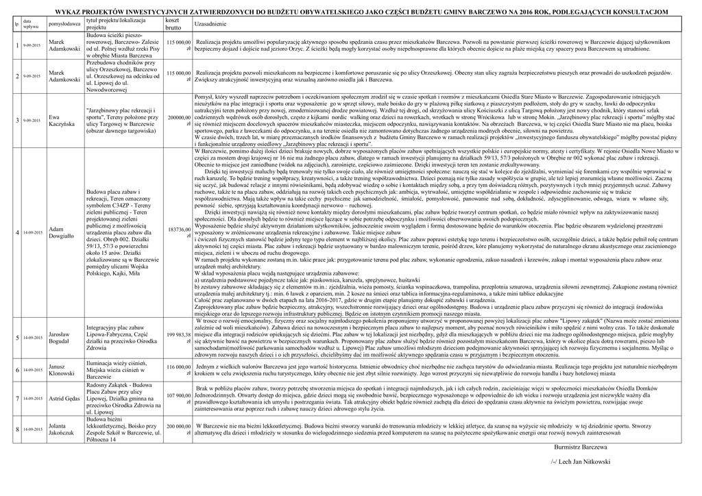 lp data wpływu WYKAZ PROJEKTÓW INWESTYCYJNYCH ZATWIERDZONYCH DO BUDŻETU OBYWATELSKIEGO JAKO CZĘŚCI BUDŻETU GMINY BARCZEWO NA 2016 ROK, PODLEGAJĄCYCH KONSULTACJOM koszt tytuł projektu\lokalizacja pomysłodawca Uzasadnienie projektu brutto 1 9-09-2015 Marek Adamkowski 2 9-09-2015 Marek Adamkowski Budowa ścieżki pieszorowerowej, Barczewo- Zalesie od ul. Polnej wzdłuż rzeki Pisy w obrębie Miasta Barczewa Przebudowa chodników przy ulicy Orzeszkowej, Barczewo ul. Orzeszkowej na odcinku od ul. Lipowej do ul. Nowodworcowej 115 000,00 Realizacja projektu umożliwi popularyzację aktywnego sposobu spędzania czasu przez mieszkańców Barczewa. Pozwoli na powstanie pierwszej ścieżki rowerowej w Barczewie dającej użytkownikom zł bezpieczny dojazd i dojście nad jezioro Orzyc. Z ścieżki będą mogły korzystać osoby niepełnosprawne dla których obecnie dojście na plaże miejską czy spacery poza Barczewem są utrudnione. 115 000,00 Realizacja projektu pozwoli mieszkańcom na bezpieczne i komfortowe poruszanie się po ulicy Orzeszkowej. Obecny stan ulicy zagraża bezpieczeństwu pieszych oraz prowadzi do uszkodzeń pojazdów. zł Zwiększy atrakcyjność inwestycyjną oraz wizualną zarówno osiedla jak i Barczewa. Ewa Kaczyńska "Jarzębinowy plac rekreacji i sportu", Tereny położone przy ulicy Targowej w Barczewie (obszar dawnego targowiska) 200000,00 zł 14-09-2015 Adam Dowgiałło Budowa placu zabaw i rekreacji, Teren oznaczony symbolem C34ZP - Tereny zieleni publicznej - Teren projektowanej zieleni publicznej z możliwością urządzenia placu zabaw dla dzieci. Obręb 002. Działki 59/13, 57/3 o powierzchni około 15 arów. Działki zlokalizowane są w Barczewie pomiędzy ulicami Wojska Polskiego, Kajki, Miła 183736,00 zł 5 14-09-2015 Jarosław Bogudał Integracyjny plac zabaw Lipowa-Fabryczna, Część działki na przeciwko Ośrodka Zdrowia 199 983,38 zł 6 14-09-2015 Janusz Klonowski 7 14-09-2015 Astrid Gędas 8 14-09-2015 Jolanta Jakończuk 3 4 9-09-2015 Pomysł, który wyszedł naprzeciw potrzebom i oczekiwaniom społecznym zrodził się w czasie spotkań i rozmów z mieszkańcami Osiedla Stare Miasto w Barczewie. Zagospodarowanie istniejących nieużytków na plac integracji i sportu oraz wyposażenie go w sprzęt siłowy, małe boisko do gry w plażową piłkę siatkową z piaszczystym podłożem, stoły do gry w szachy, ławki do odpoczynku uatrakcyjni teren położony przy nowej, zmodernizowanej drodze powiatowej. Wzdłuż tej drogi, od skrzyżowania ulicy Kościuszki z ulicą Targową położony jest nowy chodnik, który stanowi szlak codziennych wędrówek osób dorosłych, często z kijkami nordic walking oraz dzieci na rowerkach, wrotkach w stronę Wrócikowa lub w stronę Mokin. „Jarzębinowy plac rekreacji i sportu” mógłby stać się również miejscem docelowych spacerów mieszkańców miasteczka, miejscem odpoczynku, nawiązywania kontaktów. Na obrzeżach Barczewa, w tej części Osiedla Stare Miasto nie ma placu, boiska sportowego, parku z ławeczkami do odpoczynku, a na terenie osiedla nie zamontowano dotychczas żadnego urządzenia modnych obecnie, siłowni na powietrzu. W czasie dwóch, trzech lat, w miarę przeznaczanych środków finansowych z budżetu Gminy Barczewo w ramach realizacji projektów „inwestycyjnego funduszu obywatelskiego” mógłby powstać piękny i funkcjonalnie urządzony osiedlowy „Jarzębinowy plac rekreacji i sportu”. W Barczewie, pomimo dużej ilości dzieci brakuje nowych, dobrze wyposażonych placów zabaw spełniających wszystkie polskie i europejskie normy, atesty i certyfikaty. W rejonie Osiedla Nowe Miasto w części za mostem drogi krajowej nr 16 nie ma żadnego placu zabaw, dlatego w ramach inwestycji planujemy na działkach 59/13, 57/3 położonych w Obrębie nr 002 wykonać plac zabaw i rekreacji. Obecnie to miejsce jest zaniedbane (widok na zdjęciach), zarośnięte, częściowo zaśmiecone. Dzięki inwestycji teren ten zostanie zrekultywowany. Dzięki tej inwestycji maluchy będą trenowały nie tylko swoje ciało, ale również umiejętności społeczne: nauczą się stać w kolejce do zjeżdżalni, wymieniać się foremkami czy wspólnie wprawiać w ruch karuzelę. To będzie trening współpracy, kreatywności, a także trening współzawodnictwa. Dzieci poznają nie tylko zasady współżycia w grupie, ale też lepiej zrozumieją własne możliwości. Zaczną się uczyć, jak budować relacje z innymi rówieśnikami, będą zdobywać wiedzę o sobie i kontaktach między sobą, a przy tym doświadczą różnych, pozytywnych i tych mniej przyjemnych uczuć. Zabawy ruchowe, także te na placu zabaw, oddziałują na rozwój takich cech psychicznych jak: ambicja, wytrwałość, umiejętne współdziałanie w zespole i odpowiednie zachowanie się w trakcie współzawodnictwa. Mają także wpływ na takie cechy psychiczne jak samodzielność, śmiałość, pomysłowość, panowanie nad sobą, dokładność, zdyscyplinowanie, odwaga, wiara w własne siły, pewność siebie, sprzyjają kształtowaniu koordynacji nerwowo – ruchowej. Dzięki inwestycji nawiążą się również nowe kontakty między dorosłymi mieszkańcami, plac zabaw będzie tworzył centrum spotkań, co będzie miało również wpływ na zaktywizowanie naszej społeczności. Dla dorosłych będzie to również miejsce łączące w sobie potrzebę odpoczynku i możliwości obserwowania swoich podopiecznych. Wyposażenie będzie służyć aktywnym działaniom użytkowników, jednocześnie swoim wyglądem i formą dostosowane będzie do warunków otoczenia. Plac będzie obszarem wydzielonej przestrzeni wyposażony w zróżnicowane urządzenia rekreacyjne i zabawowe. Takie miejsce zabaw i ćwiczeń fizycznych stanowić będzie jedyny tego typu element w najbliższej okolicy. Plac zabaw poprawi estetykę tego terenu i bezpieczeństwo osób, szczególnie dzieci, a także będzie pełnił rolę centrum aktywności tej części miasta. Plac 