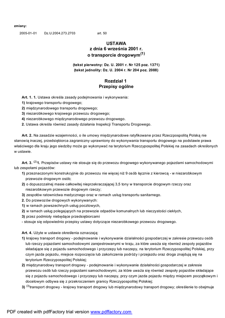 zmiany: 2005-01-01 Dz.U.2004.273.2703 art. 50 USTAWA z dnia 6 września 2001 r. o transporcie drogowym (1) (tekst pierwotny: Dz. U. 2001 r. Nr 125 poz. 1371) (tekst jednolity: Dz. U. 2004 r. Nr 204 poz. 2088) Rozdział 1 Przepisy ogólne Art. 1. 1. Ustawa określa zasady podejmowania i wykonywania: 1) krajowego transportu drogowego; 2) międzynarodowego transportu drogowego; 3) niezarobkowego krajowego przewozu drogowego; 4) niezarobkowego międzynarodowego przewozu drogowego. 2. Ustawa określa również zasady działania Inspekcji Transportu Drogowego. Art. 2. Na zasadzie wzajemności, o ile umowy międzynarodowe ratyfikowane przez Rzeczpospolitą Polską nie stanowią inaczej, przedsiębiorca zagraniczny uprawniony do wykonywania transportu drogowego na podstawie prawa właściwego dla kraju jego siedziby może go wykonywać na terytorium Rzeczypospolitej Polskiej na zasadach określonych w ustawie. Art. 3. (2) 1. Przepisów ustawy nie stosuje się do przewozu drogowego wykonywanego pojazdami samochodowymi lub zespołami pojazdów: 1) przeznaczonymi konstrukcyjnie do przewozu nie więcej niż 9 osób łącznie z kierowcą - w niezarobkowym przewozie drogowym osób; 2) o dopuszczalnej masie całkowitej nieprzekraczającej 3,5 tony w transporcie drogowym rzeczy oraz niezarobkowym przewozie drogowym rzeczy; 3) zespołów ratownictwa medycznego oraz w ramach usług transportu sanitarnego. 2. Do przewoz ów drogowych wykonywanych: 1) w ramach powszechnych usług pocztowych, 2) w ramach usług polegających na przewozie odpadów komunalnych lub nieczystości ciekłych, 3) przez podmioty niebędące przedsiębiorcami - stosuje się odpowiednio przepisy ustawy dotyczące niezarobkowego przewozu drogowego. Art. 4. Użyte w ustawie określenia oznaczają: 1) krajowy transport drogowy - podejmowanie i wykonywanie działalności gospodarczej w zakresie przewozu osób lub rzeczy pojazdami samochodowymi zarejestrowanymi w kraju, za które uważa się również zespoły pojazdów składające się z pojazdu samochodowego i przyczepy lub naczepy, na terytorium Rzeczypospolitej Polskiej, przy czym jazda pojazdu, miejsce rozpoczęcia lub zakończenia podróży i przejazdu oraz droga znajdują się na terytorium Rzeczypospolitej Polskiej; 2) międzynarodowy transport drogowy - podejmowanie i wykonywanie działalności gospodarczej w zakresie przewozu osób lub rzeczy pojazdami samochodowymi, za które uważa się również zespoły pojazdów składające się z pojazdu samochodowego i przyczepy lub naczepy, przy czym jazda pojazdu między miejscem początkowym i docelowym odbywa się z przekroczeniem granicy Rzeczypospolitej Polskiej; 3) (3) transport drogowy - krajowy transport drogowy lub międzynarodowy transport drogowy; określenie to obejmuje PDF created with pdfFactory trial version www.pdffactory.com również każdy przejazd drogowy wykonywany przez przedsiębiorcę pomocniczo w stosunku do podstawowej działalności gospodarczej, niespełniający warunków, o których mowa w pkt 4; 4) (4) 7) (5) niezarobkowy przewóz drogowy - przewóz na potrzeby własne - każdy przejazd pojazdu po drogach publicznych z pasażerami lub bez, załadowanego lub bez ładunku, przeznaczonego do nieodpłatnego krajowego i międzynarodowego przewozu drogowego osób lub rzeczy, wykonywany przez przedsiębiorcę pomocniczo w stosunku do jego podstawowej działalności gospodarczej, spełniający łącznie następujące warunki: a) pojazdy samochodowe używane do przewozu są prowadzone przez przedsiębiorcę lub jego pracowników, b) przedsiębiorca legitymuje się tytułem prawnym do dysponowania pojazdami samochodowymi, c) w przypadku przejazdu pojazdu załadowanego - rzeczy przewożone są własnością przedsiębiorcy lub zostały przez niego sprzedane, kupione, wynajęte, wydzierżawione, wyprodukowane, wydobyte, przetworzone lub naprawione albo celem przejazdu jest przewóz osób lub rzeczy z przedsiębiorstwa lub do przedsiębiorstwa na jego własne potrzeby, a także przewóz pracowników i ich rodzin, d) nie jest przewozem w ramach prowadzonej działalności gospodarczej w zakresie usług turystycznych; 5) niezarobkowy krajowy przewóz drogowy - przewóz na potrzeby własne wykonywany na terytorium Rzeczypospolitej Polskiej; 6) niezarobkowy międzynarodowy przewóz drogowy - przewóz na potrzeby własne wykonywany z przekroczeniem granicy Rzeczypospolitej Polskiej; przewóz regularny - publiczny przewóz osób i ich bagażu: a) wykonywany według rozkładu jazdy podanego przez przewoźnika drogowego do publicznej wiadomości przez ogłoszenie wywieszone na przystankach i dworcach autobusowych, b) podczas którego wsiadanie i wysiadanie pasażerów odbywa się na przystankach określonych w rozkładach jazdy, c) w którym należność za przejazd jest pobierana zgodnie z cennikiem opłat podanym do publicznej wiadomości, d) wykonywany zgodnie z warunkami przewozu osób określonymi w zezwoleniu, o którym mowa w art. 18; 7a) (6) komunikacja miejska - przewóz regularny wykonywany w ramach lokalnego transportu zbiorowego w granicach administracyjnych miasta albo: a) miasta i gminy, b) miast albo miast i gmin sąsiadujących - jeżeli zawarty porozumienie lub utworzyły związek międzygminny w sprawie wspólnej realizacji komunikacji na swoim obszarze; 8) (7) linia komunikacyjna - połączenie komunikacyjne na określonej drodze między przystankami wskazanymi w rozkładzie jazdy, po której odbywają się regularne przewozy osób; 8a) (8) przystanek - miejsce przeznaczone do wsiadania lub wysiadania pasażerów na danej linii komunikacyjnej, oznaczone w sposób określony w przepisach ustawy z dnia 20 czerwca 1997 r. - Prawo o ruchu drogowym (Dz. U. z 2003 r. Nr 58, poz. 515, z późn. zm. (9) ), z informacją o rozkładzie jazdy, z uwzględnieniem godzin odjazdów środków transportowych przewoźnika drogowego uprawnionego do korzystania z tego miejsca; 9) przewóz regularny specjalny - niepubliczny przew