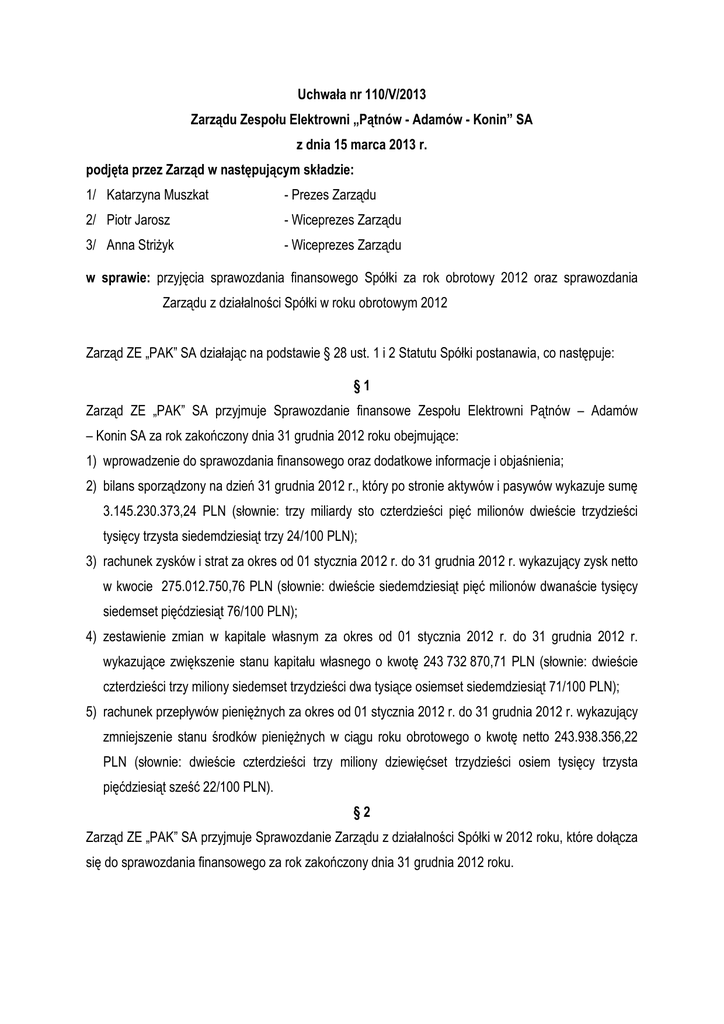 Uchwała nr 110/V/2013 Zarządu Zespołu Elektrowni „Pątnów - Adamów - Konin” SA z dnia 15 marca 2013 r. podjęta przez Zarząd w następującym składzie: 1/ Katarzyna Muszkat - Prezes Zarządu 2/ Piotr Jarosz - Wiceprezes Zarządu 3/ Anna StriŜyk - Wiceprezes Zarządu w sprawie: przyjęcia sprawozdania finansowego Spółki za rok obrotowy 2012 oraz sprawozdania Zarządu z działalności Spółki w roku obrotowym 2012 Zarząd ZE „PAK” SA działając na podstawie § 28 ust. 1 i 2 Statutu Spółki postanawia, co następuje: §1 Zarząd ZE „PAK” SA przyjmuje Sprawozdanie finansowe Zespołu Elektrowni Pątnów – Adamów – Konin SA za rok zakończony dnia 31 grudnia 2012 roku obejmujące: 1) wprowadzenie do sprawozdania finansowego oraz dodatkowe informacje i objaśnienia; 2) bilans sporządzony na dzień 31 grudnia 2012 r., który po stronie aktywów i pasywów wykazuje sumę 3.145.230.373,24 PLN (słownie: trzy miliardy sto czterdzieści pięć milionów dwieście trzydzieści tysięcy trzysta siedemdziesiąt trzy 24/100 PLN); 3) rachunek zysków i strat za okres od 01 stycznia 2012 r. do 31 grudnia 2012 r. wykazujący zysk netto w kwocie 275.012.750,76 PLN (słownie: dwieście siedemdziesiąt pięć milionów dwanaście tysięcy siedemset pięćdziesiąt 76/100 PLN); 4) zestawienie zmian w kapitale własnym za okres od 01 stycznia 2012 r. do 31 grudnia 2012 r. wykazujące zwiększenie stanu kapitału własnego o kwotę 243 732 870,71 PLN (słownie: dwieście czterdzieści trzy miliony siedemset trzydzieści dwa tysiące osiemset siedemdziesiąt 71/100 PLN); 5) rachunek przepływów pienięŜnych za okres od 01 stycznia 2012 r. do 31 grudnia 2012 r. wykazujący zmniejszenie stanu środków pienięŜnych w ciągu roku obrotowego o kwotę netto 243.938.356,22 PLN (słownie: dwieście czterdzieści trzy miliony dziewięćset trzydzieści osiem tysięcy trzysta pięćdziesiąt sześć 22/100 PLN). §2 Zarząd ZE „PAK” SA przyjmuje Sprawozdanie Zarządu z działalności Spółki w 2012 roku, które dołącza się do sprawozdania finansowego za rok zakończony dnia 31 grudnia 2012 roku. Uchwała Zarządu ZE „PAK” S.A. nr 110/V/2013 z dnia 15.03.2013 r. §3 Zarząd ZE „PAK” SA działając na podstawie § 28 ust. 1 pkt 3 Statutu Spółki postanawia: 1) przedłoŜyć Radzie Nadzorczej ZE „PAK” SA Sprawozdanie finansowe Zespołu Elektrowni Pątnów – Adamów – Konin SA za rok zakończony dnia 31 grudnia 2012 roku wraz z opinią i raportem biegłego rewidenta w celu uzyskania pisemnej opinii Rady Nadzorczej z oceny tego sprawozdania, 2) przedłoŜyć Radzie Nadzorczej ZE „PAK” SA Sprawozdanie Zarządu z działalności Spółki w 2012 roku w celu uzyskania pisemnej opinii Rady Nadzorczej z oceny tego sprawozdania. §4 Zarząd ZE „PAK” SA działając na podstawie § 28 ust. 2 Statutu spółki postanawia: 1) przedłoŜyć Zwyczajnemu Walnemu Zgromadzeniu Spółki, po uzyskaniu pisemnej opinii Rady Nadzorczej ZE „PAK” SA, o której mowa w § 3 pkt 1, Sprawozdanie finansowe Zespołu Elektrowni Pątnów – Adamów – Konin SA za rok zakończony dnia 31 grudnia 2012 roku wraz z opinią i raportem biegłego rewidenta w celu rozpatrzenia tego sprawozdania i jego zatwierdzenia, 2) przedłoŜyć Zwyczajnemu Walnemu Zgromadzeniu spółki, po uzyskaniu pisemnej opinii Rady Nadzorczej ZE „PAK” SA, o której mowa w § 3 pkt 2, Sprawozdanie Zarządu z działalności Spółki w 2012 roku w celu rozpatrzenia tego sprawozdania i jego zatwierdzenia. §5 Niniejsza Uchwała wchodzi w Ŝycie z dniem podjęcia. Podpisy Członków Zarządu: 1/ Katarzyna Muszkat 2/ Piotr Jarosz 2/ Anna StriŜyk