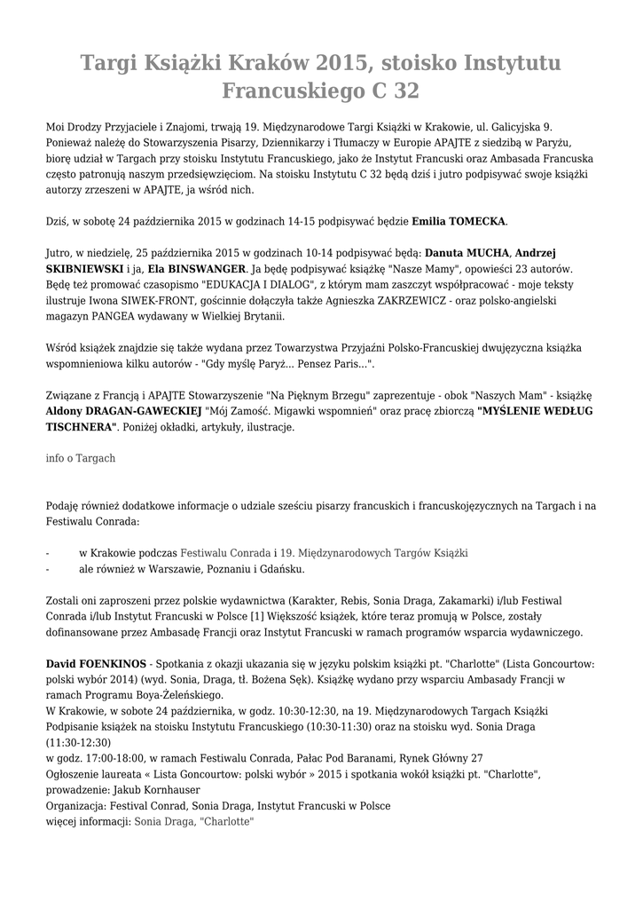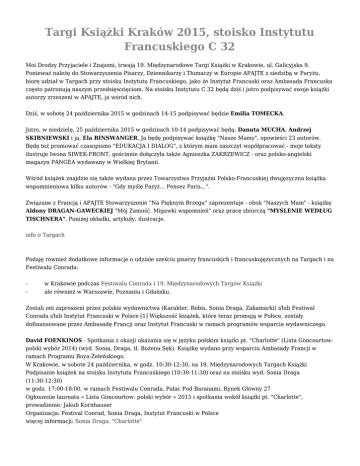 Targi Książki Kraków 2015, stoisko Instytutu Francuskiego C 32 Moi Drodzy Przyjaciele i Znajomi, trwają 19. Międzynarodowe Targi Książki w Krakowie, ul. Galicyjska 9. Ponieważ należę do Stowarzyszenia Pisarzy, Dziennikarzy i Tłumaczy w Europie APAJTE z siedzibą w Paryżu, biorę udział w Targach przy stoisku Instytutu Francuskiego, jako że Instytut Francuski oraz Ambasada Francuska często patronują naszym przedsięwzięciom. Na stoisku Instytutu C 32 będą dziś i jutro podpisywać swoje książki autorzy zrzeszeni w APAJTE, ja wśród nich. Dziś, w sobotę 24 października 2015 w godzinach 14-15 podpisywać będzie Emilia TOMECKA. Jutro, w niedzielę, 25 października 2015 w godzinach 10-14 podpisywać będą: Danuta MUCHA, Andrzej SKIBNIEWSKI i ja, Ela BINSWANGER. Ja będę podpisywać książkę "Nasze Mamy", opowieści 23 autorów. Będę też promować czasopismo "EDUKACJA I DIALOG", z którym mam zaszczyt współpracować - moje teksty ilustruje Iwona SIWEK-FRONT, gościnnie dołączyła także Agnieszka ZAKRZEWICZ - oraz polsko-angielski magazyn PANGEA wydawany w Wielkiej Brytanii. Wśród książek znajdzie się także wydana przez Towarzystwa Przyjaźni Polsko-Francuskiej dwujęzyczna książka wspomnieniowa kilku autorów - "Gdy myślę Paryż... Pensez Paris...". Związane z Francją i APAJTE Stowarzyszenie "Na Pięknym Brzegu" zaprezentuje - obok "Naszych Mam" - książkę Aldony DRAGAN-GAWECKIEJ "Mój Zamość. Migawki wspomnień" oraz pracę zbiorczą "MYŚLENIE WEDŁUG TISCHNERA". Poniżej okładki, artykuły, ilustracje. info o Targach Podaję również dodatkowe informacje o udziale sześciu pisarzy francuskich i francuskojęzycznych na Targach i na Festiwalu Conrada: - w Krakowie podczas Festiwalu Conrada i 19. Międzynarodowych Targów Książki ale również w Warszawie, Poznaniu i Gdańsku. Zostali oni zaproszeni przez polskie wydawnictwa (Karakter, Rebis, Sonia Draga, Zakamarki) i/lub Festiwal Conrada i/lub Instytut Francuski w Polsce [1] Większość książek, które teraz promują w Polsce, zostały dofinansowane przez Ambasadę Francji oraz Instytut Francuski w ramach programów wsparcia wydawniczego. David FOENKINOS - Spotkania z okazji ukazania się w języku polskim książki pt. "Charlotte" (Lista Goncourtow: polski wybór 2014) (wyd. Sonia, Draga, tł. Bożena Sęk). Książkę wydano przy wsparciu Ambasady Francji w ramach Programu Boya-Żeleńskiego. W Krakowie, w sobote 24 października, w godz. 10:30-12:30, na 19. Międzynarodowych Targach Książki Podpisanie książek na stoisku Instytutu Francuskiego (10:30-11:30) oraz na stoisku wyd. Sonia Draga (11:30-12:30) w godz. 17:00-18:00, w ramach Festiwalu Conrada, Pałac Pod Baranami, Rynek Główny 27 Ogłoszenie laureata « Lista Goncourtow: polski wybór » 2015 i spotkania wokół książki pt. "Charlotte", prowadzenie: Jakub Kornhauser Organizacja: Festival Conrad, Sonia Draga, Instytut Francuski w Polsce więcej informacji: Sonia Draga, "Charlotte" François ROSSET, profesor literatury francuskiej na Uniwersytecie w Lozannie. Razem z Dominique TRIAIRE, współautor biografii Jana Potockiego (WAB, 2006, tł. Anna Wasilewska - Książka wydana przy wsparciu Institut Français oraz Ambasady Francji w ramach Programu Boya-Żeleńskiego). W Krakowie w sobotę 24 pazdziernika, o godz. 15, w ramach Festiwalu Conrada, Pałac Pod Baranami, Rynek Główny 27 Spotkanie z Anna Wasilewska o dziele Jana Potockiego, prowadzenie: Tomasz Swoboda Organizacja: Festival Conrad więcej informacji: Wszyscy jesteśmy utrzymankami hrabiego Potockiego Benjamin CHAUD i Ramona BADESCU, autorzy i illustratorzy książek dla dzieci, wydanych w języku polskim przez wyd. Zakamarki (m.in. seria Pomelo). Książkę pt. "Pomelo i przeciwieństwa" wydano przy wsparciu Instytutu Francuskiego w ramach programów wsparcia wydawniczego. W Krakowie w sobote 24 października, o godz. 12:00, w ramach Festiwalu Conrad, Pałac Pod Baranami, Rynek Główny 27 Spotkanie wokół ich książek, prowadzenie: Tomasz Pindel w niedziele 25 października w godz. 11:00-13:00, na 19. Międzynarodowych Targach Książki Podpisanie książek na stoisku Cafe Szafe (A53) W Warszawie, w poniedzialek 26 października o godz. 11:00, w Akademii Sztuk Pięknych (Sala Kinowa), ul. Krakowskie Przedmieście 5 Spotkanie dla studentów i profesjonalistów zajmujących się książką dla dzieci, prowadzenie: Grażka Lange o godz. 18, w księgarnii Badet Wilanów, ul. Lentza 35a Spotkanie autorskie i warsztaty dla dzieci Zapisy: [email protected] – tel. : 22-499-37-17 W Poznaniu, we wtorek 27 października o godz. 15, w CK ZAMEK, Scena Nowa, ul. Św. Marcina 80/82 Spotkanie "Jak pracować z książkami o Pomelo w grupie przedszkolnej i wczesnoszkolnej. Spotkanie dla nauczycieli i studentów wstęp: 10 zł, zapisy : www.odn.poznan.pl – tel. 61-858-47-31 o godz. 18, CK ZAMEK, Hol Balkonowy, ul. Św. Marcina 80/82 Spotkanie autorskie i warsztaty dla dzieci Organizacja: Zakamarki, Festival Conrad więcej informacji: Zakamarki wydzarzenia Bernard MINIER, francuski autor thrillerów, laureat Nagrody za najlepszą powieść francuskojęzyczną 2015 na Polar Festival w Cognac. Spotkania z okazji ukazania się w języku polskim książki pt. "Paskudna historia" (wyd. Rebis, tł. Monika Osiecka) W Krakowie w niedziele, 25 października o godz. 13:00, na 19. Międzynarodowych Targach Książki Podpisanie książek na stoisku Rebis W Warszawie w poniedzialek, 26 października o godz. 18, Empik Junior, Marszałkowska 116 Spotkanie wokół jego powieści W Gdańsku we wtorek, 27 października o godz. 18:00, w Bibliotece Oliwskiej, ul. Opata J. Rybińskiego 9 Spotkanie wokół jego powieści Organizacja: Rebis więcej informacji: Rebis W listopadzie w Polsce będziemy mieli przyjemność gościć m.in.: - Hélène Carrère d’Encausse, historyk, specjalistka historii Rosji, członek i sekretarz Akademii Francuskiej, Tahar Ben Jelloun, marokański pisarz piszą