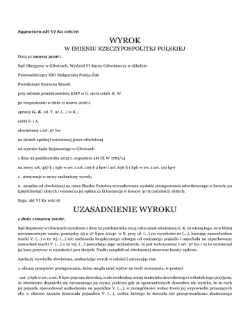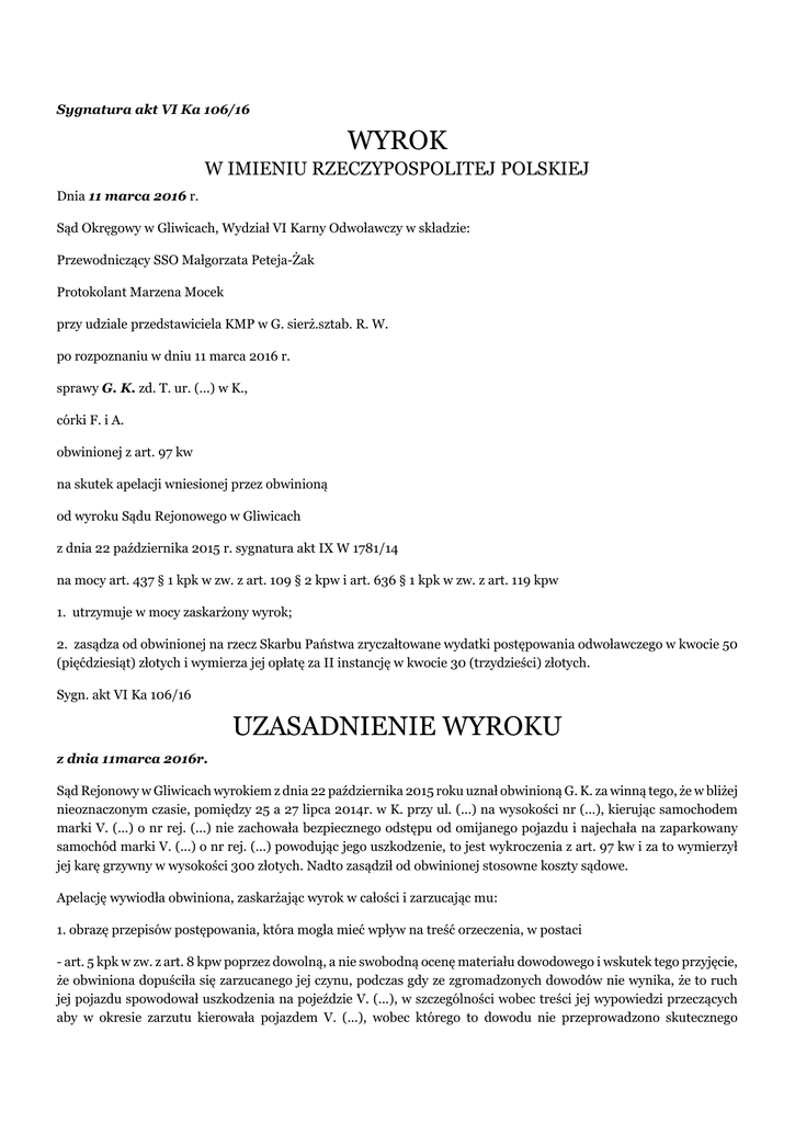 Sygnatura akt VI Ka 106/16 WYROK W IMIENIU RZECZYPOSPOLITEJ POLSKIEJ Dnia 11 marca 2016 r. Sąd Okręgowy w Gliwicach, Wydział VI Karny Odwoławczy w składzie: Przewodniczący SSO Małgorzata Peteja-Żak Protokolant Marzena Mocek przy udziale przedstawiciela KMP w G. sierż.sztab. R. W. po rozpoznaniu w dniu 11 marca 2016 r. sprawy G. K. zd. T. ur. (...) w K., córki F. i A. obwinionej z art. 97 kw na skutek apelacji wniesionej przez obwinioną od wyroku Sądu Rejonowego w Gliwicach z dnia 22 października 2015 r. sygnatura akt IX W 1781/14 na mocy art. 437 § 1 kpk w zw. z art. 109 § 2 kpw i art. 636 § 1 kpk w zw. z art. 119 kpw 1. utrzymuje w mocy zaskarżony wyrok; 2. zasądza od obwinionej na rzecz Skarbu Państwa zryczałtowane wydatki postępowania odwoławczego w kwocie 50 (pięćdziesiąt) złotych i wymierza jej opłatę za II instancję w kwocie 30 (trzydzieści) złotych. Sygn. akt VI Ka 106/16 UZASADNIENIE WYROKU z dnia 11marca 2016r. Sąd Rejonowy w Gliwicach wyrokiem z dnia 22 października 2015 roku uznał obwinioną G. K. za winną tego, że w bliżej nieoznaczonym czasie, pomiędzy 25 a 27 lipca 2014r. w K. przy ul. (...) na wysokości nr (...), kierując samochodem marki V. (...) o nr rej. (...) nie zachowała bezpiecznego odstępu od omijanego pojazdu i najechała na zaparkowany samochód marki V. (...) o nr rej. (...) powodując jego uszkodzenie, to jest wykroczenia z art. 97 kw i za to wymierzył jej karę grzywny w wysokości 300 złotych. Nadto zasądził od obwinionej stosowne koszty sądowe. Apelację wywiodła obwiniona, zaskarżając wyrok w całości i zarzucając mu: 1. obrazę przepisów postępowania, która mogła mieć wpływ na treść orzeczenia, w postaci - art. 5 kpk w zw. z art. 8 kpw poprzez dowolną, a nie swobodną ocenę materiału dowodowego i wskutek tego przyjęcie, że obwiniona dopuściła się zarzucanego jej czynu, podczas gdy ze zgromadzonych dowodów nie wynika, że to ruch jej pojazdu spowodował uszkodzenia na pojeździe V. (...), w szczególności wobec treści jej wypowiedzi przeczących aby w okresie zarzutu kierowała pojazdem V. (...), wobec którego to dowodu nie przeprowadzono skutecznego kontrdowodu, a nadto wobec treści znanej Sądowi I instancji prywatnej opinii rzeczoznawcy, zaprzeczającej aby uszkodzenia samochodu V. (...) powstały w trakcie jego ruchu, a co więcej wobec okoliczności wskazujących, że to pojazd V. (...) mógł najechać na V. (...) powodując powstałe na samochodach uszkodzenia, - art. 39 § 1 kpw w zw. z art. 170 § 1 kpk i art. 39 § 2 kpw poprzez nieujawnienie i niewłączenie do materiału dowodowego sprawy dowodu z opinii prywatnej rzeczoznawcy zawnioskowanej przez obrońcę w toku postępowania pierwszoinstancyjnego i nieuznanie go za dowód pomimo że stanowi takowy w rozumieniu przepisów kpk i kpw, - art. 39 § 1 kpw poprzez nieprzeprowadzenie z urzędu przez Sąd I instancji dowodu z opinii nowego biegłego z uwagi na sprzeczność wynikającą między opinią biegłego przeprowadzoną w toku postępowania i znaną Sądowi prywatną opinią specjalisty, celem ich rozstrzygnięcia i ustalenia mechanizmu powstania uszkodzeń samochodów V. (...) i V. (...); 2. błąd w ustaleniach faktycznych przyjętych za podstawę orzeczenia, który mógł mieć wpływ na jego treść, poprzez przyjęcie, że obwiniona najechała na zaparkowany pojazd marki V. (...) powodując jego uszkodzenie, podczas gdy w okresie zarzutu nie kierowała pojazdem V. (...), który miał przedmiotowe uszkodzenia spowodować. Obwiniona wniosła o dopuszczenie i przeprowadzenie dowodu z prywatnej opinii rzeczoznawcy wnioskowanej na etapie przed Sądem I instancji, nadto dowodu z opinii drugiego biegłego rzeczoznawcy na okoliczność określenia korelacji uszkodzeń obu pojazdów i sposobu ich powstania oraz o jej uniewinnienie. Sąd Okręgowy zważył, co następuje. Apelacja obwinionej nie zasługuje na uwzględnienie, a kontrola odwoławcza przeprowadzonego przez Sąd I instancji postępowania dowodowego, zaskarżonego orzeczenia, jego uzasadnienia oraz analiza uzasadnienia środka odwoławczego skutkują koniecznością uznania apelacji za niezasadną. Po pierwsze podkreślić należy, iż zarzut błędu w ustaleniach faktycznych, przyjętych za podstawę wyroku, jest tylko wówczas słuszny, gdy zasadność ocen i wniosków, wyprowadzonych przez Sąd orzekający z okoliczności ujawnionych w toku przewodu sądowego, nie odpowiada prawidłowości logicznego rozumowania. Zarzut ten nie może jednak sprowadzać się do samej polemiki z ustaleniami Sądu, wyrażonymi w uzasadnieniu wyroku, lecz do wykazania, jakich mianowicie konkretnych uchybień w zakresie logicznego rozumowania dopuścił się Sąd w ocenie zebranego materiału dowodowego. Możliwość zaś przeciwstawienia ustaleniom Sądu orzekającego odmiennego poglądu nie może prowadzić do wniosku o dokonanie przez Sąd błędu w ustaleniach faktycznych (wyrok Sądu Najwyższego z dnia 10 V 2005r., sygn. WA 12/05, OSNwSK 2005/1/949, wyrok Sądu Apelacyjnego w Katowicach w dnia 5 IV 2007r., sygn. II AKa 30/07, Prok.i Pr. 2007/11/32). Z kolei przekonanie Sądu o wiarygodności lub niewiarygodności określonych dowodów pozostaje pod ochroną zasady wyrażonej w art. 7 kpk wtedy tylko, kiedy spełnione są warunki: ujawnienia całokształtu okoliczności sprawy (art. 410 kpk) w granicach respektujących zasadę prawdy obiektywnej (art. 2 § 2 kpk), rozważenia wszystkich okoliczności zgodnie z zasadą określoną w art. 4 kpk oraz wyczerpującego i logicznego - z uwzględnieniem wskazań wiedzy i doświadczenia życiowego - uzasadnienia przekonania Sądu (art. 424 § 1 pkt 1 kpk) - postanowienie Sądu Najwyższego z dnia 14 XII 2006r., sygn. III KK 415/06, OSNwSK 2006/1/2452). Naruszenia powołanych wyżej zasad nie sposób dopatrzeć się analizując przebieg postępowania, zapadły wyrok oraz pisemne motywy zaskarżonego orzeczenia. Trzeba zatem podkreślić,