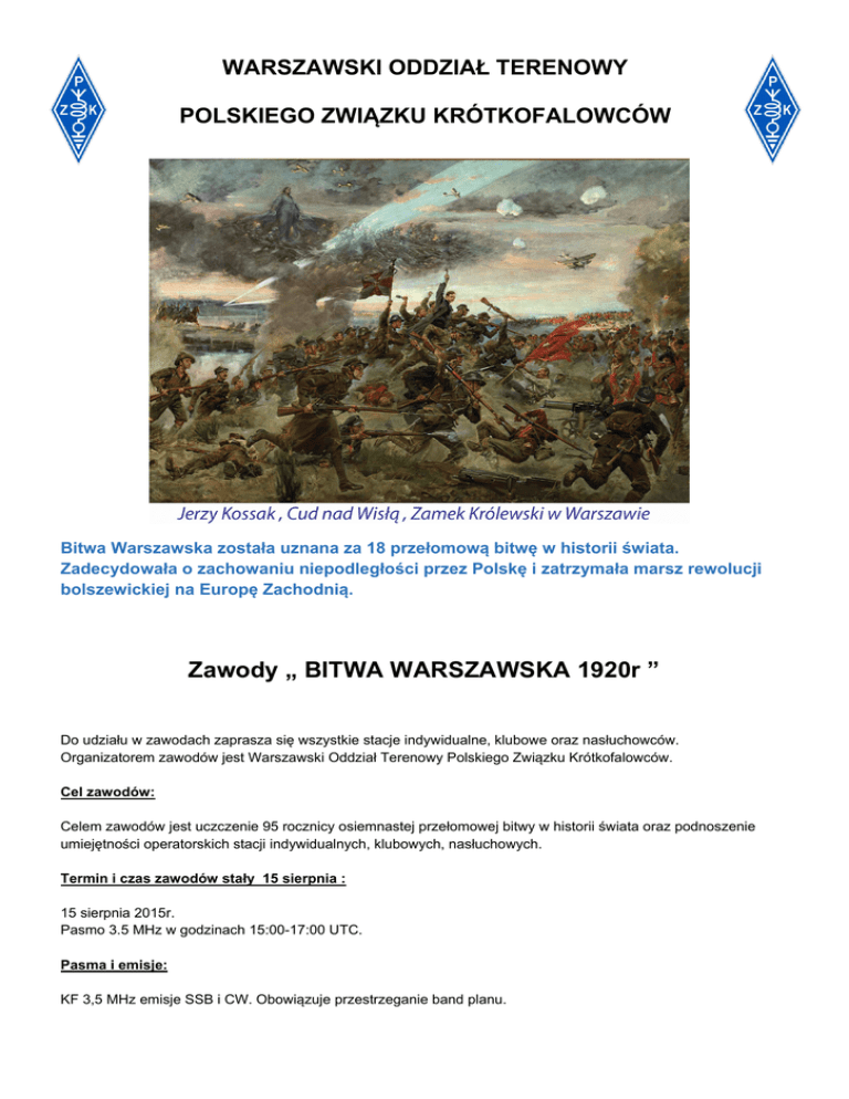 WARSZAWSKI ODDZIAŁ TERENOWY POLSKIEGO ZWIĄZKU KRÓTKOFALOWCÓW Bitwa Warszawska została uznana za 18 przełomową bitwę w historii świata. Zadecydowała o zachowaniu niepodległości przez Polskę i zatrzymała marsz rewolucji bolszewickiej na Europę Zachodnią. Zawody „ BITWA WARSZAWSKA 1920r ” Do udziału w zawodach zaprasza się wszystkie stacje indywidualne, klubowe oraz nasłuchowców. Organizatorem zawodów jest Warszawski Oddział Terenowy Polskiego Związku Krótkofalowców. Cel zawodów: Celem zawodów jest uczczenie 95 rocznicy osiemnastej przełomowej bitwy w historii świata oraz podnoszenie umiejętności operatorskich stacji indywidualnych, klubowych, nasłuchowych. Termin i czas zawodów stały 15 sierpnia : 15 sierpnia 2015r. Pasmo 3.5 MHz w godzinach 15:00-17:00 UTC. Pasma i emisje: KF 3,5 MHz emisje SSB i CW. Obowiązuje przestrzeganie band planu. Wywołanie w zawodach: Na CW - TEST SP, na fonii - WYWOŁANIE W ZAWODACH „ Bitwa Warszawska 1920r ”. Raporty i grupy kontrolne RS(T) + nr QSO (od 01) + trzy literowy skrót województwa i powiatu np. 59(9) 01 RWM. Numeracja łączności na SSB i CW ciągła. Punktacja Za QSO w pasmie KF na SSB 1 pkt, CW 2 pkt. Za QSO ze stacja z "RWM" SSB 2 pkt, CW 4 pkt. Z daną stacja można nawiązać dwie łączności, lecz różną emisją. Wynik końcowy Wynik końcowy zawodów stanowi suma punktów za QSO. Nie stosuje się mnożników. Łączności nie zalicza się w przypadku: - niezgodności grup kontrolnych - różnicy czasu ponad 3 minuty. Klasyfikacja: Za uczestnika zawodów uważa się stacje, która nawiąże min. 5 QSO, uczestnik zawodów może być sklasyfikowany wyłącznie w jednej kategorii: Kategoria A – SSB B – CW C – MIXED D – Kluby E - QRP F - SWL Znaczenie kategorii Stacje Indywidualne, emisja SSB Stacje Indywidualne, emisja CW Stacje Indywidualne, emisja MIXED - CW+SSB Stacje Klubowe MIXED, emisja CW+SSB Stacje Indywidualne i Klubowe QRP - 10W SSB, 5W CW, emisja MIXED – CW + SSB Nasłuchowcy Mixed emisja, CW+SSB Dzienniki zawodów: Dzienniki wyłącznie w postaci elektronicznej należy wysyłać na adres e-mail: [email protected] w terminie 7 dni. W temacie wiadomości e-mail należy podać wyłącznie znak wywoławczy. Plik z dziennikiem powinien być nazwany znakiem stacji, np. sp5abc.cbr Dzienniki stacji nasłuchowych muszą zawierać: datę i czas UTC, znak stacji, znaki korespondentów, oba raporty i grupy kontrolne. Jedna stacja może być wykazana w logu najwyżej dwa razy. Nagrody i wyróżnienia. Za pierwsze trzy miejsca w każdej kategorii uczestnik otrzyma wydrukowany dyplom. Wszyscy sklasyfikowani uczestnicy otrzymują dyplom w postaci elektronicznej ( PDF ) Wyniki. Wyniki zawodów zgłaszane oraz finałowe zostaną opublikowane na stronie WOT PZK: http://ot25.pzk.org.pl/, na portalach PZK, w Magazynach “Swiat Radio" “MK QTC" oraz rozesłane via e-mail. Termin zakończenia prac Komisji Zawodów - 15.09.2015r. Dyskwalifikacja. Podstawa do dyskwalifikacji może być: nie sportowe zachowanie, przekroczenie regulaminu i przepisów, nieprzestrzeganie band planu, źle wypełniony dziennik. Komisja zawodów. Skład komisji zawodów: Managerem Zawodów (przewodniczącym komisji zawodów) jest, Jurek SP5SSB/SN5B (członkowie) Basia SP5BS. Decyzje komisji zawodów są ostateczne. Uwagi końcowe W zawodach obowiązuje ograniczenie mocy nadajnika do 100W output. Zawody „ Bitwa Warszawska 1920r ” rozliczane są elektronicznie programami udostępnionymi i zaadaptowanymi przez Marka - SP7DQR. Adres strony, gdzie znajdują się darmowe programy umożliwiające przygotowanie pliku Cabrillo: http://www.sp7dqr.waw.pl SWL_DQR_Log - do logowania nasłuchów w czasie SWL_Cabrillo - do opracowania logów nasłuchowych po zawodach w przypadku logowania papierowego, DQR_Log - program dla nadawców do logowania łączności w czasie rzeczywistym, Cabrillo_gen – program do wprowadzenia łączności po zawodach w przypadku logowania papierowego. Komisja Zawodów, WOT PZK : SP5SSB/SN5B, SP5BS