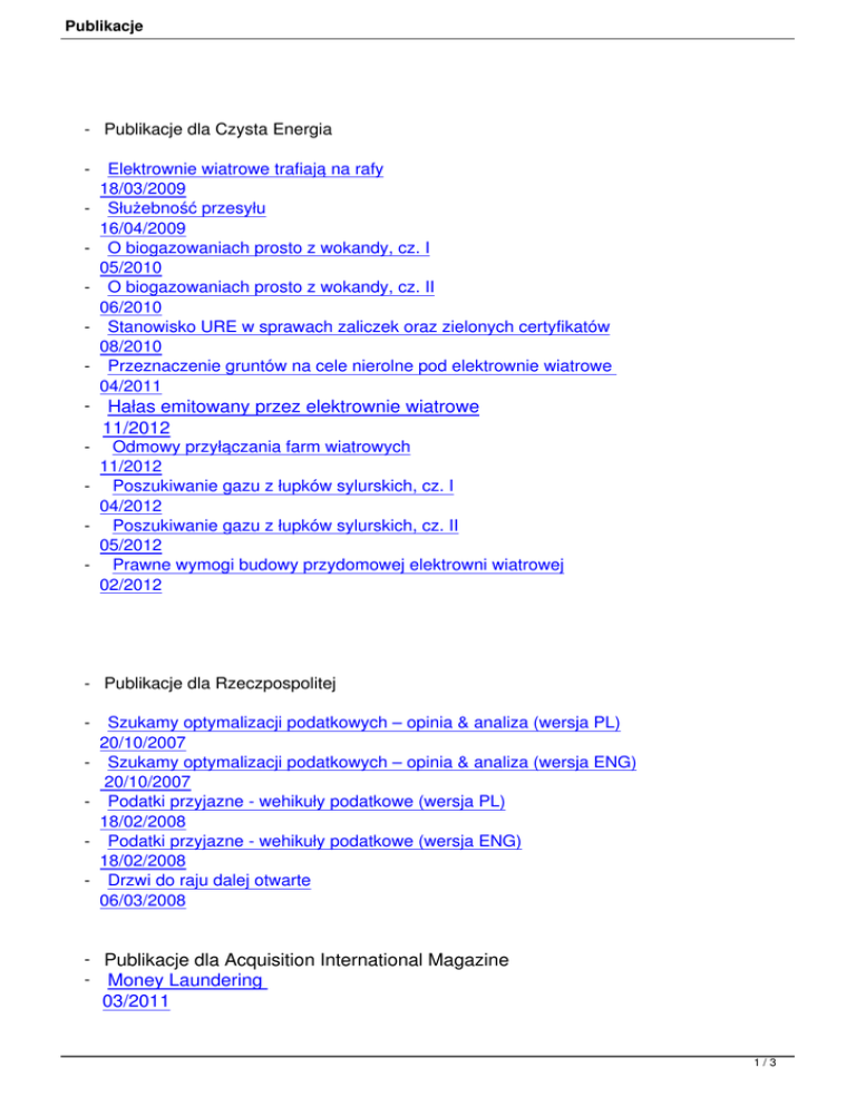 Publikacje - Publikacje dla Czysta Energia - Elektrownie wiatrowe trafiają na rafy 18/03/2009 Służebność przesyłu 16/04/2009 O biogazowaniach prosto z wokandy, cz. I 05/2010 O biogazowaniach prosto z wokandy, cz. II 06/2010 Stanowisko URE w sprawach zaliczek oraz zielonych certyfikatów 08/2010 Przeznaczenie gruntów na cele nierolne pod elektrownie wiatrowe 04/2011 Hałas emitowany przez elektrownie wiatrowe 11/2012 Odmowy przyłączania farm wiatrowych 11/2012 - Poszukiwanie gazu z łupków sylurskich, cz. I 04/2012 - Poszukiwanie gazu z łupków sylurskich, cz. II 05/2012 - Prawne wymogi budowy przydomowej elektrowni wiatrowej 02/2012 - Publikacje dla Rzeczpospolitej - Szukamy optymalizacji podatkowych – opinia & analiza (wersja PL) 20/10/2007 Szukamy optymalizacji podatkowych – opinia & analiza (wersja ENG) 20/10/2007 Podatki przyjazne - wehikuły podatkowe (wersja PL) 18/02/2008 Podatki przyjazne - wehikuły podatkowe (wersja ENG) 18/02/2008 Drzwi do raju dalej otwarte 06/03/2008 - Publikacje dla Acquisition International Magazine - Money Laundering 03/2011 1/3 Publikacje - Lead Mandate - Q1 Review 04/2011 - Publikacje dla Tygodnik Rolniczy - Wiatraki w pytaniach nr23/2009 - Publikacje dla GLOBEnergia - Rola doradców prawnych i podatkowych w procesie inwestowania w farmy wiatrowe 02/2009 - Publikacje dla Warsaw Business Journal - Korzyści ze zmiany rezydencji podatkowej Polaków pracujących w Austrii i Holandii (wersja PL) 29/10/2007 - Korzyści ze zmiany rezydencji podatkowej Polaków pracujących w Austrii i Holandii (wersja ENG) 29/10/2007 - Rola wehikułów typu REIT w unijnej konkurencji podatkowej (wersja PL) 12/05/2008 - Rola wehikułów typu REIT w unijnej konkurencji podatkowej (wersja ENG) 12/05/2008 - Publikacje dla Tax Notes International - Struggling Entrepreneurs Eligible for Tax Relief 03/12/2007 Legal Tax Avoidance in Poland 21/01/2008 Special Economic Zones in Poland 25/02/2008 Tax Rules for Polish Workers in Austria and the Netherlands 24/03/2008 Court Refers Shareholder Loan Taxation Case to ECJ 28/07/2008 Investors Gain New Tax Exemptions 15/09/2008 Sejm Passes Personal Income Tax Amendment 01/12/2008 Finance Ministry Highlights 2009 Tax Inspection Objectives 2/3 Publikacje 13/04/2009 - Publikacje dla International Bar Association - Government roundtable - cross-border initiatives and programmes 04/04/2008 - New Analysis: CCCTB Oponents Stake Out Different Positions 21/12/2008 - AML Amendment Poland 06/02/2009 - Dokumenty z Ministerstwa Finansów - Wyciąg z zadań Urzędów Kontroli Skarbowej na rok 2009 (wersja PL) 02/04/2009 - Wyciąg z zadań Urzędów Kontroli Skarbowej na rok 2009 (wersja ENG) 02/04/2009 3/3