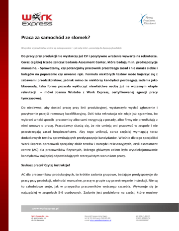 Praca za samochód ze słomek? Wszystkie wypowiedzi w tekście są autoryzowane i – jak cały tekst - pozostają do dyspozycji redakcji. Do pracy przy produkcji nie wystarczy już CV i pozytywne wrażenie wywarte na rekruterze. Coraz częściej trzeba zaliczyd badania Assesment Center, które badają m.in. predyspozycje manualne. - Sprawdzamy, czy potencjalny pracownik przestrzega zasad i nie naraża siebie i kolegów na poparzenie czy urwanie ręki. Formuła niektórych testów może kojarzyd się z zabawami przedszkolaków, jednak mimo że niektórzy kandydaci postrzegają zadania jako błazenadę, taka forma pozwala wykluczyd niewłaściwe osoby już na wczesnym etapie rekrutacji – mówi Joanna Wistuba z Work Express, certyfikowanej agencji pracy tymczasowej. Do niedawna, aby dostad pracę przy linii produkcyjnej, wystarczyło wysład zgłoszenie i pozytywnie przejśd rozmowę kwalifikacyjną. Dziś taka rekrutacja nie zdaje już egzaminu, bo wybrani w taki sposób pracownicy albo sami rezygnują z posady, albo firmy nie przedłużają z nimi umowy o pracę. Pracodawcy skarżą się, że nie umieją oni pracowad w zespole i nie przestrzegają zasad bezpieczeostwa. Aby tego uniknąd, coraz częściej wymagają teraz dodatkowych testów sprawdzających predyspozycje kandydatów. Właśnie dlatego specjaliści Work Express opracowali specjalny zbiór testów i narzędzi rekrutacyjnych, czyli assessment centre (AC) dla pracowników fizycznych, którego głównym celem było wyselekcjonowanie kandydatów najlepiej odpowiadających rzeczywistym warunkom pracy. Szukasz pracy? Czytaj instrukcje! AC dla pracowników produkcyjnych, to krótkie zadania grupowe, badające predyspozycje do pracy przy produkcji, zdolności manualne, pracę w grupie czy przestrzeganie instrukcji. Nie są to całodniowe sesje, jak w przypadku pracowników wyższego szczebla. Wykonuje się je najczęściej w zespołach 5-6 osobowych. Zadanie jest podzielone na części, które musimy www.workexpress.pl Work Express Sp. z o.o. ul. Murckowska 14 40-265 Katowice Rzecznik Prasowy: Artur Ragan tel: 32 721 5615, gsm: 513 015 260 e-mail: [email protected] NIP: 634-25-38-237 REGON: 278305758 KRS: 0000216937 rozwiązad indywidualnie albo z pomocą kontrkandydatów w działaniu zespołowym. Może polegad na przykład na zapewnieniu ciągłości dostaw z linii produkcyjnej do magazynu. Rozwiązując zadanie musimy zadbad m.in. o materiały, wielkośd dostawy i transport. - Badamy w nich m.in. zdolności organizacyjne, przewidywania problemów i predyspozycje manualne, które mają odzwierciedlenie w warunkach produkcyjnych. Sprawdzamy, czy kandydat przestrzega zasad i nie naraża siebie bądź kolegów na poparzenie czy urwanie ręki. Jak wynika z naszych obserwacji, działanie zgodnie z procedurami jest niestety największym problemem kandydatów – opowiada Joanna Wistuba z Work Express, jednej z najszybciej rozwijających się agencji pracy tymczasowej w Polsce. Dodaje, że zdarzało się nawet odrzucid całą grupę. Brak przestrzegania zasad jest bowiem sygnałem, że skoro pracownik nie respektuje ich podczas zabawy, to też nie będzie ich stosował w pracy. Pracownik „szyty na miarę” Jedna sesja AC trwa od 40 minut do godziny. Po upływie czasu przeznaczonego na testy, następuje omówienie zadania. Kandydaci mówią, co zrobiliby inaczej, gdyby mieli możliwośd powtórzenia testu albo wyjaśniają motywy swojego postępowania przy danym etapie zadania. Pozwala to zweryfikowad spostrzeżenia asesorów, czyli rekruterów oceniających kandydatów. - Jeśli kandydaci potrafią logicznie wytłumaczyd swoje działanie lub dostrzegają swoje błędy, to zapraszamy ich do kolejnego etapu rekrutacji, w którym staramy się jeszcze lepiej poznad aplikanta. Pracodawcy chwalą sobie takie działanie, gdyż ogranicza to nie tylko rotacje pracowników, ale pozwala też lepiej dopasowad kandydata do organizacji – mówi Joanna Strona 2 Wistuba z Work Express. www.workexpress.pl Work Express Sp. z o.o. ul. Murckowska 14 40-265 Katowice Rzecznik Prasowy: Artur Ragan tel: 32 721 5615, gsm: 513 015 260 e-mail: [email protected] NIP: 634-25-38-237 REGON: 278305758 KRS: 0000216937 Zdarzają się osoby, które od razu narzucają swoje zdanie i wyrastają na lidera. Zgłaszają się też kandydaci bardzo wycofani, którym nieśmiałośd przeszkadza w pracy zespołowej. To jest problem, gdyż praca przy produkcji wymaga współdziałania z innymi pracownikami. Odrzucony, ale nie zdyskwalifikowany Brak pozytywnego wyniku w testach AC, nie dyskwalifikuje kandydata do pracy w innym zakładzie pracy. Taki AC każdorazowo jest indywidualnie dostosowywany do potrzeb danego pracodawcy i wspólnie z jego przedstawicielami weryfikowany pod kątem identyfikacji niezbędnych na danym stanowisku kompetencji. Specjalistka Work Express zwraca uwagę, że klienci rzadko poszukują tych samych „zestawów” kompetencji. Może się okazad, że cechy, które zdyskwalifikowały danego kandydata w jednym procesie rekrutacji, akurat ceni inny pracodawca. Osoby, które nie zaliczą testów powinny wyciągnąd wnioski. One wiedzą już, jak wyglądają takie testy, więc będą miały łatwiej przy kolejnych naborach. Za stary na samochód ze słomek i spinaczy Aplikujący na dane stanowisko, już podczas pierwszej telefonicznej rozmowy i zaproszenia do udziału w procesie rekrutacji, informowani są o jego przebiegu. - To, jakie były opinie na temat rekrutacji zależało od tego, jakie było zadanie. Kandydaci raczej nie lubią zadao kreatywnych, jak na przykład złożenie auta ze słomek i spinaczy. Natomiast z ostatniego zadania byli bardzo zadowoleni, dlatego że było ono mocno złożone, wymagające, ale przez to ciekawe. Wielu chciało zakupid naszą konstrukcję jako zabawkę edukacyjną dla swoich dzieci – śmieje się Joanna Wistuba z innowacyjnej agencji Work Express. Dodaje, że dotychczas nie spotkała się z negatywnymi opiniami. O t