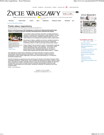 Polski siłacz nagrodzony - śycie Warszawy 1z1 http://www.zw.com.pl/artykul/247150.html kup bilet | księgarnia | nieruchomości | ePapier | napisz do nas | | więcej kanałów RSS +zaawansowane | pomoc Środa 14 maja 2008 Bonifacego, Dobiesława, Macieja | 10°C | DuŜy Lotek: 3, 6, 23, 31, 32, 37 | Do Euro 2012 pozostało 1486 dni reklama Warszawa Polska i Świat Kultura Sport Kalejdoskop Wyłowione z Wisły Niezbędnik rp.pl zw.com.pl » Warszawa » Edukacja Polski siłacz nagrodzony Monika Leśniewicz 06-05-2008, ostatnia aktualizacja 06-05-2008 19:47 Studenci Koła Naukowego SAE działającego na Politechnice Warszawskiej zajęli drugie miejsce na międzynarodowych zawodach Aerodesign East w Marietta koło Atlanty . To juŜ kolejny sukces przyszłych inŜynierów na międzynarodowych zawodach w projektowaniu udźwigowych modeli latających. Samolot zbudowany przez grupę 15 studentów podniósł cięŜar 10 kg, przy masie własnej 3,5 kg. Nagroda jest powtórką zeszłorocznego wyniku. źródło: śycie Warszawy Samolot zbudowany przez studentów PW moŜe m.in. przenosić aparaturę pomiarową w miejsca, gdzie nie dotrze maszyna pilotowana przez człowieka +zobacz więcej Na pierwszym miejscu, podobnie ja rok temu, znalazła się druŜyna z Brazylii. W zawodach startowała równieŜ druŜyna z Politechniki Poznańskiej, jednak nie udało się jej zająć punktowanego miejsca. – Drugie miejsce to dla nas ogromny sukces i potwierdzenie wysokiego poziomu projektu, tak jak w roku ubiegłym – mówi Marcin Chilik, członek Studenckiego Koła Naukowego SAE. Tym bardziej Ŝe konkurencja była duŜa. Najbardziej obawialiśmy się druŜyny z Brazylii, gdzie organizowana jest lokalna edycja konkursu – dodaje. NAJCZĘŚCIEJ CZYTANE 24h 7dni 30dni Bezmyślny odstrzał? Druga linia metra na Euro, ale 2016 Szybki pociąg zbliŜa się do Warszawy Al. Prymasa: nowy asfalt, nici z kasy Jak ratusz przystanek forsuje Jak wyjaśniają na swojej stronie internetowej członkowie koła SAE, do budowy samolotu wykorzystano najnowsze materiały konstrukcyjne – główne elementy zostały wykonane z kompozytów na bazie włókna węglowego oraz kevlaru (wykorzystywanego np. w strukturach kamizelek kuloodpornych). Kameralnie przy Kolskiej Zawody Aerodesign są organizowane przez stowarzyszenie Society of Automotive Engineers (SAE) zrzeszające inŜynierów z całego świata. Celem zawodów jest zbudowanie modelu (w jednej z trzech klas) o największym udźwigu. Startujące druŜyny muszą równieŜ przekonać sędziów do słuszności zastosowanych przez siebie rozwiązań podczas prezentacji poprzedzającej zasadniczą część zawodów. Zawody dzielą się na dwie edycje: wschodnią i zachodnią. Ich sponsorem jest firma Lockheed Martin. Przyspieszenie na kolei Beckham: Na Euro wyjdziecie z grupy Wilanów bez buławy? Josef Fritzl wyznał: gwałciłem moją córkę Źródło : śycie Warszawy Reklama | O nas | Kontakt © Copyright by Presspublica Sp. z o.o. 2008-05-14 11:57