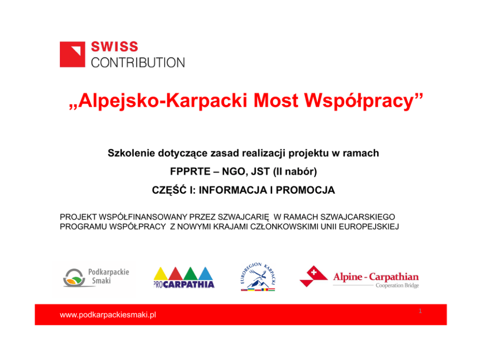 „Alpejsko-Karpacki Most Współpracy” Szkolenie dotyczące zasad realizacji projektu w ramach FPPRTE – NGO, JST (II nabór) CZĘŚĆ I: INFORMACJA I PROMOCJA PROJEKT WSPÓŁFINANSOWANY PRZEZ SZWAJCARIĘ W RAMACH SZWAJCARSKIEGO PROGRAMU WSPÓŁPRACY Z NOWYMI KRAJAMI CZŁONKOWSKIMI UNII EUROPEJSKIEJ www.podkarpackiesmaki.pl 1 Cele działań informacyjnych i promocyjnych w ramach Szwajcarsko-Polskiego Programu Współpracy (SPPW): • informowanie opinii publicznej o SPPW, jego realizacji i wynikach, • informowanie potencjalnych Beneficjentów o Programie i zachęcanie ich do udziału, • motywowanie i wspieranie Beneficjentów w poprawnej i efektywnej realizacji projektów, • promowanie celów SPPW, tj. zmniejszania róŜnic społeczno-gospodarczych w UE i w Polsce, • promowanie, wspieranie i zachęcanie do dialogu i współpracy pomiędzy przedstawicielami sektora publicznego, prywatnego i pozarządowego, • zapewnienie przejrzystości, w szczególności w zakresie wyboru projektów, kontraktacji i zarządzania finansowego. www.podkarpackiesmaki.pl 2 Zobowiązania beneficjenta Beneficjent zobowiązany jest zadbać aby informacja o projekcie i sposobach jego finansowania dotarła zarówno do: a) otoczenia projektu, tj. społeczności lokalnej, sektora prywatnego, publicznego i pozarządowego, lokalnych mediów itd., b) odbiorców projektu, np. uczestników targów, warsztatów, szkoleń dofinansowanych w ramach projektu. • Działania informacyjne i promocyjne, podejmowane przez Beneficjentów, powinny zostać udokumentowane. W zaleŜności od specyfiki projektu i działań podejmowanych w ramach projektu, dokumentacja taka moŜe np. obejmować fotografie, zapisy audio i / lub video, wycinki prasowe, wydruki z wybranych stron internetowych itp., • Beneficjenci powinni przechowywać dokumentację działań informacyjnych i promocyjnych przez okres 10 lat po zakończeniu projektu. www.podkarpackiesmaki.pl 3 Działania informacyjne i promocyjne moŜna realizować poprzez: • konferencje otwierające / informacyjne, imprezy promocyjne / skierowane do ogółu społeczności (fora, targi, dni otwarte), • - kontakty z mediami: konferencje prasowe, briefingi, wywiady, materiały prasowe, informacje prasowe, biuletyny informacyjne, artykuły itp., spoty reklamowe, filmy promocyjne, audycje radiowe i telewizyjne, • punkty informacyjne, • publikacje w formie elektronicznej i papierowej (broszury, foldery, ulotki itp.), • strony internetowe, • warsztaty, • inne materiały promocyjne, itp. www.podkarpackiesmaki.pl 4 Informacja i promocja Działania informacyjno-promocyjne rozpoczynamy od dn. rozpoczęcia realizacji projektu (okres kwalifikowalności) zgodnie z podpisaną Umową o dofinansowanie projektu i trwają one przez cały okres jej obowiązywania. Zasady oznakowania projektów: I. Stosowanie systemu identyfikacji wizualnej, II. Umieszczanie informacji o współfinansowaniu w ramach Szwajcarsko-Polskiego Programu Współpracy (SPPW). www.podkarpackiesmaki.pl 5 Oznakowanie dokumentów Beneficjent zobowiązany jest do oznakowania dokumentów dotyczących realizacji projektu (system identyfikacji wizualnej oraz umieszczanie informacji o współfinansowaniu SPPW). Obowiązkowi oznakowania podlegają w szczególności następujące dokumenty: • • • • • korespondencja papierowa prowadzona w sprawie projektu, ogłoszenia dotyczące przetargów, dokumentacja przetargowa, umowy zawarte z wykonawcami, certyfikaty, świadectwa, dyplomy itp. Obowiązkowi oznakowania nie podlegają dokumenty finansowe i księgowe – faktury, rachunki (choć naleŜy je opisać na odwrocie). www.podkarpackiesmaki.pl 6 System identyfikacji wizualnej (I) a) Logo Swiss Contribution Wszystkie materiały informacyjne i promocyjne muszą być opatrzone logotypem Swiss Contribution. Dotyczy: • materiałów drukowanych, • materiałów promocyjnych, • stron internetowych, ogłoszeń, reklam, • filmów promocyjnych, • prezentacji w programie PowerPoint, • tablic i tabliczek informacyjnych i naklejek, • plakatów, banerów, stanowisk wystawienniczych, itp. www.podkarpackiesmaki.pl 7 System identyfikacji wizualnej (II) Przy logotypie Swiss Contribution moŜna umieścić: logo beneficjenta, partnera projektu, symbole regionalne/narodowe itp. Materiały nie mogą jednak zawierać Ŝadnych logotypów wykonawców prywatnych realizujących działania w ramach projektu. Księga identyfikacji wizualnej Szwajcarsko-Polskiego Programu Współpracy (Część 1 - Księga znaku Swiss Contribution) www.programszwajcarski.gov.pl lub www.podkarpackiesmaki.pl www.podkarpackiesmaki.pl 8 System identyfikacji wizualnej (III) b) Bundeslogo Stosować - tylko za zgodą BPRTE Dotyczy tylko obowiązkowych i rekomendowanych wzorów materiałów promocyjnych, m.in.: • naklejek informacyjnych, • określonych typów materiałów promocyjnych (np. roll -up), • tablic i tabliczek informacyjnych. Księga identyfikacji wizualnej Szwajcarsko-Polskiego Programu Współpracy (Część 2 – Obowiązkowe i rekomendowane wzory materiałów promocyjnych) www.programszwajcarski.gov.pl lub www.podkarpackiesmaki.pl www.podkarpackiesmaki.pl 9 System identyfikacji wizualnej (IV) Wszystkie materiały promocyjne muszą zawierać: c) Logo Podkarpackie Smaki d) Logo Stowarzyszenia PRO CARPATHIA e) Logo Alpine-Carpathian www.podkarpackiesmaki.pl 10 System identyfikacji wizualnej (V) Logo Swiss Contribution / Logo Beneficjenta/Partnera / Logo Podkarpackie Smaki / Logo Pro Carpathia / Logo Alpine-Carpathian Logo Swiss Contribution Logo Beneficjenta/Partnera Logo Podkarpackie Smaki Logo Pro Carpathia Logo Alpine-Carpathian www.podkarpackiesmaki.pl 11 Reguły sąsiedztwa logotypów Moja firma/ partner projektu Projekt współfinansowany przez Szwajcarię w ramach szwajcarskiego programu współpracy z nowymi krajami członkowskimi Unii Europejskiej. www.podkarpackiesmaki.pl 12 Informacja o współfinansowaniu (I) Wersja polska: Pr