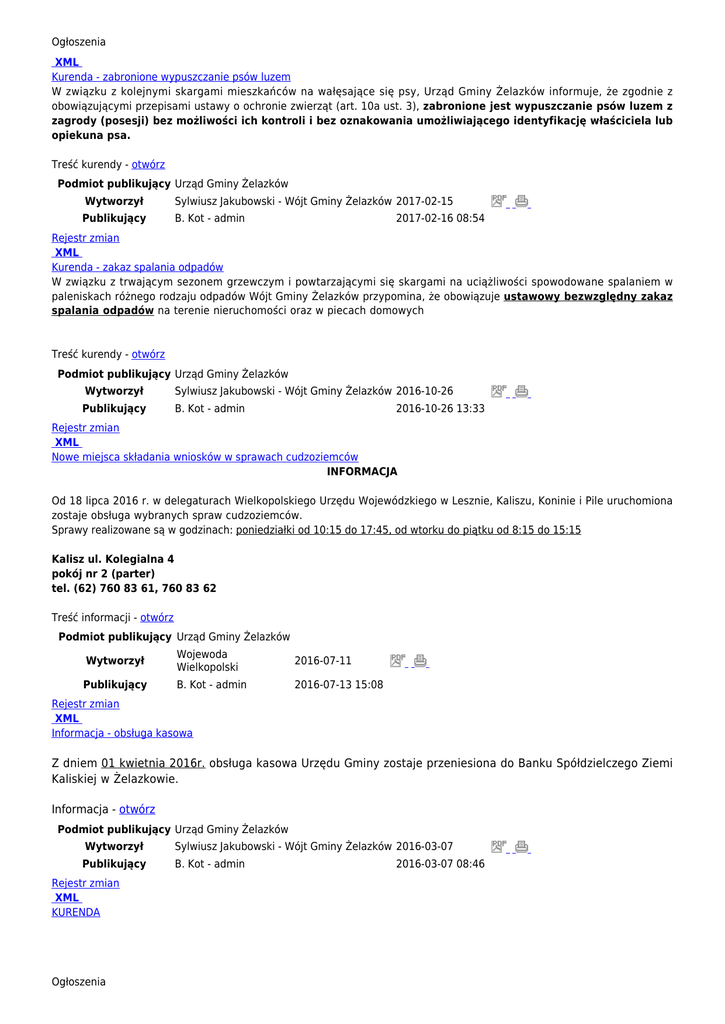 Ogłoszenia XML Kurenda - zabronione wypuszczanie psów luzem W związku z kolejnymi skargami mieszkańców na wałęsające się psy, Urząd Gminy Żelazków informuje, że zgodnie z obowiązującymi przepisami ustawy o ochronie zwierząt (art. 10a ust. 3), zabronione jest wypuszczanie psów luzem z zagrody (posesji) bez możliwości ich kontroli i bez oznakowania umożliwiającego identyfikację właściciela lub opiekuna psa. Treść kurendy - otwórz Podmiot publikujący Urząd Gminy Żelazków Wytworzył Sylwiusz Jakubowski - Wójt Gminy Żelazków 2017-02-15 Publikujący B. Kot - admin 2017-02-16 08:54 Rejestr zmian XML Kurenda - zakaz spalania odpadów W związku z trwającym sezonem grzewczym i powtarzającymi się skargami na uciążliwości spowodowane spalaniem w paleniskach różnego rodzaju odpadów Wójt Gminy Żelazków przypomina, że obowiązuje ustawowy bezwzględny zakaz spalania odpadów na terenie nieruchomości oraz w piecach domowych Treść kurendy - otwórz Podmiot publikujący Urząd Gminy Żelazków Wytworzył Sylwiusz Jakubowski - Wójt Gminy Żelazków 2016-10-26 Publikujący B. Kot - admin 2016-10-26 13:33 Rejestr zmian XML Nowe miejsca składania wniosków w sprawach cudzoziemców INFORMACJA Od 18 lipca 2016 r. w delegaturach Wielkopolskiego Urzędu Wojewódzkiego w Lesznie, Kaliszu, Koninie i Pile uruchomiona zostaje obsługa wybranych spraw cudzoziemców. Sprawy realizowane są w godzinach: poniedziałki od 10:15 do 17:45, od wtorku do piątku od 8:15 do 15:15 Kalisz ul. Kolegialna 4 pokój nr 2 (parter) tel. (62) 760 83 61, 760 83 62 Treść informacji - otwórz Podmiot publikujący Urząd Gminy Żelazków Wytworzył Wojewoda Wielkopolski 2016-07-11 Publikujący B. Kot - admin 2016-07-13 15:08 Rejestr zmian XML Informacja - obsługa kasowa Z dniem 01 kwietnia 2016r. obsługa kasowa Urzędu Gminy zostaje przeniesiona do Banku Spółdzielczego Ziemi Kaliskiej w Żelazkowie. Informacja - otwórz Podmiot publikujący Urząd Gminy Żelazków Wytworzył Sylwiusz Jakubowski - Wójt Gminy Żelazków 2016-03-07 Publikujący B. Kot - admin Rejestr zmian XML KURENDA Ogłoszenia 2016-03-07 08:46 Ogłoszenia Wójt Gminy Żelazków informuje, iż właściciele nieruchomości zabudowanych lub inne podmioty, które takimi nieruchomościami władają, mają obowiązek umieszczenia w widocznym miejscu na ścianie frontowej budynku tabliczki z numerem porządkowym. Obowiązek oznaczenia budynku numerem porządkowym wynika z art. 47b ustawy Prawo Geodezyjne i Kartograficzne (t.j. Dz. U. z 2010, Nr 193, poz. 1287 ze zm.). Niedopełnienie obowiązku wynikającego z powyższego przepisu skutkuje popełnieniem wykroczenia określonego w art. 64 Kodeksu Wykroczeń (t. j. Dz. U. z 2013, poz. 482 ze zm.). Prawidłowe oznakowanie posesji numerem porządkowym ma istotne znaczenie dla usprawnienia działań wszystkich podmiotów, dla których łatwość identyfikacji domów jest niezwykle ważna dla ratowania życia i zdrowia, a także zapewnienia bezpieczeństwa obywateli. Informacja ma na celu zmobilizowanie i zwiększenie świadomości społeczności lokalnej w zakresie prawidłowego oznakowania posesji. Wójt Gminy Żelazków, apeluje do mieszkańców o prawidłowe oznakowanie budynków numerami porządkowymi, zgodnie z dyspozycją art. 47b ustawy Prawo Geodezyjne i Kartograficzne. Prawo Geodezyjne i Kartograficzne Art. 47b. 1. Właściciele nieruchomości zabudowanych lub inne podmioty uwidocznione w ewidencji gruntów i budynków, które takimi nieruchomościami władają, mają obowiązek umieszczenia w widocznym miejscu na ścianie frontowej budynku tabliczki z numerem porządkowym w terminie 30 dni od dnia otrzymania zawiadomienia o ustaleniu tego numeru. 2. Na tabliczce, o której mowa w ust. 1, oprócz numeru porządkowego zamieszcza się również nazwę ulicy lub placu, a w miejscowościach bez ulic lub placów albo posiadających ulice lub place bez nazw - nazwę miejscowości. 3. Organy jednostek samorządu terytorialnego, w drodze uchwały, mogą wprowadzić obowiązek umieszczania na tabliczce, o której mowa w ust. 1, nazwy miejscowości lub nazwy dzielnicy, osiedla, zespołu urbanistycznego. 4. W przypadku gdy budynek położony jest w głębi ogrodzonej nieruchomości, tabliczkę z numerem porządkowym umieszcza się również na ogrodzeniu. Kodeks Wykroczeń Art. 64. § 1. Kto, będąc właścicielem, administratorem, dozorcą lub użytkownikiem nieruchomości, nie dopełnia obowiązku umieszczenia w odpowiednim miejscu albo utrzymania w należytym stanie tabliczki z numerem porządkowym nieruchomości, nazwą ulicy lub placu albo miejscowości, podlega karze grzywny do 250 złotych albo karze nagany. § 2. Tej samej karze podlega, kto nie dopełnia obowiązku oświetlenia tabliczki z numerem porządkowym nieruchomości Wójt Gminy Żelazków Sylwiusz Jakubowski Treść kurendy - otwórz Podmiot publikujący Urząd Gminy Żelazków Wytworzył Sylwiusz Jakubowski - Wójt Gminy Żelazków 2015-02-16 Publikujący B. Kot - admin 2015-02-16 13:55 Rejestr zmian XML Zaświadczenia o dochodowości Wydawanie zaświadczeń o dochodowości z gospodarstwa rolnego, o posiadaniu gospodarstwa rolnego, o figurowaniu w ewidencji podatników podatku rolnego, leśnego i od nieruchomości Sposób załatwienia sprawy: Wydaje się zaświadczenia na żądanie osoby ubiegającej się o zaświadczenie. Ogłoszenia Ogłoszenia Wymagane dokumenty: 1. Podanie Formularze podań o wydanie zaświadczenia odebrać można w Urzędzie Gminy Żelazków w pokoju nr 5 lub pobrać tutaj. Opłaty: Opłata skarbowa w wysokości – 17 zł.od zaświadczenia. jednostka odpowiedzialna: Referat Finansów, stanowisko ds. obsługi interesantów, pokój nr 5 Marzanna Bednarska, tel. 62 75-21-861. Tryb odwoławczy: Nie występuje Podstawa prawna: ustawa z dnia 29 sierpnia 1997r. Ordynacja podatkowa (Dz. U. z 2015 r. poz.613 ze zmianami) ustawa o opłacie skarbowej z dnia 9 września 2000 r.(Dz. U. 2006 r. Nr 2