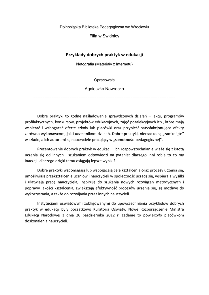 Dolnośląska Biblioteka Pedagogiczna we Wrocławiu Filia w Świdnicy Przykłady dobrych praktyk w edukacji Netografia (Materiały z Internetu) Opracowała Agnieszka Nawrocka =============================================================== Dobre praktyki to godne naśladowanie sprawdzonych działań – lekcji, programów profilaktycznych, konkursów, projektów edukacyjnych, zajęć pozalekcyjnych itp., które mają wspierać i wzbogacać ofertę szkoły lub placówki oraz przynieść satysfakcjonujące efekty zarówno wykonawcom, jak i uczestnikom działań. Dobre praktyki, nierzadko są „zamknięte” w szkole, a ich autorami są nauczyciele pracujący w „samotności pedagogicznej”. Prezentowanie dobrych praktyk w edukacji i ich rozpowszechnianie wiąże się z istotą uczenia się od innych i szukaniem odpowiedzi na pytanie: dlaczego inni robią to co my inaczej i dlaczego dzięki temu osiągają lepsze wyniki? Dobre praktyki wspomagają lub wzbogacają cele kształcenia oraz procesy uczenia się, umożliwiają przekształcenie uczniów i nauczycieli w społeczność uczącą się, wspierają wysiłki i ułatwiają pracę nauczyciela, inspirują do szukania nowych rozwiązań metodycznych i poprawy jakości kształcenia, zwiększają efektywność procesów uczenia się, są możliwe do wykorzystania, a także do rozwijania przez innych nauczycieli. Instytucjami oświatowymi zobligowanymi do upowszechniania przykładów dobrych praktyk w edukacji były początkowo Kuratoria Oświaty. Nowe Rozporządzenie Ministra Edukacji Narodowej z dnia 26 października 2012 r. zadanie to powierzyło placówkom doskonalenia nauczycieli. 1. Dobre Dobre praktyki / Ośrodek Doskonalenia Nauczycieli w Zielonej Górze. [online]. [dostęp: 5 września 2014]. Dostępny w World Wide Web: http://www.odn.zgora.pl/index.php?option=com_content&view=article&id=440&Itemid=15 1 Programy i projekty edukacyjne, ocenianie kształtujące, promocja czytelnictwa realizowane przez przedszkola, szkoły i poradnie psychologiczno-pedagogiczne województwa lubuskiego. 2. Dobre Dobre praktyki – Archiwum formatek / Ośrodek Rozwoju Edukacji. [online]. [dostęp: 5 września 2014]. Dostępny w World Wide Web: http://www.ore.edu.pl/stronaore/index.php?option=com_content&view=article&id=2361&Itemid=1717 Zajęcia dotyczące rozwijania zainteresowań i pracy z uczniem zdolnym. 3. Dobre Dobre Praktyki. Innowacje w edukacji / Łódzkie Centrum Doskonalenia Nauczycieli i Kształcenia Praktycznego. [online]. [dostęp: 5 września 2014]. Dostępny w World Wide Web: http://www.wckp.lodz.pl/content/dobre-praktyki-innowacje-w-edukacji Prezentacja dwumiesięcznika „Dobre Praktyki. Innowacje w edukacji” poświęconego dobrym praktykom edukacyjnym w łódzkich szkołach i placówkach , wydawanego od marca 2013 r. przez Łódzkie Centrum Doskonalenia Nauczycieli i Kształcenia Praktycznego. 4. Dobre Dobre praktyki. Konferencja "Jakość edukacji i/czy jakość ewaluacji?" Odpowiedzialni nauczyciele 23.03 - 26.03.2013 / System Ewaluacji Oświaty Nadzór Pedagogiczny. [online]. [dostęp: 5 września 2014]. Dostępny w World Wide Web: http://www.npseo.pl/action/subsite/konferencja2013-praktyki Przykłady dobrych praktyk w zakresie 12 wymagań stawianych szkołom i placówkom ujętych w Rozporządzeniu Ministra Edukacji Narodowej z dnia 10 maja 2013 r. zmieniającym rozporządzenie w sprawie nadzoru pedagogicznego. 5. Dobre Dobre praktyki – Materiały przesłane przez SOT i MOT do pobrania / Ośrodek Rozwoju Edukacji. [online]. [dostęp: 5 września 2014]. Dostępny w World Wide Web: http://www.ore.edu.pl/stronaore/index.php?option=com_content&view=article&id=2362&Itemid=1718 Scenariusze i konspekty zajęć, opisy projektów edukacyjnych, indywidualne programy dla uczniów uzdolnionych, programy autorskie, materiały dotyczące rozwijania zainteresowań, zdolności poznawczych, artystycznych, sportowych, technicznych, a także związanych z wolontariatem, aktywnością obywatelską dzieci i młodzieży i inne, przesyłane przez "Szkoły Odkrywców Talentów" i "Miejsca Odkrywania Talentów". 5. Polskie Polskie szkoły / Centrum Edukacji Obywatelskiej. [online]. [dostęp: 5 września 2014]. Dostępny w World Wide Web: http://www.ceo.org.pl/pl/cyfrowaszkola/dobre-praktyki/polskie-szkoly Scenariusze lekcji przedmiotowych, zajęć pozalekcyjnych z wykorzystaniem technologii informacyjno-komunikacyjnych (TIK). 6. Projekt Projekt „Szkoła dobrych praktyk” w roku szkolnym 2012/2013 / Kuratorium Oświaty w Lublinie. [online]. [dostęp: 5 września 2014]. Dostępny w World Wide Web: http://www.kuratorium.lublin.pl/?akc=akt&op=szcz&id=4012 Przykłady dobrych praktyk szkół i placówek województwa lubelskiego biorących udział w Projekcie. 7. Przykłady Przykłady dobrych praktyk / Karolina Adamska ; Kuratorium Oświaty w Poznaniu. [online]. [dostęp: 5 września 2014]. Dostępny w World Wide Web: http://ko.poznan.pl/?page=1 Projekty edukacyjne, konkursy, zajęcia pozalekcyjne realizowanych przez nauczycieli przedszkoli, szkół podstawowych i gimnazjów województwa wielkopolskiego realizowane w latach 2009/2010-2013-2014. 8. Przykłady Przykłady dobrych praktyk / Kuratorium Oświaty we Wrocławiu. [online]. [dostęp: 5 września 2014]. Dostępny w World Wide Web: http://www.kuratorium.wroclaw.pl/index.php?site=praktyki# Kurs pierwszej pomocy, współpraca szkoły podstawowej z Uniwersytetem Trzeciego Wieku, organizacja wymiany zagranicznej uczniów szkoły podstawowej, Uniwersytet Dziecięcy – współpraca szkoły podstawowej z uczelniami wyższymi. 9. Przykłady Przykłady dobrych praktyk / Regionalny Ośrodek Doskonalenia Nauczycieli „WOM” w Katowicach. [online]. [dostęp: 5 września 2014]. Dostępny w World Wide Web: http://www.womkat.edu.pl/143,Przyklady_dobrych_praktyk Przykłady dobrych praktyk realizowanych w przedszkolu, liceum ogólnokształcącym i zespole szkół. 10. Przykłady Przykłady dobrych praktyk szkolnych / 
