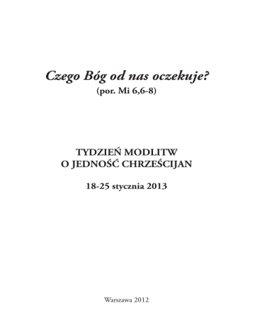 Czego Bóg od nas oczekuje? (por. Mi 6,6-8) TYDZIEŃ MODLITW O JEDNOŚĆ CHRZEŚCIJAN 18-25 stycznia 2013 Warszawa 2012 © Copyright by Rada ds. Ekumenizmu Konferencji Episkopatu Polski i Polska Rada Ekumeniczna Teksty Pisma Świętego Psalmy, Pieśń nad Pieśniami, Nowy Testament − Przekład Ekumeniczny: Pismo Święte Nowego Testamentu. Przekład Ekumeniczny. Wydanie piąte poprawione, Warszawa 2012. © Towarzystwo Biblijne w Polsce. Pozostałe księgi biblijne – Biblia Warszawska: Biblia to jest Pismo Święte Starego i Nowego Testamentu. Nowy przekład, Warszawa 1975 © Towarzystwo Biblijne w Polsce. ISSN 0208-9424 Redakcja: Andrzej Gontarek Krzysztof Nitkiewicz Henryk Paprocki Sławomir Pawłowski Edward Puślecki Kalina Wojciechowska Przygotowanie do druku: Sławomir Pawłowski Część I Wprowadzenie 1. Słowo polskiego Komitetu Redakcyjnego Sposób wykorzystania materiałów Tydzień i rok Tydzień Modlitw o Jedność Chrześcijan trwa w Polsce od 18 do 25 stycznia. Termin ten został zaproponowany przez pioniera ruchu ekumenicznego, Paula Wattsona z USA, w 1908 r., aby obejmował czas między dniem wspominającym św. Piotra (18 stycznia – niegdyś w rzymskim kalendarzu święto katedry Apostoła), a dniem upamiętniającym św. Pawła (25 stycznia – święto jego nawrócenia), co miało mieć symboliczne znaczenie. Na półkuli południowej, gdzie w styczniu zwykle trwają wakacje, Tydzień Modlitw o Jedność Chrześcijan jest zazwyczaj obchodzony w innym terminie, np. w okresie obejmującym święto Pięćdziesiątnicy (propozycja ruchu „Wiara i Ustrój” z 1926 r.), co również zyskuje rangę symbolu. Usilnie zachęca się Kościoły, by korzystały z tych materiałów przez cały rok, np. podczas comiesięcznych spotkań czy nabożeństw ekumenicznych, godzin biblijnych, w pracy duszpasterskiej wśród młodzieży, studentów, dorosłych. Podane w broszurze tzw. tematy do refleksji mogą 4 Część I posłużyć za wstęp do dyskusji, którą z kolei można zakończyć zaproponowanymi modlitwami. Nabożeństwa codzienne i nabożeństwo centralne W ramach Tygodnia Modlitw o Jedność Chrześcijan niektóre Kościoły, diecezje czy miasta organizują jedno nabożeństwo, inne spotykają się każdego dnia Tygodnia (właściwie oktawy). Jeszcze inne spośród tych ośmiu nabożeństw wybierają jedno, któremu nadają charakter obchodów centralnych, najczęściej w niedzielę. Należy tu podkreślić, że przypadająca w Tygodniu Modlitw niedziela ma szczególne znaczenie duszpasterskie. Niniejsza broszura uwzględnia każdą z tych możliwości, czemu służy propozycja nabożeństwa Słowa Bożego oraz bogaty zestaw modlitw na każdy dzień, łącznie z czytaniami biblijnymi i komentarzami. Międzywyznaniowo i konfesyjnie Materiały Tygodnia Modlitw o Jedność Chrześcijan można wykorzystać zarówno podczas nabożeństw międzywyznaniowych jak i w ramach nabożeństw tylko jednej konfesji, włączając proponowane modlitwy − na ile to możliwe − do własnych porządków liturgicznych. Na nabożeństwach centralnych w diecezjach Kościoła Rzymskokatolickiego, na które zapraszani są duchowni i świeccy z bratnich Kościołów chrześcijańskich, zalecane jest organizowanie nabożeństwa słowa Bożego. Jeżeli jednak racje duszpasterskie podpowiadają, że ze względu na większy udział wiernych wskazane jest umieszczenie modlitw o jedność chrześcijan w ramach Mszy św., skorzystać należy z Mszału Rzymskiego, wzbogacając celebrację o podane w broszurze teksty (czytania biblijne, modlitwy). Zwyczajem przyjętym w Polsce na nabożeństwach ekumenicznych stosowana jest gościnna wymiana kaznodziei. Jeżeli kazanie wygłasza przedstawiciel jednego nurtu chrześcijaństwa, pozdrowienie do zgromadzonych przekazać mogą przedstawiciele innych tradycji. Wprowadzenie 5 Wspólnotowo i indywidualnie Choć wspólnotowa modlitwa o jedność chrześcijan ma charakter uprzywilejowany, to jednak chrześcijanin powinien także modlić się do Ojca, „który widzi w ukryciu” (por. Mt 6,6). Materiały mogą służyć także tym, którzy chcieliby oddać się osobistej modlitwie w intencji jedności chrześcijan. Warto mieć przy tym świadomość, że wszyscy modlący się o większą widzialną jedność Kościoła tworzą wspólnotę, nawet gdy modlą się indywidualnie. Przygotowanie materiałów Zarys materiałów na tegoroczny Tydzień Modlitw został przygotowany przez Chrześcijański Ruch Studencki w Indiach (Student Christian Movement of India), w konsultacji z Wszechindyjską Federacją Uniwersytetów Katolickich (All India Catholic University Federation) i Narodową Radą Kościołów w Indiach (National Council of Churches in India). Do powstania tych materiałów przyczynili się w szczególności: – Jego Ekscelencja metropolita dr Geevarghese Mar Coorilos (SyroMalankarski Kościół Ortodoksyjny); – Pani Bernadine – Wszechindyjska Federacja Uniwersytetów Katolickich (Kościół Rzymskokatolicki); – Dr Aruna Gnanadason – Chrześcijański Ruch Studencki w Indiach (Kościół Południowych Indii); – Dr Peniel Rufus Rajkumar – Zjednoczony College Teologiczny (Kościół Południowych Indii); – Br. Vineeth Koshy – Narodowa Rada Kościołów w Indiach (SyroMalankarski Kościół Ortodoksyjny); – Pani Anicita Hepsibah – Chrześcijański Ruch Studencki w Indiach (Kościół Południowych Indii); – Pani Chrisida Nithyakalyani – Chrześcijański Ruch Studencki w Indiach (Tamilski Ewangelicki Kościół Luterański); 6 Część I – Ks. Raj Bharath Patta – Chrześcijański Ruch Studencki w Indiach (Ewangelicki Kościół Luterański Andhry). Teksty przygotowane przez tę grupę zostały ostatecznie opracowane przez członków Międzynarodowego Komitetu mianowanego przez Komisję Wiara i Ustrój Światowej Rady Kościołów i Papieską Radę ds. Popierania Jedności Chrześcijan. Polską wersję materiałów przygotował po raz