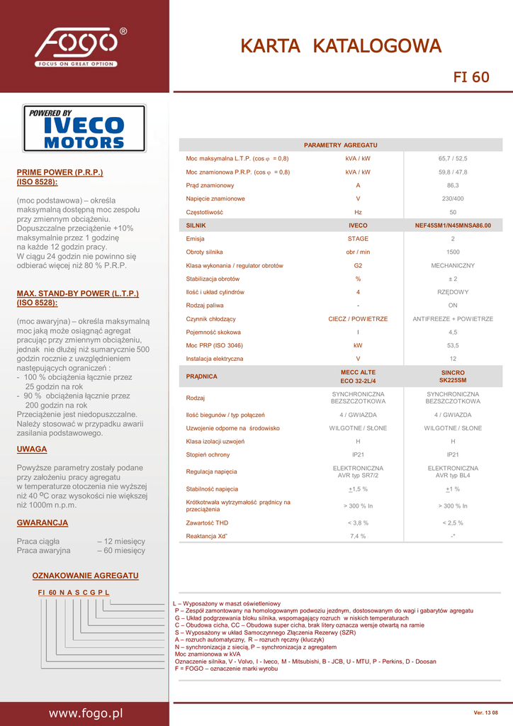KARTA KATALOGOWA FI 60 PARAMETRY AGREGATU Moc maksymalna L.T.P. (cos = 0,8) kVA / kW 65,7 / 52,5 PRIME POWER (P.R.P.) (ISO 8528): Moc znamionowa P.R.P. (cos = 0,8) kVA / kW 59,8 / 47,8 Prąd znamionowy A 86,3 (moc podstawowa) – określa maksymalną dostępną moc zespołu przy zmiennym obciążeniu. Dopuszczalne przeciążenie +10% maksymalnie przez 1 godzinę na każde 12 godzin pracy. W ciągu 24 godzin nie powinno się odbierać więcej niż 80 % P.R.P. Napięcie znamionowe V 230/400 Częstotliwość Hz 50 SILNIK IVECO NEF45SM1/N45MNSA86.00 Emisja STAGE 2 Obroty silnika obr / min 1500 Klasa wykonania / regulator obrotów G2 MECHANICZNY Stabilizacja obrotów % ±2 MAX. STAND-BY POWER (L.T.P.) (ISO 8528): Ilość i układ cylindrów 4 RZĘDOWY Rodzaj paliwa - ON (moc awaryjna) – określa maksymalną moc jaką może osiągnąć agregat pracując przy zmiennym obciążeniu, jednak nie dłużej niż sumarycznie 500 godzin rocznie z uwzględnieniem następujących ograniczeń : - 100 % obciążenia łącznie przez 25 godzin na rok - 90 % obciążenia łącznie przez 200 godzin na rok Przeciążenie jest niedopuszczalne. Należy stosować w przypadku awarii zasilania podstawowego. Czynnik chłodzący CIECZ / POWIETRZE ANTIFREEZE + POWIETRZE Pojemność skokowa l 4,5 Moc PRP (ISO 3046) kW 53,5 Instalacja elektryczna V 12 MECC ALTE ECO 32-2L/4 SINCRO SK225SM SYNCHRONICZNA BEZSZCZOTKOWA SYNCHRONICZNA BEZSZCZOTKOWA 4 / GWIAZDA 4 / GWIAZDA WILGOTNE / SŁONE WILGOTNE / SŁONE H H IP21 IP21 Regulacja napięcia ELEKTRONICZNA AVR typ SR7/2 ELEKTRONICZNA AVR typ BL4 Stabilność napięcia +1,5 % +1 % > 300 % In > 300 % In Zawartość THD < 3,8 % < 2,5 % Reaktancja Xd” 7,4 % -* PRĄDNICA Rodzaj Ilość biegunów / typ połączeń Uzwojenie odporne na środowisko Klasa izolacji uzwojeń UWAGA Stopień ochrony Powyższe parametry zostały podane przy założeniu pracy agregatu w temperaturze otoczenia nie wyższej niż 40 OC oraz wysokości nie większej niż 1000m n.p.m. GWARANCJA Praca ciągła Praca awaryjna – 12 miesięcy – 60 miesięcy Krótkotrwała wytrzymałość prądnicy na przeciążenia OZNAKOWANIE AGREGATU F I 60 N A S C G P L F L – Wyposażony w maszt oświetleniowy P – Zespół zamontowany na homologowanym podwoziu jezdnym, dostosowanym do wagi i gabarytów agregatu G – Układ podgrzewania bloku silnika, wspomagający rozruch w niskich temperaturach C – Obudowa cicha, CC – Obudowa super cicha, brak litery oznacza wersje otwartą na ramie S – Wyposażony w układ Samoczynnego Złączenia Rezerwy (SZR) A – rozruch automatyczny, R – rozruch ręczny (kluczyk) N – synchronizacja z siecią, P – synchronizacja z agregatem Moc znamionowa w kVA Oznaczenie silnika, V - Volvo, I - Iveco, M - Mitsubishi, B - JCB, U - MTU, P - Perkins, D - Doosan F = FOGO – oznaczenie marki wyrobu www.fogo.pl Ver. 13 08 FI 60 WYTYCZNE INSTALACYJNE Sposób odbioru mocy gniazdo 3-faz A 125 Przewody odbioru mocy giętka linka mm 2 5x35(≤30mb) Przewody automatyki SZR giętka linka mm 2 7x1,5 (≤30mb) Przewody potrzeb własnych (grzałka, ładowarka) giętka linka mm 2 3x2,5 (≤30mb) Przewody powyżej 30 mb – do uzgodnienia z działem technicznym. *** UWAGA: Za właściwy dobór przekrojów przewodów odpowiada projektant *** Rozmiar szafy SZR (dolne podejście kablowe) wys./szer./gł. mm 700/500/250 (wisząca) Średnica kolektora wydechu silnika mm 88,9 Średnica wydechu (max. 7mb, 4 kolana 90st.) mm 88,9 Średnica wydechu (max. 15mb, 4 kolana 90st.) mm 88,9 DO ZABUDOWY Wymiary dł./szer./wys. 1820x880x1334 kg 800 Pojemność zbiornika paliwa l 152 Czas pracy przy 100% obciążenia h 11 Wysokość chłodnicy mm 463 Szerokość chłodnicy mm 487 Odległość chłodnicy od podłoża mm 641 Powierzchnia wyrzutni powietrza m2 0,23 Powierzchnia czerpni powietrza m2 0,29 Moc akustyczna LWA dB 117** Masa agregatu Masa agregatu dł./szer./wys. 2100x912x1341 kg 1045 Pojemność zbiornika paliwa l 140 Czas pracy przy 100% obciążenia h 10,2 Moc akustyczna LWA dB 93*** Zdjęcia przykładowe EKSPLOATACJA Rodzaj oleju 15W40 Rimula R4L Ilość oleju w układzie smarowania L 12,8 Zużycie oleju (na 1 kW) % 0,01 Okres pomiędzy wymianami oleju Rh 500 / 1 rok -38oC Antifreeze Glycoshell L 18,5 Rh / lat 1000 / 2 Rodzaj płynu chłodzącego (glikolowy) Ilość płynu chłodzącego Okres pomiędzy wymianami płynu Pojemność akumulatora rozruchowego Ah 100 - EN 590 Zużycie paliwa100% l/h 13,7 Zużycie paliwa 80% l/h 10,2 Zużycie paliwa 50% l/h 7,0 Wymiana filtrów paliwa Rh 500 Zgodność paliwa z normą Wymiana filtrów oleju Wytyczne płyty fundamentowej (płyta zbrojona) - silnik - prądnica - bateria akumulatorów - instalacja elektryczna - zbiornik paliwa wraz z instalacją - wibroizolatory - kompensator wydechu - tłumik - płyny eksploatacyjne (płyn chłodzący + olej silnikowy, bez paliwa) - szafa potrzeb własnych i odbioru mocy - zabezpieczenie prądnicy (wyłącznik mocy) - mikroprocesorowy układ sterowania - wskaźniki parametrów elektrycznych i mechanicznych - przycisk wyłącznika bezpieczeństwa - sygnał akustyczny awarii WERSJE: ZABUDOWANY Wymiary WYPOSAŻENIE STANDARDOWE: Rh 500 dł./szer. 2300x1100 R - do zabudowy, sterowanie ręczne - wyposażenie standardowe AG - do zabudowy, start automatyczny - wyposażenie standardowe + ładowarka + zdolność przyjęcia sygnału zdalnego startu ASG - do zabudowy, start automatyczny, SZR - wyposażenie standardowe + ładowarka + zdolność przyjęcia sygnału zdalnego startu + SZR (oddzielna szafa z własnym sterowaniem) RC - zabudowany, sterowanie ręczne - wyposażenie standardowe + obudowa atmosferyczna ACG - zabudowany, sterowanie automatyczne - wyposażenie standardowe + obudowa atmosferyczna + ładowarka + zdolność przyjęcia sygnału zdalnego startu, ASCG - zabudowany, start automatyczny, SZR - wyposażenie standardowe + obudowa atmosferyczna + ładowarka + zdolność przyjęcia sygnału zdalnego startu + SZR (oddzielna szafa z wła
