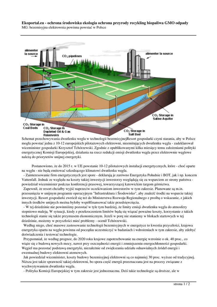 Ekoportal.eu - ochrona środowiska ekologia ochrona przyrody recykling biopaliwa GMO odpady MG: bezemisyjna elektrownia powinna powstać w Polsce Schemat przechowywania dwutlenku wegla w technologii bezemisyjnejResort gospodarki czyni starania, aby w Polsce mogła powstać jedna z 10-12 europejskich pilotażowych elektrowni, nieemitujących dwutlenku węgla - zadeklarował wiceminister gospodarki Krzysztof Tchórzewski. Zgodnie z opublikowanymi kilka miesięcy temu założeniami polityki energetycznej Komisji Europejskiej, działania na rzecz redukcji emisji dwutlenku węgla przez elektrownie węglowe należą do priorytetów unijnej energetyki. Postanowiono, że do 2015 r. w UE powstanie 10-12 pilotażowych instalacji energetycznych, które - choć oparte na węglu - nie będą emitować szkodzącego klimatowi dwutlenku węgla. - Zainteresowanie firm energetycznych jest spore - deklarują je zarówno Energetyka Południe i BOT, jak i np. koncern Vattenfall. Jednak ze względu na koszty takiej inwestycji inwestorzy rozglądają się za wsparciem ze strony państwa powiedział wiceminister podczas konferencji prasowej, towarzyszącej katowickim targom górnictwa. Zapewnił, że resort chciałby wyjść naprzeciw oczekiwaniom inwestorów w tym zakresie. Planowane są m.in. przesunięcia w unijnym programie operacyjnym "Infrastruktura i Środowisko", aby znaleźć środki na wsparcie takiej inwestycji. Resort gospodarki zwrócił się też do Ministerstwa Rozwoju Regionalnego z prośbą o wskazanie, z jakich innych środków unijnych można byłoby współfinansować takie przedsięwzięcia. - W tej dziedzinie nie powinniśmy pozostać w tyle tym bardziej, że limity emisji dwutlenku węgla do atmosfery stopniowo maleją. W sytuacji, kiedy z przekroczeniem limitów będą się wiązać poważne koszty, korzystanie z takich technologii stanie się także przymusem ekonomicznym. Jeżeli w porę nie staniemy w blokach startowych w tej dziedzinie, możemy w przyszłości mieć problemy - ocenił Tchórzewski. Według niego, choć masowe zastosowanie technologii bezemisyjnych w energetyce to kwestia przyszłości, krajowa energetyka oparta na węglu powinna od początku uczestniczyć w badaniach i wdrożeniach w tym zakresie, aby zdobyć doświadczenia i testować technologie. Przypomniał, że według prognoz, do 2020 roku krajowe zapotrzebowanie na energię wzrośnie o ok. 40 proc., co wiąże się z budową nowych mocy, nawet przy oszczędności energii i zmniejszeniu energochłonności gospodarki. Węgiel ma pozostać podstawą energetyki, niezależnie od zwiększania udziału odnawialnych źródeł energii i ewentualnej budowy elektrowni atomowych. Jak powiedział wiceminister, koszty budowy bezemisyjnej elektrowni są co najmniej 30 proc. wyższe od tradycyjnej. Niższa jest także sprawność takiej elektrowni, bo spora część energii przeznaczana jest na procesy związane z wychwytywaniem dwutlenku węgla. - Polityka Komisji Europejskiej w tym zakresie jest jednoznaczna. Dziś takie technologie są droższe, ale w strona 1 / 2 Ekoportal.eu - ochrona środowiska ekologia ochrona przyrody recykling biopaliwa GMO odpady MG: bezemisyjna elektrownia powinna powstać w Polsce perspektywie czasu rachunek ekonomiczny będzie wyglądał inaczej, gdy - jak się szacuje - za przekroczenie limitu emisji CO2 trzeba będzie zapłacić 8-10 euro za każdą tonę, a w efekcie końcowym nawet 30 euro. Wtedy budowa takich elektrowni będzie nie tylko opłacalna, ale konieczna - mówił Tchórzewski. Według danych firm energetycznych, średnio budowa 1 megawata mocy tradycyjnej elektrowni kosztuje 1,3-1,6 mln euro. W przypadku demonstracyjnej bezemisyjnej instalacji byłoby to powyżej 2 mln euro, czyli ok. 100 mln euro na cały projekt elektrowni o mocy 50 megawatów. Dodatkowe koszty wynikają przede wszystkim z konieczności wychwytywania powstającego w procesie spalania dwutlenku węgla, który następnie - zamiast, jak dziś, trafiać do atmosfery - powinien być sprężony i skroplony, a następnie lokowany np. pod ziemią w dawnych wyrobiskach górniczych lub w morskich głębinach. Badane są technologie pozwalające na wykorzystanie dwutlenku węgla do "wypychania" wydobywanej spod dna mórz ropy. O tym, że z komercyjnego punktu widzenia tego typu inwestycje nie są na razie opłacalne, świadczą liczby - koszt wychwycenia tony dwutlenku węgla szacuje się na ok. 35 euro, a dzisiejsze ceny energii u producentów w Polsce są poniżej 30 euro za megawatogodzinę. Jedna z pierwszych bezemisyjnych elektrowni powstaje kilkadziesiąt kilometrów od granic Polski, w niemieckiej miejscowości Schwarze Pumpe. Instalację buduje tam działający także w Polsce szwedzki koncern Vattenfall. Obiekt pilotażowy powstaje w pobliżu działającej elektrowni, zasilanej węglem brunatnym. Demonstracyjna elektrownia będzie miała moc 30 megawatów i będzie wyposażona w system wychwytywania CO2. Projekt Vattenfall zainicjował w 2001 r. Zgodnie z planem, powinien on zakończyć się zaprojektowaniem elektrowni demonstracyjnej o mocy 250 megawatów oraz stworzeniem koncepcji nadającej się do zastosowania na skalę przemysłową. Będzie ona dostępna do wdrożenia najpóźniej do 2020 r. Działanie bezemisyjnej elektrowni polega na oddzielaniu dwutlenku węgla z powstających przy spalaniu węgla spalin, sprężeniu (zmniejszeniu objętości) tego gazu, a następnie na zamianie jego stanu skupienia z gazowego w ciekły i składowaniu w odpowiednich formacjach geologicznych głęboko pod ziemią. Dwutlenek węgla ma być najpierw powoli rozpuszczany w znajdującej się w podziemnych zbiornikach wodzie, a następnie ulec rozkładowi. Źródło: PAP strona 2 / 2