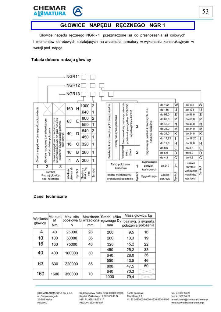 53 GŁOWICE NAPĘDU RĘCZNEGO NGR 1 Głowice napędu ręcznego NGR - 1 przeznaczone są do przenoszenia sił osiowych i momentów obrotowych działających na wrzeciona armatury w wykonaniu konstrukcyjnym w wersji pod napęd. Tabela doboru rodzaju głowicy NGR11 NGR12 do 4,3 Tylko położenia krańcowe 1 Sygnalizacja położeń krańcowych do 240 A Rodzaj mechanizmu sygnalizacji położenia Sygnalizacja Zakres obr./cykl do 96,0 do 69,0 do 48,0 do 34,0 do 24,0 do 17,25 do 12,0 do 8,6 do 6,0 do 192 do 138 do 96,0 do 69,0 do 48,0 do 34,0 do 24,0 do 17,25 do 12,0 do 8,6 do 6,0 do 4,3 Zakres obrotów wskaźnika machnicz. obr./cykl W U S P N M K I H E D C Symbol A 200 1 2 do 138 Symbol B 280 1 3 Sygnalizacja położeń krańcowych plus nadajnik położenia C 320 1 sygnał wyjściowy 4÷20mA 450 1 100mA 640 2 Rodzaj nadajnika położenia 550 1 W U S P N M K I H E D C do 192 Symbol 4 800 2 Potencjometr Dwuprzewodowy prądowy przetwornik 100 położenia kątowego Uzas 12÷36 VDC 10 640 1 Symbol Symbol Rodzaj głowicy nap. ręcznego 16 D 1000 2 Średnica Kółka D k mm 3 40 E Symbol 2 63 Wielkość głowicy Mn Głowice napędowe z mechanicznym wskażnikiem położenia 1 Głowice napędowe z mechanicznym wskaźnikiem położenia plus nadajnik położenia i sygnalizacja położeń krańcowych Głowice napędowe bez sygnalizacji położenia 160 H Położenia krańcowe plus położenia pośrednie NGR13 Dane techniczne Wielkość głowicy Moment Max. siła Max.średn. Średn. kółka Masa głowicy, kg poosiowa Q wrzeciona ręcznago D k bez syg. z sygnaliz. M Nm N mm mm położenia położenia 4 10 16 40 25000 28 200 9,5 16 100 50000 36 280 10,3 19 160 75000 40 40 400 100000 50 63 630 220000 55 1600 350000 70 15,2 25,2 28,0 43,5 47,5 70,3 79,4 22 33 36 46 50 160 320 450 640 550 800 640 1000 CHEMAR ARMATURA Sp. z o.o. ul. Olszewskiego 6 25-953 Kielce POLAND Sąd Rejonowy Kielce KRS: 00000 68958 Kapitał Zakładowy : 9 682 000 PLN NIP: PL 959 15 03 417 REGON: 292 449 587 Konto bankowe: Alior Bank S.A. Nr: 87 24900005 0000 4530 8530 4196 tel.: 41 367 56 26 fax: 41 367 56 29 e-mail: [email protected] web: www.armatura-chemar.pl 53 Wymiary gabarytowe Głowice typu NGR11 Głowice typu NGR12 i NGR13 A A Tuleja napędowa Wielkość głowicy 4 10 16 40 63 160 165 220 300 Tuleja napędowa i kołpak nie wchodzą w skład dostawy głowicy Przyłącze Wymiary, mm D0 125 140 165 D1 65 79 85 95 109 141 D2 70 86 92 100 117 147 DB 100 100 130 130 155 180 DZ 150 175 210 210 260 350 hB 3 3 3 3 4 5 h2 14 14 14 14 14 18 h3 7 h4 28 4 10 16 40 63 160 550 800 640 1000 Wymiary w mm DK 200 280 320 450 640 D - - - 570 760 670 920 760 1120 H 148 166 170 179 204 235 268 269 H1 220 225 223 251 276 284 317 - W 125 137 142 154 197 223 W1 195 196 195 226 246 - L 209 223 248 252 287 - Z1 298 316 333 338 373 - Z2 236 254 271 276 311 - 317 Kołpak Wielkość głowicy Tuleja napędowa M1xh 1 9,5 34 9,5 37 M12x13 M16x16 M16x17 11,5 12,5 24,5 40 52 80 M20x19 M20x25 M24x30 n, szt 4 4 4 4 8 8 h 15 17 18 25 27 32 D3 35 45 52 60 65 80 D4 45 55 65 73 82 102 Z 30 43 50 58 60 76 S 14 14 16 20 24 32 8 10 12 16 25 30 L max N 50 60 62 80 105 140 d0 60 72 75 95 100 130 g 5 5 5 7 7 9 M4 M4 M5 M6 M6 M6 M2 Zastrzega się zmiany treści i formy niniejszej karty katalogowej bez powiadomienia