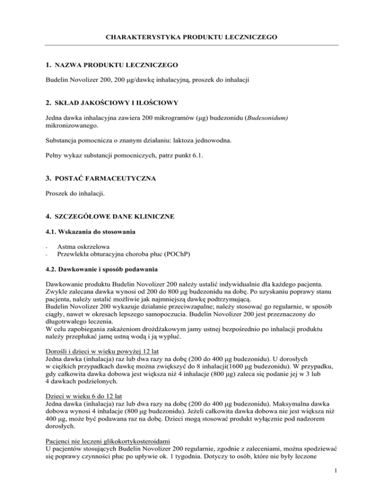CHARAKTERYSTYKA PRODUKTU LECZNICZEGO 1. NAZWA PRODUKTU LECZNICZEGO Budelin Novolizer 200, 200 μg/dawkę inhalacyjną, proszek do inhalacji 2. SKŁAD JAKOŚCIOWY I ILOŚCIOWY Jedna dawka inhalacyjna zawiera 200 mikrogramów (μg) budezonidu (Budesonidum) mikronizowanego. Substancja pomocnicza o znanym działaniu: laktoza jednowodna. Pełny wykaz substancji pomocniczych, patrz punkt 6.1. 3. POSTAĆ FARMACEUTYCZNA Proszek do inhalacji. 4. SZCZEGÓŁOWE DANE KLINICZNE 4.1. Wskazania do stosowania - Astma oskrzelowa Przewlekła obturacyjna choroba płuc (POChP) 4.2. Dawkowanie i sposób podawania Dawkowanie produktu Budelin Novolizer 200 należy ustalić indywidualnie dla każdego pacjenta. Zwykle zalecana dawka wynosi od 200 do 800 μg budezonidu na dobę. Po uzyskaniu poprawy stanu pacjenta, należy ustalić możliwie jak najmniejszą dawkę podtrzymującą. Budelin Novolizer 200 wykazuje działanie przeciwzapalne; należy stosować go regularnie, w sposób ciągły, nawet w okresach lepszego samopoczucia. Budelin Novolizer 200 jest przeznaczony do długotrwałego leczenia. W celu zapobiegania zakażeniom drożdżakowym jamy ustnej bezpośrednio po inhalacji produktu należy przepłukać jamę ustną wodą i ją wypluć. Dorośli i dzieci w wieku powyżej 12 lat Jedna dawka (inhalacja) raz lub dwa razy na dobę (200 do 400 μg budezonidu). U dorosłych w ciężkich przypadkach dawkę można zwiększyć do 8 inhalacji(1600 μg budezonidu). W przypadku, gdy całkowita dawka dobowa jest większa niż 4 inhalacje (800 μg) zaleca się podanie jej w 3 lub 4 dawkach podzielonych. Dzieci w wieku 6 do 12 lat Jedna dawka (inhalacja) raz lub dwa razy na dobę (200 do 400 μg budezonidu). Maksymalna dawka dobowa wynosi 4 inhalacje (800 μg budezonidu). Jeżeli całkowita dawka dobowa nie jest większa niż 400 μg, może być podawana raz na dobę. Dzieci mogą stosować produkt wyłącznie pod nadzorem dorosłych. Pacjenci nie leczeni glikokortykosteroidami U pacjentów stosujących Budelin Novolizer 200 regularnie, zgodnie z zaleceniami, można spodziewać się poprawy czynności płuc po upływie ok. 1 tygodnia. Dotyczy to osób, które nie były leczone 1 uprzednio doustnymi glikokortykosteroidami lub otrzymywały te produkty lecznicze sporadycznie, przez krótki czas. Zwiększone wydzielanie śluzu w oskrzelach może utrudnić dystrybucję leku do obszaru zmian zapalnych. W takim przypadku zaleca się krótkotrwałe leczenie glikokortykosteroidami działającymi ogólnoustrojowo (rozpoczynając od dawki dobowej równoważnej 40 do 60 mg prednizonu). Inhalacje produktu Budelin Novolizer 200 należy kontynuować po stopniowym zmniejszeniu dawki leku działającego ogólnie. Pacjenci leczeni doustnymi glikokortykosteroidami Pacjenci otrzymujący doustne glikokortykosteroidy powinni być przestawieni na Budelin Novolizer 200 w momencie złagodzenia objawów choroby. Ponieważ u tych pacjentów dochodzi zazwyczaj do zaburzenia czynności kory nadnerczy, dlatego nie należy glikokortykosteroidu działającego ogólnoustrojowo odstawiać nagle. Przez okres 10 dni Budelin Novolizer 200 należy stosować jednocześnie z doustnym glikokortykosteroidem w pełnej dawce. Następnie dawkę doustnego glikokortykosteroidu należy stopniowo zmniejszać o dawkę równoważną 2,5 mg prednizonu co miesiąc, do najmniejszej możliwej dawki. W wielu przypadkach możliwe jest całkowite zastąpienie doustnych glikokortykosteroidów przez Budelin Novolizer 200. Ponowne włączenie leczenia glikokortykosteroidem doustnym może okazać się konieczne w stanach stresowych lub nagłych (np. ciężkie zakażenie, zranienie, zabieg chirurgiczny), w pierwszym miesiącu po przestawieniu na leczenie glikokortykosteroidami wziewnymi. Po przestawieniu na leczenie inhalacyjne mogą u pacjenta powrócić dolegliwości tłumione podczas leczenia glikokortykosteroidem działającym ogólnoustrojowo (objawy alergicznego zapalenia błony śluzowej nosa, wyprysku alergicznego, objawy reumatoidalnego zapalenia stawów). W takiej sytuacji należy dodatkowo zastosować odpowiednie leczenie objawowe. Zaostrzenie objawów klinicznych spowodowane ostrym zakażeniem dróg oddechowych W sytuacji zaostrzenia objawów na skutek ostrego zakażenia dróg oddechowych należy rozważyć podanie odpowiedniego antybiotyku. Konieczna może być modyfikacja dawki produktu Budelin Novolizer 200 lub włączenie doustnego glikokortykosteroidu. Instrukcja stosowania inhalatora proszkowego Novolizer 2 Wymiana pojemnika 1. Należy delikatnie nacisnąć karbowane przyciski znajdujące się po obu stronach pokrywki, przesunąć ją do przodu i unieść. 2. Usunąć ochronną folię aluminiową z pudełka z pojemnikiem i wyjąć pojemnik z lekiem. Należy to zrobić tuż przed pierwszym użyciem leku. 3. Umieścić pojemnik w inhalatorze proszkowym Novolizer w taki sposób, aby licznik dawek był skierowany w stronę ustnika. Podczas umieszczania pojemnika w inhalatorze nie należy wciskać przycisku dozującego. 4. Umieścić z powrotem pokrywkę w prowadnicach znajdujących się po obu stronach urządzenia, wprowadzając ją od góry i popchnąć równo w kierunku czerwonego przycisku dozującego aż zaskoczy na miejsce. Pojemnik z lekiem może pozostawać w inhalatorze proszkowym Novolizer aż do wyczerpania się zapasu leku, ale nie dłużej niż przez 3 miesiące od momentu załadowania pojemnika z lekiem, nawet jeżeli nie został całkowicie zużyty. Inhalator proszkowy Novolizer jest gotowy do użycia. Uwaga: Pojemniki Budelin Novolizer 200 mogą być stosowane wyłącznie w oryginalnym inhalatorze proszkowym Novolizer. 3 Sposób użycia 1. Inhalacje należy wykonywać w pozycji siedzącej lub stojącej. Stosując inhalator proszkowy Novolizer należy zawsze utrzymywać go w pozycji poziomej. Najpierw należy zdjąć osłonę ustnika. 2. Wcisnąć do oporu czerwony przycisk dozujący. W momencie ustawienia przycisku we właściwej pozycji słychać będz
