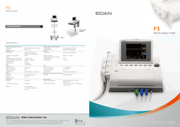 F3 Monitor płodu Pozycjonowanie Mocowanie ścienne F3 Monitor płodu i matki Wózek Specyfikacja Charakterystyka fizyczna Wymiary: Waga: Głowica US Technika: Prędkość powtarzania pulsu: Częstotliwość próbkowania: Zakres pomiaru tętna płodu: Rozdzielczość: Dokładność: /ob: TOCO Zakres TOCO: Błąd nieliniowości: Rozdzielczość: Zerowanie: AFM Technika: Zakres: Rozdzielczość: Zasilanie Napięcie: 350mm x 300mm x 104mm około 3 kg Doppler pulsacyjny z automatyczną korelacją 2KHz 1.0MHz ±10% 50bpm - 240bpm 1bpm +/-2bpm <10mW/cm2 0%-100% <10% 1% Automatyczny / Manualny Doppler pulsacyjny 0-100 (%) 1% Specyfikacja wyświetlacza: Wyświetlacz: Rozdzielczość: DECG Technika: Zakres pomiaru bezpośredniego tętna płodu: Rozdzielczość: Dokładność: 5,6” kolorowy TFT-LCD RGB 640 (W)*480 (H) Detekcja szczyt-szczyt 30bpm ~ 240bpm 1bpm +/-1 bpm IUP Zakres ciśnienia: 0 ~ l00mmHg Błąd nieliniowości: < +2mmHg Rozdzielczość: 1% Zerowanie: Automatyczne/Manualne Ręczny znacznik ruchów płodu Metoda Zdalny znacznik 100 -240V Rejestrator Papier rejestracyjny: Częstotliwość prądu: 50/60Hz Prędkość rejestracji: Bateria: Akumulatorowa 14.8V/4400mAh litowojonowa Papier termoczuły w ryzach, 150/152mm 1/2/3cm/min, 25mm/s dla danych historycznych 3/F - B, Nanshan Medical Equipment Park, Nanhai Rd 1019#, Shekou, Nanshan Shenzhen, 518067 P.R. China ■ Tel: +86-755-26898326 ■ Fax:+86-755-26898330 ■ www.edan.com.cn ■ Email: [email protected] ■ Wszelkie prawa zastrzeżone. Specyfikacja może ulec zmianie bez wcześniejszego uprzedzenia. Centrala monitorująca MFM-CNS Daje możliwość centralnego monitorowania dużej ilości 32 monitorów przyłóżkowych matki i płodu, łącznie z F3. Dzięki eleganckiemu wyglądowi, jasnym kolorom wyświetlacza i wzmocnionej funkcjonalności monitor F3 spełnia wymogi oddziałów położniczych w klinikach i szpitalach. F3 jest niespodziewanie lekki i przenośny, co czyni go przydatnym w zastosowaniach ambulatoryjnych. Dzięki najnowszej technologii firmy EDAN, F3 oferuje możliwość monitorowania wachlarza parametrów, takich jak FHR, TOCO, DECG, IUP i ruchów płodu. Wiele trybów prezentacji danych Dzięki przełączaniu się między trybami wyświetlania użytkownik może wybrać najodpowiedniejszy dla danej sytuacji klinicznej. Prosty obieg danych Obsługa jednym pokrętłem: Używając tylko pokrętła użytkownik może przeprowadzić całą konfigurację w celu przystosowania aparatu do aktualnej sytuacji klinicznej Obsługa jednym klawiszem Klawisz START można skonfigurować, aby zintegrować dane pacjenta i wydruk. Ta czynność może pomóc uprościć pracę lekarza i umożliwić mu pracę tylko z jednym przyciskiem. Wodoodporny przetwornik FHR o częstotliwości 1 MHz Wykorzystanie głowicy o częstotliwości 1MHz powiększa penetrację i pogłębia detekcję, co ma znaczący wpływ na jakość monitorowania zwłaszcza dużych ciężarnych pacjentek. Co więcej, im niższa częstotliwość przetwornika, tym lepsza ochrona tkanek płodu. F3 Monitor płodu Wygodny w przenoszeniu i transporcie Kompaktowy, przenośny i lekki (waga około 3kg) Bateria litowo-jonowa o dużej pojemności dla monitorowania pacjentów poza kliniką Łatwy w odczycie i obsłudze Składany kolorowy ekran TFT o przekątnej 5,6” Duży wyświetlacz danych numerycznych i trendów Prosty obieg danych, silikonowe przyciski obsługi Zaawansowana technologia detekcji FHR Weryfikacja nakładających się sygnałów ciąży bliźniaczej Wskaźnik jakości sygnału pomagający optymalizować pozycję przetwornika Różne opcje drukowania Wbudowana drukarka termiczna Wydruk na papierze o szerokości150/152 mm prędkość drukowania 1/2/3/ cm/min w czasie rzeczywistym Szybkie drukowanie 15 mm/s danych historycznych Wszechstronne zarządzanie danymi Wbudowana pamięć 12 godzin dla bezszwowego monitoringu Sieć MFM-CNS ze zdalnym monitoringiem Oprogramowanie Insight do zarządzania danymi na komputerze Port USB dla powiększenia możliwości archiwizacyjnych