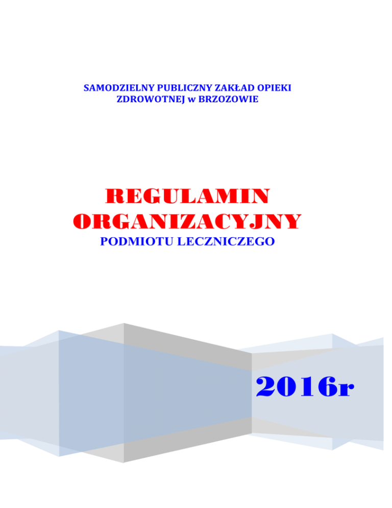 SAMODZIELNY PUBLICZNY ZAKŁAD OPIEKI ZDROWOTNEJ w BRZOZOWIE REGULAMIN ORGANIZACYJNY PODMIOTU LECZNICZEGO 2016r 2 SPIS TREŚCI: 1. 2. 3. 4. 5. 6. 7. 8. 9. 10. 11. 12. 13. POSTANOWIENIA OGÓLNE str. 3 FIRMA PODMIOTU LECZNICZEGO str. 3 CELE I ZADANIA PODMIOTU LECZNICZEGO str. 3-4 STRUKTURA ORGANIZACYJNA PRZEDSIĘBIORSTWA PODMIOTU LECZNICZEGO I MIEJSCA UDZIELANIA ŚWIADCZEŃ str.4 PRZEBIEG PROCESU UDZIELANIA ŚWIADCZEŃ ZDROWOTNYCH, Z ZAPEWNIENIEM WŁAŚCIWEJ ICH DOSTĘPNOŚCI I JAKOŚCI W JEDNOSTKCH I KOMÓRKACH ORGANIZACYJNYCH PRZEDSIĘBIORSTWA PODMIOTU LECZNICZEGO str.4-6 PRAWA I OBOWIĄZKI PACJENTA str. 6 ORGANIZACJA I ZADANIA POSZCZEGÓLNYCH JEDNOSTEK I KOMÓREK ORGANIZACYJNYCH PRZEDSIĘBIORSTWA PODMIOTU LECZNICZEGO ORAZ WARUNKI WSPÓŁDZIAŁANIA MIĘDZY TYMI JEDNOSTKAMI I KOMÓRKAMI str. 6-8 WARUNKI WSPÓŁDZIAŁANIA Z INNYMI PODMIOTAMI WYKONUJĄCYMI DZIAŁALNOŚĆ LECZNICZĄ W ZAKRESIE ZAPEWNIENIA PRAWIDŁOWOŚCI DIAGNOSTYKI, LECZENIA, PIELĘGNACJI I REHABILITACJI PACJENTÓW ORAZ CIĄGŁOŚCI PRZEBIEGU UDZIELANIA ŚWIADCZEŃ ZDROWOTNYCH str. 8-9 WYSOKOŚĆ OPŁAT ZA UDOSTĘPNIENIE DOKUMENTACJI MEDYCZNEJ str. 9 ORGANIZACJA PROCESU UDZIELANIA ŚWIADCZEŃ ZDROWOTNYCH W PRZYPADKU POBIERANIA OPŁAT str. 9-10 WYSOKOŚĆ OPŁAT ZA UDZIELANE ŚWIADCZENIA ZDROWOTNE INNE NIŻ FINANSOWANE ZE ŚRODKÓW PUBLICZNYCH str. 10 SPOSÓB KIEROWANIA JEDNOSTKAMI I KOMÓRKAMI ORGANIZACYJNYMI PRZEDSIĘBIORSTWA PODMIOTU LECZNICZEGO str. 10-11 POSTANOWIENIA KOŃCOWE str. 11 Załącznik Nr 1 Wysokość opłat za udostępnianie dokumentacji medycznej str. 12 Załącznik Nr 2 Wysokość opłat za udzielanie świadczeń zdrowotnych nie finansowanych ze środków publicznych str. 13 - 15 3 REGULAMIN ORGANIZACYJNY podmiotu prowadzącego działalność leczniczą I. 1. a) b) c) d) e) 2. POSTANOWIENIA OGÓLNE: SAMODZIELNY PUBLICZNY ZAKŁAD OPIEKI ZDROWOTNEJ w BRZOZOWIE jest podmiotem leczniczym, działającym na podstawie: ustawy z dnia 15 kwietnia 2011r. o działalności leczniczej (Dz. U. Nr 112, poz. 654) i przepisów wydanych na jej podstawie, statutu SPZOZ w BRZOZOWIE, wpisu do Krajowego Rejestru Sądowego pod numerem rejestrowym 0000012284 wpisu do rejestru podmiotów wykonujących działalność leczniczą u Wojewody Podkarpackiego, pod numerem księgi rejestrowej 000000010096, Regulaminu Organizacyjnego. Niniejszy Regulamin Organizacyjny określa w szczególności: 1. nazwę podmiotu, 2. cele i zadania podmiotu, 3. strukturę organizacyjną przedsiębiorstwa podmiotu, 4. rodzaj działalności leczniczej oraz zakres udzielanych świadczeń zdrowotnych, 5. miejsce udzielania świadczeń zdrowotnych, 6. przebieg procesu udzielania świadczeń zdrowotnych, z zapewnieniem właściwej dostępności i jakości tych świadczeń, 7. organizację i zadania poszczególnych jednostek lub komórek organizacyjnych przedsiębiorstwa podmiotu oraz warunki współdziałania między tymi jednostkami, komórkami, 8. warunki współdziałania z innymi podmiotami wykonującymi działalność leczniczą, 9. wysokość opłaty za udostępnienie dokumentacji medycznej, 10. organizację procesu udzielania świadczeń zdrowotnych w przypadku pobierania opłat oraz ich wysokość, 11. wysokość opłat za udzielane świadczenia zdrowotne inne niż finansowane ze środków publicznych, 12. sposób kierowania jednostkami lub komórkami organizacyjnymi przedsiębiorstwa podmiotu. II. FIRMA PODMIOTU LECZNICZEGO: 1. 2. Podmiot leczniczy działa pod firmą: SAMODZIELNY PUBLICZNY ZAKŁAD OPIEKI ZDROWOTNEJ w BRZOZOWIE ( forma organizacyjno-prawna: gmina), o skróconej nazwie : SPZOZ w BRZOZOWIE. Podmiot leczniczy wykonuje działalność leczniczą w przedsiębiorstwie pod nazwą: SAMODZIELNY PUBLICZNY ZAKŁAD OPIEKI ZDROWOTNEJ. III. CELE I ZADANIA PODMIOTU LECZNICZEGO: 1. SAMODZIELNY PUBLICZNY ZAKŁAD OPIEKI ZDROWOTNEJ w BRZOZOWIE jest wyodrębnionym organizacyjnie zespołem osób i środków majątkowych, utworzonym 22 grudnia 1998r i utrzymywanym w celu udzielania ambulatoryjnych świadczeń zdrowotnych, poprzez wykonywanie działań służących zachowaniu, przywróceniu i poprawie zdrowia oraz inne działania medyczne wynikające z procesu leczenia lub przepisów odrębnych - regulujących zasady ich wykonywania. 2. Do podstawowych zadań Zakładu należy m.in.: a/ udzielanie świadczeń z zakresu podstawowej opieki zdrowotnej ( świadczenia lekarza, pielęgniarki, położnej, higienistki szkolnej), 4 b/ udzielanie świadczeń diagnostycznych, c/ orzekanie o stanie zdrowia, d/ prowadzenie oświaty zdrowotnej i działalności z zakresu promocji zdrowia, e/ organizowanie w ustalonym zakresie opieki medycznej w sytuacjach awaryjnych i klęsk żywiołowych, f/ pielęgniarska opieka długoterminowa w domu pacjenta. IV. STRUKTURA ORGANIZACYJNA PRZEDSIĘBIORSTWA PODMIOTU LECZNICZEGO I MIEJSCA UDZIELANIA ŚWIADCZEŃ : Strukturę organizacyjną przedsiębiorstwa podmiotu leczniczego tj. SAMODZIELNEGO PUBLICZNEGO ZAKŁADU OPIEKI ZDROWOTNEJ tworzą następujące jednostki i komórki organizacyjne: I. PRZYCHODNIA REJONOWA w BRZOZOWIE ul. Ks. J. Bielawskiego 16 W skład tej jednostki wchodzą następujące komórki organizacyjne: a) Poradnie lekarzy poz , b) Gabinet zabiegowy, c) Gabinet pielęgniarek poz, d) Gabinet położnej środowiskowo-rodzinnej e) Poradnia dla Dzieci f) Gabinet szczepień g) Gabinet lekarza poz w Starej Wsi 460, h) Gabinet lekarza poz w Humniskach i) Gabinet pielęgniarek opieki długoterminowej II. PUNKT LEKARSKI w GÓRKACH 56a W skład tej jednostki organizacyjnej wchodzą następujące komórki organizacyjne: a) Poradnia lekarza poz. b) Gabinet pielęgniarki poz III. PUNKT LEKARSKI w ZMIENNICY 29a W skład tej jednostki organizacyjnej wchodzą następujące komórki organizacyjne: a) Poradnia lekarza poz b) Gabinet pielęgniarki poz IV.DZIAŁ HIGIENY SZKOLNEJ ul. Ks. J. Bielawskiego 16 W skład tej jednostki wchodzą następujące komórki organizacyjne: a) Międzyszkolny Gabinet Medyczny przy Szkołach Ponadpodstawowych w L.O