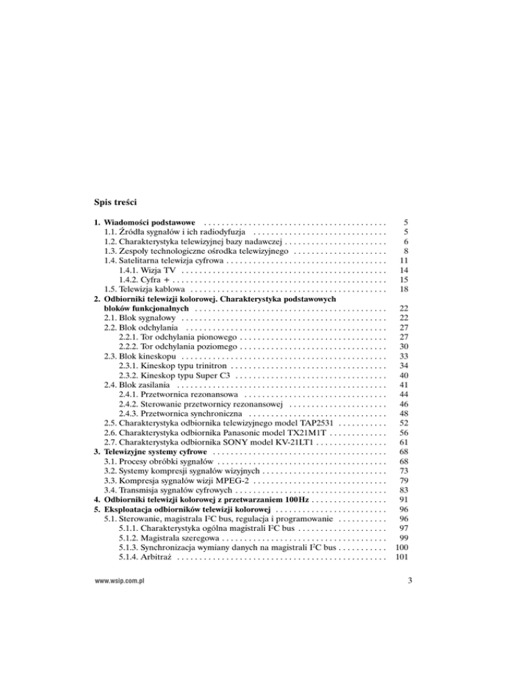 Spis treÊci 1. WiadomoÊci podstawowe . . . . . . . . . . . . . . . . . . . . . . . . . . . . . . . . . . . . . . . . . 1.1. èród∏a sygna∏ów i ich radiodyfuzja . . . . . . . . . . . . . . . . . . . . . . . . . . . . . . 1.2. Charakterystyka telewizyjnej bazy nadawczej . . . . . . . . . . . . . . . . . . . . . . . 1.3. Zespo∏y technologiczne oÊrodka telewizyjnego . . . . . . . . . . . . . . . . . . . . . 1.4. Satelitarna telewizja cyfrowa . . . . . . . . . . . . . . . . . . . . . . . . . . . . . . . . . . . . 1.4.1. Wizja TV . . . . . . . . . . . . . . . . . . . . . . . . . . . . . . . . . . . . . . . . . . . . . . 1.4.2. Cyfra + . . . . . . . . . . . . . . . . . . . . . . . . . . . . . . . . . . . . . . . . . . . . . . . . 1.5. Telewizja kablowa . . . . . . . . . . . . . . . . . . . . . . . . . . . . . . . . . . . . . . . . . . . . 2. Odbiorniki telewizji kolorowej. Charakterystyka podstawowych bloków funkcjonalnych . . . . . . . . . . . . . . . . . . . . . . . . . . . . . . . . . . . . . . . . . . . 2.1. Blok sygna∏owy . . . . . . . . . . . . . . . . . . . . . . . . . . . . . . . . . . . . . . . . . . . . . . 2.2. Blok odchylania . . . . . . . . . . . . . . . . . . . . . . . . . . . . . . . . . . . . . . . . . . . . . 2.2.1. Tor odchylania pionowego . . . . . . . . . . . . . . . . . . . . . . . . . . . . . . . . . 2.2.2. Tor odchylania poziomego . . . . . . . . . . . . . . . . . . . . . . . . . . . . . . . . . 2.3. Blok kineskopu . . . . . . . . . . . . . . . . . . . . . . . . . . . . . . . . . . . . . . . . . . . . . . 2.3.1. Kineskop typu trinitron . . . . . . . . . . . . . . . . . . . . . . . . . . . . . . . . . . . 2.3.2. Kineskop typu Super C3 . . . . . . . . . . . . . . . . . . . . . . . . . . . . . . . . . . 2.4. Blok zasilania . . . . . . . . . . . . . . . . . . . . . . . . . . . . . . . . . . . . . . . . . . . . . . . 2.4.1. Przetwornica rezonansowa . . . . . . . . . . . . . . . . . . . . . . . . . . . . . . . . 2.4.2. Sterowanie przetwornicy rezonansowej . . . . . . . . . . . . . . . . . . . . . . 2.4.3. Przetwornica synchroniczna . . . . . . . . . . . . . . . . . . . . . . . . . . . . . . . 2.5. Charakterystyka odbiornika telewizyjnego model TAP2531 . . . . . . . . . . . 2.6. Charakterystyka odbiornika Panasonic model TX21M1T . . . . . . . . . . . . . 2.7. Charakterystyka odbiornika SONY model KV-21LT1 . . . . . . . . . . . . . . . . 3. Telewizyjne systemy cyfrowe . . . . . . . . . . . . . . . . . . . . . . . . . . . . . . . . . . . . . . . 3.1. Procesy obróbki sygna∏ów . . . . . . . . . . . . . . . . . . . . . . . . . . . . . . . . . . . . . . 3.2. Systemy kompresji sygna∏ów wizyjnych . . . . . . . . . . . . . . . . . . . . . . . . . . . . 3.3. Kompresja sygna∏ów wizji MPEG-2 . . . . . . . . . . . . . . . . . . . . . . . . . . . . . . 3.4. Transmisja sygna∏ów cyfrowych . . . . . . . . . . . . . . . . . . . . . . . . . . . . . . . . . . 4. Odbiorniki telewizji kolorowej z przetwarzaniem 100Hz . . . . . . . . . . . . . . . . . 5. Eksploatacja odbiorników telewizji kolorowej . . . . . . . . . . . . . . . . . . . . . . . . . 5.1. Sterowanie, magistrala I2C bus, regulacja i programowanie . . . . . . . . . . . 5.1.1. Charakterystyka ogólna magistrali I2C bus . . . . . . . . . . . . . . . . . . . . 5.1.2. Magistrala szeregowa . . . . . . . . . . . . . . . . . . . . . . . . . . . . . . . . . . . . . 5.1.3. Synchronizacja wymiany danych na magistrali I2C bus . . . . . . . . . . . 5.1.4. Arbitra˝ . . . . . . . . . . . . . . . . . . . . . . . . . . . . . . . . . . . . . . . . . . . . . . . www.wsip.com.pl 5 5 6 8 11 14 15 18 22 22 27 27 30 33 34 40 41 44 46 48 52 56 61 68 68 73 79 83 91 96 96 97 99 100 101 3 5.1.5. Przebieg transmisji . . . . . . . . . . . . . . . . . . . . . . . . . . . . . . . . . . . . . . 5.1.6. Adresowanie urzàdzeƒ . . . . . . . . . . . . . . . . . . . . . . . . . . . . . . . . . . . . 5.1.7. Regulacja i programowanie . . . . . . . . . . . . . . . . . . . . . . . . . . . . . . . . 5.2. Wspó∏praca z innymi urzàdzeniami . . . . . . . . . . . . . . . . . . . . . . . . . . . . . . 5.3. Serwis naprawczy . . . . . . . . . . . . . . . . . . . . . . . . . . . . . . . . . . . . . . . . . . . . . 5.3.1. Lokalizacja uszkodzeƒ . . . . . . . . . . . . . . . . . . . . . . . . . . . . . . . . . . . . 5.3.2. Metody napraw . . . . . . . . . . . . . . . . . . . . . . . . . . . . . . . . . . . . . . . . . 5.3.3. Regulacja w trybie serwisowym . . . . . . . . . . . . . . . . . . . . . . . . . . . . . 5.3.4. Ocena jakoÊci odbioru . . . . . . . . . . . . . . . . . . . . . . . . . . . . . . . . . . . . 6. Nowoczesne metody rejestracji obrazu . . . . . . . . . . . . . . . . . . . . . . . . . . . . . . . 6.1. Charakterystyka metod elektronicznych . . . . . . . . . . . . . . . . . . . . . . . . . . . 6.2. Zastosowanie laserów . . . . . . . . . . . . . . . . . . . . . . . . . . . . . . . . . . . . . . . . . 6.3. Rejestracja sygna∏ów w systemie D-9 . . . . . . . . . . . . . . . . . . . . . . . . . . . . . 7. Przeglàd rozwiàzaƒ magnetowidów domowych . . . . . . . . . . . . . . . . . . . . . . . . . 7.1. Magnetowidy analogowe . . . . . . . . . . . . . . . . . . . . . . . . . . . . . . . . . . . . . . . 7.2. Porównanie parametrów u˝ytkowych . . . . . . . . . . . . . . . . . . . . . . . . . . . . . 8. Videokamery amatorskie i profesjonalne . . . . . . . . . . . . . . . . . . . . . . . . . . . . . 8.1. WiadomoÊci ogólne . . . . . . . . . . . . . . . . . . . . . . . . . . . . . . . . . . . . . . . . . . . 8.2. Videokamery systemu Video 8 . . . . . . . . . . . . . . . . . . . . . . . . . . . . . . . . . . 8.3. Budowa videokamery amatorskiej . . . . . . . . . . . . . . . . . . . . . . . . . . . . . . . 8.4. Budowa videokamery profesjonalnej . . . . . . . . . . . . . . . . . . . . . . . . . . . . . 8.5. Elektroniczne aparaty fotograficzne . . . . . . . . . . . . . . . . . . . . . . . . . . . . . . 9. Systemy projekcji obrazu . . . . . . . . . . . . . 