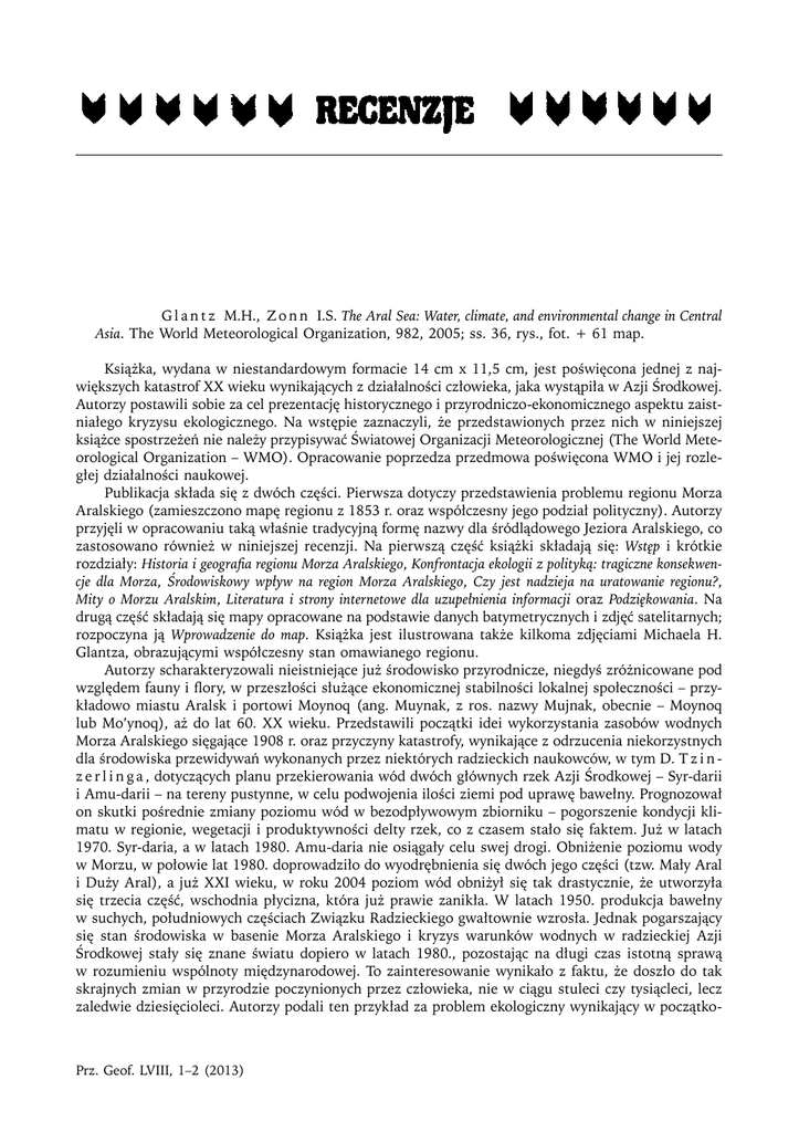 G l a n t z M.H., Z o n n I.S. The Aral Sea: Water, climate, and environmental change in Central Asia. The World Meteorological Organization, 982, 2005; ss. 36, rys., fot. + 61 map. Książka, wydana w niestandardowym formacie 14 cm x 11,5 cm, jest poświęcona jednej z największych katastrof XX wieku wynikających z działalności człowieka, jaka wystąpiła w Azji Środkowej. Autorzy postawili sobie za cel prezentację historycznego i przyrodniczo-ekonomicznego aspektu zaistniałego kryzysu ekologicznego. Na wstępie zaznaczyli, że przedstawionych przez nich w niniejszej książce spostrzeżeń nie należy przypisywać Światowej Organizacji Meteorologicznej (The World Meteorological Organization – WMO). Opracowanie poprzedza przedmowa poświęcona WMO i jej rozległej działalności naukowej. Publikacja składa się z dwóch części. Pierwsza dotyczy przedstawienia problemu regionu Morza Aralskiego (zamieszczono mapę regionu z 1853 r. oraz współczesny jego podział polityczny). Autorzy przyjęli w opracowaniu taką właśnie tradycyjną formę nazwy dla śródlądowego Jeziora Aralskiego, co zastosowano również w niniejszej recenzji. Na pierwszą część książki składają się: Wstęp i krótkie rozdziały: Historia i geografia regionu Morza Aralskiego, Konfrontacja ekologii z polityką: tragiczne konsekwencje dla Morza, Środowiskowy wpływ na region Morza Aralskiego, Czy jest nadzieja na uratowanie regionu?, Mity o Morzu Aralskim, Literatura i strony internetowe dla uzupełnienia informacji oraz Podziękowania. Na drugą część składają się mapy opracowane na podstawie danych batymetrycznych i zdjęć satelitarnych; rozpoczyna ją Wprowadzenie do map. Książka jest ilustrowana także kilkoma zdjęciami Michaela H. Glantza, obrazującymi współczesny stan omawianego regionu. Autorzy scharakteryzowali nieistniejące już środowisko przyrodnicze, niegdyś zróżnicowane pod względem fauny i flory, w przeszłości służące ekonomicznej stabilności lokalnej społeczności – przykładowo miastu Aralsk i portowi Moynoq (ang. Muynak, z ros. nazwy Mujnak, obecnie – Moynoq lub Mo’ynoq), aż do lat 60. XX wieku. Przedstawili początki idei wykorzystania zasobów wodnych Morza Aralskiego sięgające 1908 r. oraz przyczyny katastrofy, wynikające z odrzucenia niekorzystnych dla środowiska przewidywań wykonanych przez niektórych radzieckich naukowców, w tym D. T z i n z e r l i n g a , dotyczących planu przekierowania wód dwóch głównych rzek Azji Środkowej – Syr-darii i Amu-darii – na tereny pustynne, w celu podwojenia ilości ziemi pod uprawę bawełny. Prognozował on skutki pośrednie zmiany poziomu wód w bezodpływowym zbiorniku – pogorszenie kondycji klimatu w regionie, wegetacji i produktywności delty rzek, co z czasem stało się faktem. Już w latach 1970. Syr-daria, a w latach 1980. Amu-daria nie osiągały celu swej drogi. Obniżenie poziomu wody w Morzu, w połowie lat 1980. doprowadziło do wyodrębnienia się dwóch jego części (tzw. Mały Aral i Duży Aral), a już XXI wieku, w roku 2004 poziom wód obniżył się tak drastycznie, że utworzyła się trzecia część, wschodnia płycizna, która już prawie zanikła. W latach 1950. produkcja bawełny w suchych, południowych częściach Związku Radzieckiego gwałtownie wzrosła. Jednak pogarszający się stan środowiska w basenie Morza Aralskiego i kryzys warunków wodnych w radzieckiej Azji Środkowej stały się znane światu dopiero w latach 1980., pozostając na długi czas istotną sprawą w rozumieniu wspólnoty międzynarodowej. To zainteresowanie wynikało z faktu, że doszło do tak skrajnych zmian w przyrodzie poczynionych przez człowieka, nie w ciągu stuleci czy tysiącleci, lecz zaledwie dziesięcioleci. Autorzy podali ten przykład za problem ekologiczny wynikający w początko- Prz. Geof. LVIII, 1–2 (2013) 120 Recenzje wej fazie z politycznych i ekonomicznych decyzji, przedkładających ludzkie cele i działania nad pozorne ograniczenia narzucone im przez środowisko przyrodnicze. Historię basenu Morza Aralskiego wiążą z innymi współczesnymi, nierozwiązanymi wciąż problemami na świecie, tzn. deforestacją, zanieczyszczeniem wody i powietrza, czy też „globalnym ociepleniem”. Zauważyli, że współcześnie większość rządów ma trudności w podejmowaniu działań w walce z tymi powolnymi zmianami w środowisku, ponieważ ich uwagę skupiają w pierwszej kolejności pilne problemy społeczno-ekonomiczne i polityczne, konkurujące z rozciągniętymi w czasie zmianami w środowisku. Według autorów, złożoność problemu aralskiego wynika po części ze zmiany granic politycznych w regionie – dziś na stan środowiska ma wpływ kilka niezależnych republik. Na to nakłada się wieloletni brak zainteresowania Afganistanu środowiskiem przyrodniczym, na którego terytorium Amu-daria zajmuje relatywnie dużą część basenu, oraz brak bezpośredniej pomocy ze strony Federacji Rosyjskiej w rozwiązaniu problemu środowiskowego w jej byłych republikach. Powrót do normalnego stanu utrudnia również wzrost zapotrzebowania na wodę na całej długości rzek wraz ze rosnącą populacją i jej aktywnością. Ponadto utworzony w 1954 r. kanał Kara-kum wciąż przekierowuje w Turkmenistanie znaczące ilości wody z rzeki Amu-daria. Kolejnym istotnym aspektem podniesionym przez autorów jest wskazanie środowiskowych i ekonomicznych skutków wyschnięcia Morza Aralskiego. Do środowiskowych należą burze pyłowe oraz toksyczne burze roznoszące osady denne z zawartością pestycydów, herbicydów i nawozów stosowanych niegdyś w nadmiernych ilościach na podlegających drenażowi polach uprawy bawełny. Wywiewany dziś pył trafia do wyżej położonych terenów górskich i przyczynia się do topnienia ich lodowców. Toksyny w powietrzu i w wodzie mają negatywny wpływ na zdrowie ludności lokalnej, szczególnie w okolicach południowej granicy Mor