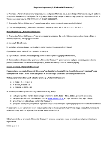 Regulamin promocji „Piekarniki Discovery” 1) Promocja „Piekarniki Discovery” organizowana jest przez Miele sp. z o. o. z siedzibą w Warszawie przy ul. Gotarda 9, wpisaną do rejestru przedsiębiorców Krajowego Rejestru Sądowego prowadzonego przez Sąd Rejonowy dla M. St. Warszawy w Warszawie, KRS 0000122417, REGON 012659244. 2) Promocja „Piekarniki Discovery” organizowana jest na terytorium Rzeczpospolitej Polskiej. 3) Czas trwania promocji „Piekarniki Discovery” obejmuje okres od 15.05.2015 – 31.12.2015 r. Warunki promocji „Piekarniki Discovery” 1) Promocja „Piekarniki Discovery” jest przeznaczona wyłącznie dla osób, które w momencie wzięcia udziału w Promocji spełniają następujące warunki: a) ukończyły 18 rok życia, b) posiadają miejsce stałego zamieszkania na terytorium Rzeczpospolitej Polskiej, c) posiadają pełną zdolność do czynności prawnych, d) zapoznały się z treścią niniejszego regulaminu i zaakceptowały jego postanowienia, 2) Dane osobowe Uczestników promocji „Piekarniki Discovery” przetwarzane będą na potrzeby prowadzenia promocji oraz innych działań marketingowych, jeśli Uczestnik wyrazi na to pisemną zgodę. Zasady promocji „Piekarniki Discovery” Przedmiotem promocji „Piekarniki Discovery” są: książka kucharska Miele „Świat kulinarnych inspiracji” oraz czarny fartuch Miele , które klient otrzymuje w prezencie po spełnieniu określonych warunków. Wykaz piekarników biorących udział w promocji „Piekarniki Discovery: 1) H 2161-1 B, H 2261-1 B 2) H 2561 B, H 2661-1 B 3) H 2561 BP, H 2661-1 BP W promocji może wziąć udział każdy klient ostateczny, który: 1) zakupi w punkcie handlu detalicznego w terminie 15.05.2015 – 31.12.2015 r. piekarnik Discovery, 2) zarejestruje piekarnik Discovery na stronie www.miele-club.pl w ciągu 30 dni od daty jego zakupu, 3) przedstawi dowód zakupu piekarnika Discovery, 4) przejdzie pozytywną weryfikację rejestrowanego urządzenia pod kątem jego poprawności oraz kompletności Po spełnieniu w. w. warunków klient otrzymuje książkę kucharską oraz fartuch Miele drogą przesyłki kurierskiej na adres wskazany podczas rejestracji na stronie www.miele-club.pl Udział uczestnika w promocji „Piekarniki Discovery” oznacza akceptację zasad promocji zawartych w niniejszym regulaminie. Miele sp. z o. o.