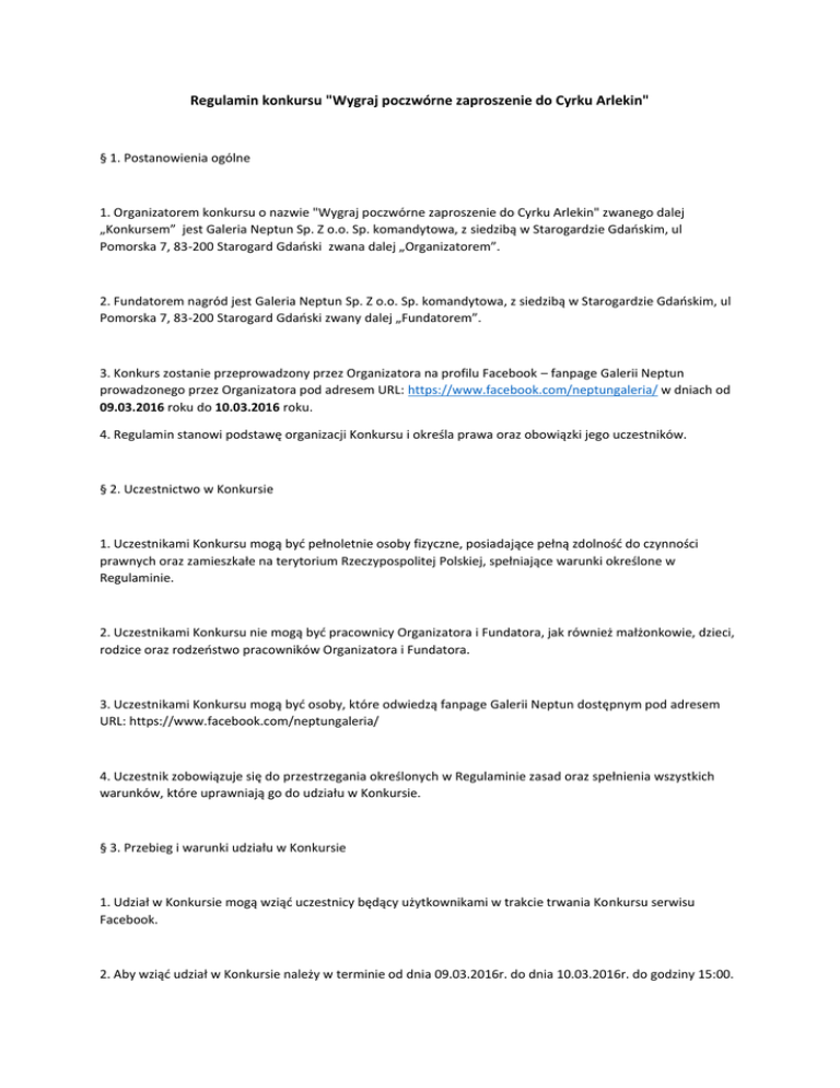 Regulamin konkursu "Wygraj poczwórne zaproszenie do Cyrku Arlekin" § 1. Postanowienia ogólne 1. Organizatorem konkursu o nazwie "Wygraj poczwórne zaproszenie do Cyrku Arlekin" zwanego dalej „Konkursem” jest Galeria Neptun Sp. Z o.o. Sp. komandytowa, z siedzibą w Starogardzie Gdańskim, ul Pomorska 7, 83-200 Starogard Gdański zwana dalej „Organizatorem”. 2. Fundatorem nagród jest Galeria Neptun Sp. Z o.o. Sp. komandytowa, z siedzibą w Starogardzie Gdańskim, ul Pomorska 7, 83-200 Starogard Gdański zwany dalej „Fundatorem”. 3. Konkurs zostanie przeprowadzony przez Organizatora na profilu Facebook – fanpage Galerii Neptun prowadzonego przez Organizatora pod adresem URL: https://www.facebook.com/neptungaleria/ w dniach od 09.03.2016 roku do 10.03.2016 roku. 4. Regulamin stanowi podstawę organizacji Konkursu i określa prawa oraz obowiązki jego uczestników. § 2. Uczestnictwo w Konkursie 1. Uczestnikami Konkursu mogą być pełnoletnie osoby fizyczne, posiadające pełną zdolność do czynności prawnych oraz zamieszkałe na terytorium Rzeczypospolitej Polskiej, spełniające warunki określone w Regulaminie. 2. Uczestnikami Konkursu nie mogą być pracownicy Organizatora i Fundatora, jak również małżonkowie, dzieci, rodzice oraz rodzeństwo pracowników Organizatora i Fundatora. 3. Uczestnikami Konkursu mogą być osoby, które odwiedzą fanpage Galerii Neptun dostępnym pod adresem URL: https://www.facebook.com/neptungaleria/ 4. Uczestnik zobowiązuje się do przestrzegania określonych w Regulaminie zasad oraz spełnienia wszystkich warunków, które uprawniają go do udziału w Konkursie. § 3. Przebieg i warunki udziału w Konkursie 1. Udział w Konkursie mogą wziąć uczestnicy będący użytkownikami w trakcie trwania Konkursu serwisu Facebook. 2. Aby wziąć udział w Konkursie należy w terminie od dnia 09.03.2016r. do dnia 10.03.2016r. do godziny 15:00. a)Pod postem konkursowym należy odpowiedzieć na pytanie: "Dlaczego to Ty powinieneś/powinnaś otrzymać zaproszenie do cyrku?” § 4. Zasady wyłaniania zwycięzców 1. Zwycięzcy Konkursu zostaną wyłonieni tylko spośród uczestników, którzy spełniają warunki wymienione w § 2 i 3 Regulaminu. 2. Wygrywa 5 osób, których komentarze Komisja Konkursowa uzna za najbardziej chwytliwe i kreatywne. 3. W skład Komisji Konkursowej wchodzą pracownicy Organizatora. 4. Organizator w dniu 10 marca 2016 r. ogłosi na fanpage-u Galerii Neptun na portalu Facebook laureatów konkursu. § 5. Nagrody 1. Nagrodą w konkursie dla za 5 pierwszych miejsc jest 5 poczwórnych zaproszeń do Cyrku Arlekin. 2. Nagroda konkursowa zostanie wydana wyłącznie w postaci określonej Regulaminem, bez możliwości wypłaty jej równowartości w gotówce lub zamiany na inną nagrodę rzeczową. 3. Nagrody można odebrać , w godz. od 10:00 do 17:00, w sekretariacie Biura Zarządu Galerii Neptun, ul. Pomorska 7, 83-200 Starogard Gdański w ciągu 24 godzin od chwili ogłoszenia laureatów konkursu. § 6. Postanowienia końcowe 1. Udział w konkursie jest jednocześnie akceptacją warunków zawartych w Regulaminie.