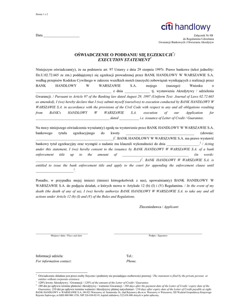 Strona 1 z 2 Data ____________________ Załącznik Nr 8B do Regulaminu Udzielania Gwarancji Bankowych i Otwierania Akredytyw OŚWIADCZENIE O PODDANIU SIĘ EGZEKUCJI*/ EXECUTION STATEMENT* Niniejszym oświadczam(y), że na podstawie art. 97 Ustawy z dnia 29 sierpnia 1997r. Prawo bankowe (tekst jednolity: Dz.U.02.72.665 ze zm.) poddaję(emy) się egzekucji prowadzonej przez BANK HANDLOWY W WARSZAWIE S.A. według przepisów Kodeksu Cywilnego w zakresie wszelkich moich (naszych) zobowiązań wynikających z realizacji przez BANK HANDLOWY W WARSZAWIE S.A. mojego (naszego) Wniosku o __________________________________________ z dnia ______________ tj. wystawienia Akredytywy / udzielenia Gwarancji. / Pursuant to Article 97 of the Banking law dated August 29, 1997 (Uniform Text: Journal of Laws 02.72.665 as amended), I (we) hereby declare that I (we) submit myself (ourselves) to execution conducted by BANK HANDLOWY W WARSZAWIE S.A. in accordance with the provisions of the Civil Code with respect to any and all obligations resulting from BANK's HANDLOWY W WARSZAWIE S.A. execution of our Application for _________________________________________ dated ___________ i.e. issuance of Letter of Credit / Guarantee. Na mocy niniejszego oświadczenia wyrażam(y) zgodę na wystawienie przez BANK HANDLOWY W WARSZAWIE S.A. bankowego tytułu egzekucyjnego do kwoty ______________________________________ (słownie: 1 ___________________________________________) . BANK HANDLOWY W WARSZAWIE S.A. ma prawo wystawić bankowy tytuł egzekucyjny oraz wystąpić o nadanie mu klauzuli wykonalności do dnia __________________.2 / Acting under this statement, I (we) hereby consent to the issuance by BANK HANDLOWY W WARSZAWIE S.A. of a bank enforcement title up to the amount of _____________________________________ (in words: 1 __________________________________________________________) . BANK HANDLOWY W WARSZAWIE S.A. is entitled to issue the bank enforcement title and apply to the court for appending the enforcement clause until _____________________2. Ponadto, w przypadku mojej śmierci (śmierci któregokolwiek z nas), upoważniam(y) BANK HANDLOWY W WARSZAWIE S.A. do podjęcia działań, o których mowa w Artykule 12 (b) (I) i (V) Regulaminu. / In the event of my death (the death of any of us), I (we) hereby authorize BANK HANDLOWY W WARSZAWIE S.A. to take any and all actions under Article 12 (b) (I) and (V) of the Rules and Regulations. Zleceniodawca / Applicant: _____________________________ _________________________________________________ Miejsce i data / Place and date Informacji udziela: For information contact: * 1 2 Podpis / Signature Tel.: Phone. Oświadczenie składane jest przez osoby fizyczne i podmioty nie posiadające osobowości prawnej / The statement is filed by the private persons or entities without corporate existence. 120% kwoty Akredytywy / Gwarancji / 120% of the amount of the Letter of Credit / Guarantee. 180 dni po upływie terminu płatności Akredytywy / ważności Gwarancji / 180 days after the payment date of the Letter of Credit / expiry date of the Guarantee, 210 dni po upływie terminu ważności Akredytywy płatnej natychmiast / 210 days after expiry date of the Letter of Credit payable at sight. BANK HANDLOWY w WARSZAWIE S.A.; 00-923 Warszawa; ul. Senatorska 16; ;Sąd Rejonowy dla m.st. Warszawy w Warszawie, XII Wydział Gospodarczy Krajowego Rejestru Sądowego, nr KRS 000 000 1538; NIP 526-030-02-91; kapitał zakładowy 522.638.400 złotych w pełni opłacony. Strona 2 z 2 Oświadczam, że pomiędzy mną a moim małżonkiem panuje rozdzielność majątkowa na podstawie:3 / I hereby represent that me and my spouse have separate property under:3 umowy z dnia ____________ zawartej z zachowaniem formy aktu notarialnego / agreement dated ____________ made in the form of a notarial deed; prawomocnego orzeczenia sądu z dnia _____________ / final and binding court decision dated _________________; Oświadczam, że nie pozostaję w związku małżeńskim / I hereby represent that I am not married. _______________________________ _______________________________________________ Miejsce i data/ Place and date Podpis Zleceniodawcy / Applicant’s signature OŚWIADCZENIE MAŁŻONKA4 / SPOUSE’S REPRESENTATION4 Niniejszym oświadczam, że wyrażam zgodę na zaciągnięcie przez mojego małżonka zobowiązań wobec BANKU HANDLOWEGO W WARSZAWIE S.A. z tytułu realizacji powyższego Wniosku / I hereby represent that I consent to my spouse incurring liabilities towards BANK HANDLOWY W WARSZAWIE S.A. as a result of the execution of the above Application. ________________________________________________________ Podpis małżonka Zleceniodawcy / Signature of the Applicant’s spouse Oświadczam, że pomiędzy mną a moim małżonkiem panuje rozdzielność majątkowa na podstawie:3 / I hereby represent that me and my spouse have separate property under:3 umowy z dnia ____________ zawartej z zachowaniem formy aktu notarialnego / agreement dated ____________ made in the form of a notarial deed; prawomocnego orzeczenia sądu z dnia _____________ / final and binding court decision dated _________________; Oświadczam, że nie pozostaję w związku małżeńskim / I hereby represent that I am not married. _______________________________ _______________________________________________ Miejsce i data/ Place and date Podpis Zleceniodawcy / Applicant’s signature OŚWIADCZENIE MAŁŻONKA4 / SPOUSE’S REPRESENTATION4 Niniejszym oświadczam, że wyrażam zgodę na zaciągnięcie przez mojego małżonka zobowiązań wobec BANKU HANDLOWEGO W WARSZAWIE S.A. z tytułu realizacji powyższego Wniosku / I hereby represent that I consent to my spouse incurring liabilities towards BANK HANDLOWY W WARSZAWIE S.A. as a result of the execution of the above Application. _________________________________________________________ Podpis małżonka Zleceniodawcy / Signature of the Applicant’s spouse Oświadczam, że pomiędzy mną 
