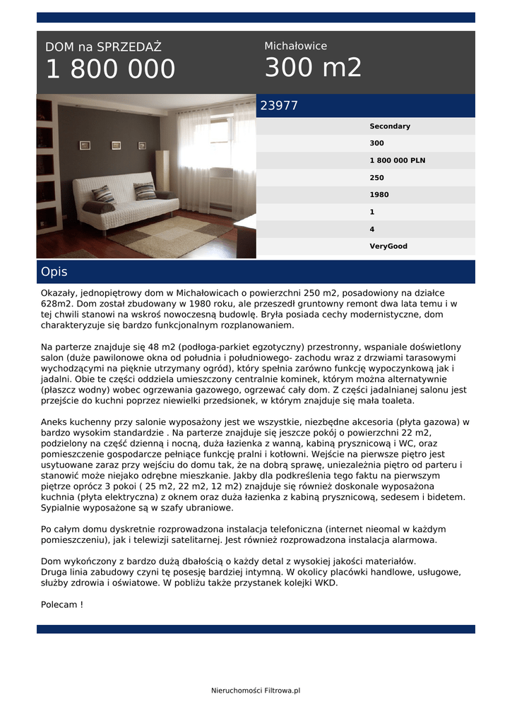 DOM na SPRZEDAŻ 1 800 000 Michałowice 300 m2 23977 Secondary 300 1 800 000 PLN 250 1980 1 4 VeryGood Opis Okazały, jednopiętrowy dom w Michałowicach o powierzchni 250 m2, posadowiony na działce 628m2. Dom został zbudowany w 1980 roku, ale przeszedł gruntowny remont dwa lata temu i w tej chwili stanowi na wskroś nowoczesną budowlę. Bryła posiada cechy modernistyczne, dom charakteryzuje się bardzo funkcjonalnym rozplanowaniem. Na parterze znajduje się 48 m2 (podłoga-parkiet egzotyczny) przestronny, wspaniale doświetlony salon (duże pawilonowe okna od południa i południowego- zachodu wraz z drzwiami tarasowymi wychodzącymi na pięknie utrzymany ogród), który spełnia zarówno funkcję wypoczynkową jak i jadalni. Obie te części oddziela umieszczony centralnie kominek, którym można alternatywnie (płaszcz wodny) wobec ogrzewania gazowego, ogrzewać cały dom. Z części jadalnianej salonu jest przejście do kuchni poprzez niewielki przedsionek, w którym znajduje się mała toaleta. Aneks kuchenny przy salonie wyposażony jest we wszystkie, niezbędne akcesoria (płyta gazowa) w bardzo wysokim standardzie . Na parterze znajduje się jeszcze pokój o powierzchni 22 m2, podzielony na część dzienną i nocną, duża łazienka z wanną, kabiną prysznicową i WC, oraz pomieszczenie gospodarcze pełniące funkcję pralni i kotłowni. Wejście na pierwsze piętro jest usytuowane zaraz przy wejściu do domu tak, że na dobrą sprawę, uniezależnia piętro od parteru i stanowić może niejako odrębne mieszkanie. Jakby dla podkreślenia tego faktu na pierwszym piętrze oprócz 3 pokoi ( 25 m2, 22 m2, 12 m2) znajduje się również doskonale wyposażona kuchnia (płyta elektryczna) z oknem oraz duża łazienka z kabiną prysznicową, sedesem i bidetem. Sypialnie wyposażone są w szafy ubraniowe. Po całym domu dyskretnie rozprowadzona instalacja telefoniczna (internet nieomal w każdym pomieszczeniu), jak i telewizji satelitarnej. Jest również rozprowadzona instalacja alarmowa. Dom wykończony z bardzo dużą dbałością o każdy detal z wysokiej jakości materiałów. Druga linia zabudowy czyni tę posesję bardziej intymną. W okolicy placówki handlowe, usługowe, służby zdrowia i oświatowe. W pobliżu także przystanek kolejki WKD. Polecam ! Nieruchomości Filtrowa.pl Nieruchomości Filtrowa.pl tel. 602 109 102 email: [email protected] Nieruchomości Filtrowa.pl Powered by TCPDF (www.tcpdf.org)