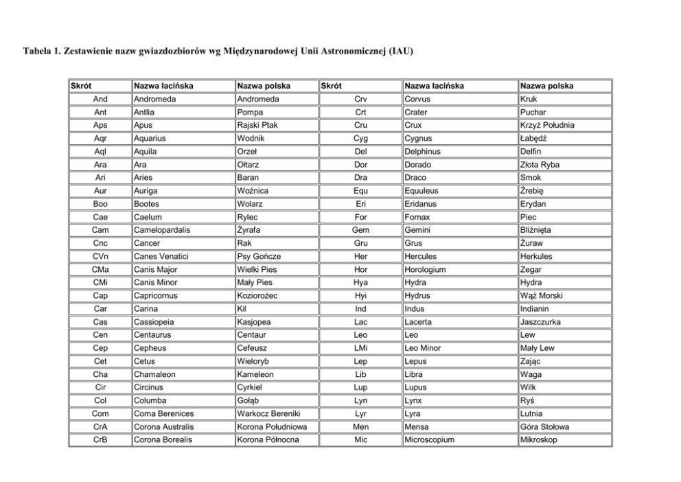 Tabela 1. Zestawienie nazw gwiazdozbiorów wg Międzynarodowej