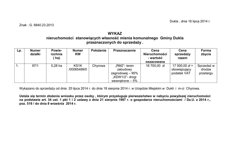 Dukla , dnia 16 lipca 2014 r. Znak : G. 6840.23.2013 WYKAZ nieruchomości stanowiących własność mienia komunalnego Gminy Dukla przeznaczonych do sprzedaży . Lp. 1. Numer działki Powierzchnia ( ha) Numer KW Położenie Przeznaczenie 97/1 0,28 ha KS1K /00065499/0 Chyrowa „RM2”- teren zabudowy zagrodowej – 95% „KDW1/2”- drogi wewnętrzne – 5% Cena Nieruchomości - wartość oszacowana 16 700,00 zł Cena sprzedaży razem Forma zbycia 17 000,00 zł + obowiązujący podatek VAT Sprzedaż w drodze przetargu Wykazano do sprzedaży od dnia 25 lipca 2014 r. do dnia 18 sierpnia 2014 r. w Urzędzie Miejskim w Dukli i m-ci Chyrowa. Ustala się termin złożenia wniosku przez osoby , którym przysługuje pierwszeństwo w nabyciu powyższej nieruchomości na podstawie art. 34 ust. 1 pkt 1 i 2 ustawy z dnia 21 sierpnia 1997 r. o gospodarce nieruchomościami / Dz.U. z 2014 r., poz. 518 / do dnia 8 września 2014 r.