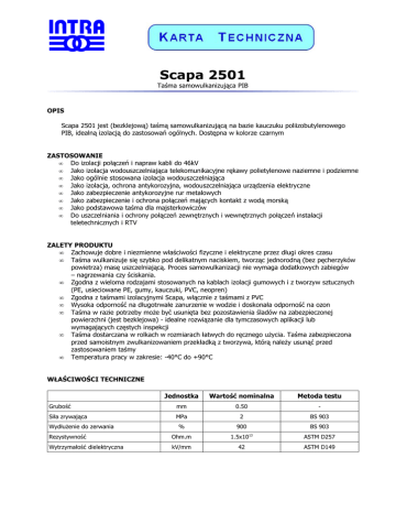 Scapa 2501 Taśma samowulkanizująca PIB OPIS Scapa 2501 jest (bezklejową) taśmą samowulkanizującą na bazie kauczuku poliizobutylenowego PIB, idealną izolacją do zastosowań ogólnych. Dostępna w kolorze czarnym ZASTOSOWANIE • Do izolacji połączeń i napraw kabli do 46kV • Jako izolacja wodouszczelniająca telekomunikacyjne rękawy polietylenowe naziemne i podziemne • Jako ogólnie stosowana izolacja wodouszczelniająca • Jako izolacja, ochrona antykorozyjna, wodouszczelniająca urządzenia elektryczne • Jako zabezpieczenie antykorozyjne rur metalowych • Jako zabezpieczenie i ochrona połączeń mających kontakt z wodą morską • Jako podstawowa taśma dla majsterkowiczów • Do uszczelniania i ochrony połączeń zewnętrznych i wewnętrznych połączeń instalacji teletechnicznych i RTV ZALETY PRODUKTU • Zachowuje dobre i niezmienne właściwości fizyczne i elektryczne przez długi okres czasu • Taśma wulkanizuje się szybko pod delikatnym naciskiem, tworząc jednorodną (bez pęcherzyków powietrza) masę uszczelniającą. Proces samowulkanizacji nie wymaga dodatkowych zabiegów – nagrzewania czy ściskania. • Zgodna z wieloma rodzajami stosowanych na kablach izolacji gumowych i z tworzyw sztucznych (PE, usieciowane PE, gumy, kauczuki, PVC, neopren) • Zgodna z taśmami izolacyjnymi Scapa, włącznie z taśmami z PVC • Wysoka odporność na długotrwałe zanurzenie w wodzie i doskonała odporność na ozon • Taśma w razie potrzeby może być usunięta bez pozostawienia śladów na zabezpieczonej powierzchni (jest bezklejowa) - idealne rozwiązanie dla tymczasowych aplikacji lub wymagających częstych inspekcji • Taśma dostarczana w rolkach w rozmiarach łatwych do ręcznego użycia. Taśma zabezpieczona przed samoistnym zwulkanizowaniem przekładką z tworzywa, którą należy usunąć przed zastosowaniem taśmy • Temperatura pracy w zakresie: -40°C do +90°C WŁAŚCIWOŚCI TECHNICZNE Jednostka Wartość nominalna Metoda testu Grubość mm 0.50 - Siła zrywająca MPa 2 BS 903 % 900 Wydłużenie do zerwania Rezystywność Ohm.m Wytrzymałość dielektryczna kV/mm 1.5x10 42 BS 903 13 ASTM D257 ASTM D149 STANDARDOWE ROZMIARY • • • • • Długość rolki: 3m, 5m, 10m Szerokość rolki: 19mm, 25mm, 38mm, 50mm Rdzeń: 38mm (z tworzywa) Oznakowanie: Scapa lub neutralne Pakowanie: foliowane rolki z etykietą lub luzem w kartonach ZASADY MAGAZYNOWANIA Należy unikać kontaktu rolek swymi krawędziami, jeśli rolki nie są zafoliowane. Rolki taśmy powinny być przechowywane w pozycji leżącej prostopadłej do krawędzi cięcia w oryginalnych opakowaniach. Rolki muszą być zabezpieczone przed kurzem, wilgocią, bezpośrednim nasłonecznieniem oraz oparami rozpuszczalników Temperatura składowania powinna wynosić pomiędzy +10ºC a +25ºC.. Powierzchnia powinna być czysta, sucha oraz bez kurzu, tłuszczu, olejów i innych zanieczyszczeń. Z zachowaniem powyższych warunków taśma może być magazynowana 12 miesięcy. SPOSÓB UŻYCIA Taśmy samowulkanizujące, po uprzednim usunięciu przekładki, nawijamy pod naciągiem tak, aby taśma zwęziła się do 2/3 swojej pierwotnej szerokości oraz na zakładkę 50%. Izolowanie należy rozpocząć w odpowiednio dobranej odległości przed izolowanym miejscem (najczęściej kilka centymetrów) i w takiej samej odległości „zawrócić” za izolowanym miejscem, nakładając drugą warstwę i wracając tym samym do miejsca, z którego rozpoczęliśmy. W razie potrzeby usunięcia taśmy, delikatnie nacinamy izolację ostrym narzędziem. Powyższe dane techniczne opierają się na przeprowadzonych testach i doświadczeniach producenta, wg naszej opinii wiarygodnych i niezawodnych. Nie dają one jednak pełnej gwarancji i nie zwalniają użytkownika od przeprowadzenia prób i testów, właściwych dla konkretnego zastosowania. Uprzejmie informujemy, iż nie ponosimy odpowiedzialności za jakiekolwiek powstałe szkody czy straty, także w stosunku do osób trzecich. Autoryzowany Dystrybutor w Polsce: INTRA Sp. z o.o., ul. Wierzbowa 44, 90-133 Łódź, tel. +48 42 678 01 94, faks +48 42 678 10 09 e-mail: [email protected]