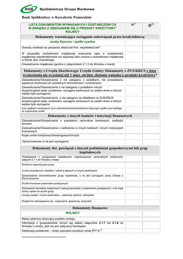 Bank Spółdzielczy w Kowalewie Pomorskim LISTA DOKUMENTÓW WYMAGANYCH I DOSTARCZONYCH 1 W ZWIĄZKU Z UBIEGANIEM SIĘ O PRODUKT KREDYTOWY ROLNICY W 1) D1) Dokumenty warunkujące zaciąganie zobowiązań przez kredytobiorcę osoby fizyczne i spółki cywilne Dowody osobiste lub paszporty właścicieli firm, współwłaścicieli* W przypadku rozdzielności majątkowej orzeczenie sądu o rozdzielności majątkowej współmałżonków lub separacji albo umowa o rozdzielności majątkowej w formie aktu notarialnego Oświadczenie majątkowe zgodnie z załącznikiem 2.1.3 do Wniosku o kredyt Dokumenty z Urzędu Skarbowego/ Urzędu Gminy/ Dokumenty z ZUS/KRUS z datą wystawienia nie wcześniej niż 1 mies. od daty złożenia wniosku o produkt kredytowy* Zaświadczenie/Oświadczenie o nie zaleganiu z podatkami, nie prowadzeniu egzekucji skarbowej lub uzyskanych odroczeniach i umorzeniach Zaświadczenie/Oświadczenie o nie zaleganiu z podatkiem rolnym (kopia/oryginał wpłat, przelewów, wyciągów bankowych za ostatni okres w którym wpłata była wymagana) Zaświadczenie/Oświadczenie o nie zaleganiu ze składkami na ZUS/KRUS (kopia/oryginał wpłat, przelewów, wyciągów bankowych za ostatni okres w którym wpłata była wymagana przy spółkach osobowych są to zaświadczenia/oświadczenia dotyczące spółki oraz każdego ze wspólników spółki Dokumenty z innych banków i instytucji finansowych Zaświadczenie/Oświadczenie o posiadaniu rachunków bankowych, wielkości obrotów Zaświadczenie/Oświadczenie o zadłużeniu w innych bankach i innych instytucjach finansowych Kopie umów kredytowych/leasingowych/innych Opinia bankowa (o ile jest wymagana) Dokumenty dot. powiązań z innymi podmiotami gospodarczymi lub grup kapitałowych Oświadczenie o powiązaniach kapitałowych, organizacyjnych, personalnych (rodzinnych), załącznik 2.1.1 do Wniosku o kredyt Struktura organizacyjna grupy Liczba posiadanych udziałów i udział w głosach w innych podmiotach Sprawozdanie skonsolidowane grupy kapitałowej, o ile jest wymagane przez Ustawę o Rachunkowości Wyniki finansowe podmiotów powiązanych Zestawienie transakcji wzajemnych (zakupy/sprzedaż) z podmiotami powiązanymi, o ile mają istotny wpływ na wyniki grupy Umowy spółek i innych podmiotów – podmioty zależne, nadrzędne Wzajemne zobowiązania (np. poręczenia. gwarancje, pożyczki) Dokumenty finansowe ROLNICY Nakaz płatniczy dotyczący podatku rolnego, Informacja o gospodarstwie rolnym wg układu załącznika 2.1.7 lub 2.1.8 do Wniosku o kredyt, jeśli nie jest załączany biznesplan Deklaracje podatkowe – działy specjalne produkcji rolnej (PIT 6) A Bank Spółdzielczy w Kowalewie Pomorskim LISTA DOKUMENTÓW WYMAGANYCH I DOSTARCZONYCH 1 W ZWIĄZKU Z UBIEGANIEM SIĘ O PRODUKT KREDYTOWY ROLNICY W 1) D1) pozostałe dokumenty bez względu na sposób prowadzenia rachunkowości W przypadku ubiegania się o kredyt z dopłatami ARiMR – zgodnie z wymogami danej linii** Dokumenty dotyczące inwestycji Pozwolenie na budowę wydane przez właściwy organ administracji terenowej lub zgłoszenie zamiaru wykonania robót budowlanych (o ile prawo budowlane niniejszych dokumentów wymaga) * Pozwolenia i uzgodnienia środowiskowe (jeżeli dotyczy) Biznesplan lub jego odpowiednik Harmonogram i kosztorys* W przypadku ubiegania się o kredyt unijny kopia wniosku o dotację wraz z załącznikami lub/i umowy o dofinansowanie Oferty zakupu lub proformy faktur potwierdzające koszty inwestycji W przypadku zakupu gruntów: Wstępna umowa kupna sprzedaży gruntów, odpisy ksiąg wieczystych na nabywane grunty, wypis z rejestru gruntów zakupywanych, zaświadczenie o rolniczym przeznaczeniu gruntów w planie zagospodarowania przestrzennego gminy. Inne *** * do wglądu lub uwiarygodnione kopie **w kolumnie W wpisać liczbę załączników przekazanych Wnioskodawcy do wypełnienia ***można dopisać dokumenty nieujęte powyżej np. specyficzne dla danej działalności klienta A W przypadku, gdy składane przez klienta zeznanie roczne nie zawiera prezentaty (adnotacja stawiana na korespondencji wpływającej do instytucji, świadcząca o przyjęciu pisma do dalszego rozpatrywania, zawiera zazwyczaj następujące informacje: nazwa instytucji, data wpływu, znak sprawy, liczba załączników oraz podpis pracownika przyjmującego korespondencję) Urzędu Skarbowego należy od klienta wziąć pisemne oświadczenie stwierdzające, że dostarczone bankowi zeznanie stanowi jego wersję ostateczną lub wymagać złożenia zeznania potwierdzonego przez Urząd Skarbowy, lub przedłożenia oryginału potwierdzenia urzędowego poświadczenia odbioru dokumentu elektronicznego (dokument wystawiony automatycznie i zarejestrowany w systemie teleinformatycznym Ministerstwa Finansów, w przypadku składania deklaracji podatkowej drogą elektroniczną). 1) należy zaznaczyć „X” w odpowiednim wierszu dokumenty wymagane i dostarczone przez klienta: W – Wymagane, D – Dostarczone Data dostarczenia kompletu dokumentów ----------------------------------------- podpis osoby sporządzającej Bank Spółdzielczy w Kowalewie Pomorskim LISTA DOKUMENTÓW WYMAGANYCH I DOSTARCZONYCH W ZWIĄZKU Z UBIEGANIEM SIĘ O PRODUKT KREDYTOWY – ZABEZPIECZENIA I. W 1) D 1) Poręczenie na zasadach ogólnych/poręczenie wekslowe/weksel własny osoby nie będącej dłużnikiem/oświadczenie patronackie Zgoda współmałżonka poręczyciela/wystawcy weksla na udzielenie poręczenia/wystawienie weksla własnego (tylko w przypadku, gdy poręczyciel/wystawca weksla jest we wspólności ustawowej ze współmałżonkiem) lub dokument o rozdzielności majątkowej Uchwała odpowiedniego organu o udzieleniu zabezpieczenia w postaci poręczenia/wystawienia weksla własnego Dokumenty formalno - prawne dotyczące poręczyciela (KRS, REGON, NIP, kopia dokumentu tożsamości - w przypadku osoby fizycznej) Oświadczenie majątkowe w przypadku osoby fizycznej innej niż rolnik – załącznik 2.1.3 do Wni
