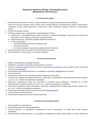 Regulamin Konkursu Wiedzy o Przedsiębiorczości „Młodzieżowy Lider Biznesu” § 1 Postanowienia ogólne 1. „Młodzieżowy Lider Biznesu” to Konkurs, mający za zadanie promocję przedsiębiorczości wśród młodzieży. Celem Konkursu jest rozwijanie wśród uczniów szkół ponadgimnazjalnych przedsiębiorczych postaw, ekonomicznych umiejętności, zasobu wiedzy teoretycznej i praktycznej, a także wzmacnianie integracji młodzieży ze środowiskiem biznesu. 2. Konkurs ma charakter cykliczny. 3. Podmioty zaangażowane w przygotowanie i przeprowadzenie Konkursu: a) Organizatorzy – Górnośląska Wyższa Szkoła Handlowa im. Wojciecha Korfantego w Katowicach oraz Żorska Izba Gospodarcza, które organizują, koordynują i nadzorują Konkurs. b) Patronat Biznesowy – Katowicka Specjalna Strefa Ekonomiczna S.A. c) Instytucje Wspierające: Członkowie Śląskiego Partnerstwa Gospodarczego. Samorządy terytorialne. Inni, którzy przystąpią do współpracy i podpiszą Umowę Partnerską. 4. Dla celów realizacji Konkursu powołana zostanie Komisja Konkursowa. 5. Konkurs składa się z trzech etapów i ma charakter regionalny. § 2 Zadania Organizatorów 1. Nadzór nad prawidłowym przebiegiem Konkursu. 2. Współpraca z pozostałymi instytucjami zaangażowanymi w Konkurs. 3. Utworzenie specjalnej zakładki Konkursu na stronie internetowej www.zorig.zory.pl oraz utworzenie strony internetowej Konkursu www.mlb.gwsh.pl 4. Przygotowanie dokumentacji konkursowej, we współpracy z instytucjami zaangażowanymi w Konkurs 5. Promocja Konkursu 6. Przygotowanie systemu informatycznego dla celów realizacji pierwszego etapu 7. Pierwszy etap: przygotowanie pytań konkursowych, organizacja i przeprowadzenie pierwszego etapu Konkursu zgodnie z § 7 pkt 1 ust. a, nadzór nad prawidłowym przebiegiem 8. Drugi etap: przygotowanie tematu oraz wytycznych do stworzenia pracy projektowej i przesłanie ich w formie elektronicznej do uczestników zgodnie z § 7 pkt 1 ust. b, nadzór nad prawidłowym przebiegiem 9. Trzeci etap: przygotowanie pytań konkursowych, organizacja i przeprowadzenie trzeciego etapu Konkursu zgodnie z § 7 pkt 1 ust. d, nadzór nad prawidłowym przebiegiem 10. Publikowanie na bieżąco informacji o Konkursie na stronie www.zorig.zory.pl 11. Upowszechnianie wyników Konkursu 12. Wyznaczenie przedstawicieli do prac Komisji Konkursowej. § 3 Zadania Instytucji Wspierających 1. Ścisła współpraca z Organizatorami. 2. Przestrzeganie zapisów niniejszego Regulaminu. 3. Promocja Konkursu, ze szczególnym uwzględnieniem obszaru terytorialnego, na którym działa dana Instytucja Wspierająca. 4. Upowszechnianie wyników Konkursu, ze szczególnym uwzględnieniem obszaru terytorialnego, na którym działa dana Instytucja Wspierająca. § 4 Komisja Konkursowa 1. Komisja Konkursowa składa się z czterech Członków (w pierwszym i drugim etapie) lub sześciu Członków (w trzecim etapie), w tym z Przewodniczącego Komisji. 2. Dwóch Członków Komisji Konkursowej, tj. Przewodniczący Komisji (Przedstawiciel Żorskiej Izby Gospodarczej) oraz jeden Przedstawiciel Górnośląskiej Wyższej Szkoły Handlowej w Katowicach biorą udział w pracach Komisji Konkursowej we wszystkich etapach. 3. Komisja Konkursowa, powołana dla przeprowadzenia etapów pierwszego i drugiego. 3.1. Skład Komisji Konkursowej dla przeprowadzenia etapów pierwszego i drugiego: a) 1 przedstawiciel Żorskiej Izby Gospodarczej – Przewodniczący Komisji Konkursowej. b) 3 przedstawicieli Górnośląskiej Wyższej Szkoły Handlowej w Katowicach. 3.2. Skład Komisji Konkursowej zostanie ustalony przez Organizatorów na co najmniej 2 tygodnie przed rozpoczęciem Konkursu w danym roku szkolnym. 3.3. Pierwsze posiedzenie Komisji Konkursowej odbywa się przed rozpoczęciem całego cyklu konkursowego. Na posiedzeniu w pierwszej kolejności zostaje przyjęty Regulamin Prac Komisji Konkursowej oraz omówiony cały cykl konkursowy. 3.4. Drugie posiedzenie Komisji Konkursowej odbywa się po zakończeniu publikacji testu stanowiącego pierwszy etap Konkursu w celu weryfikacji zgłoszeń oraz podsumowania pierwszego etapu. 3.5. Trzecie posiedzenie Komisji Konkursowej odbywa się nie później niż w terminie określonym w § 7 pkt 1 ust. c 4. Komisja Konkursowa, powołana dla przeprowadzenia trzeciego etapu. 4.1. Skład Komisji Konkursowej dla przeprowadzenia trzeciego etapu: a) 1 przedstawiciel Żorskiej Izby Gospodarczej – Przewodniczący Komisji Konkursowej b) 1 przedstawiciel Górnośląskiej Wyższej Szkoły Handlowej w Katowicach c) 1 przedstawiciel Katowickiej Specjalnej Strefy Ekonomicznej S.A. d) 3 przedstawicieli placówek oświatowych lub/i innych podmiotów działających na danych obszarach terytorialnych w zakresie kształcenia i szkolenia. 4.2. Skład Komisji Konkursowej zostanie ustalony przez Organizatorów w dniu przeprowadzenia trzeciego etapu. Spośród przedstawicieli placówek oświatowych, które reprezentowane będą przez finalistów Konkursu, w drodze losowania, wybrani zostaną 3 przedstawiciele Komisji. 4.3. Posiedzenie Komisji Konkursowej powołanej dla przeprowadzenia trzeciego etapu odbywa się w dniu trzeciego etapu w celu przeprowadzenia oraz podsumowania trzeciego etapu. § 5 Zasięg Konkursu 1. 2. Obszary terytorialne Konkursu: a) Obszar nr 1 obejmuje powiat M. Żory b) Obszar nr 2 obejmuje powiat M. Jastrzębie-Zdrój c) Obszar nr 3 obejmuje powiat raciborski d) Obszar nr 4 obejmuje powiat rybnicki i powiat M. Rybnik e) Obszar nr 5 obejmuje powiat wodzisławski Uczestnikami Konkursu mogą zostać uczniowie szkół ponadgimnazjalnych, którzy w określonym w Regulaminie trybie, dokonają swojego zgłoszenia oraz uczęszczają do szkół ponadgimnazjalnych w jednym z obszarów terytorialnych Konkursu określonych w pkt 1. 3. Uczestnicy, zgłaszając swoje uczestnictwo w Konkursie podają obszar terytorialny zgodny z obszarem terytorialnym szkoły, do której uczęszczają. § 6 Zasady konkursu 1